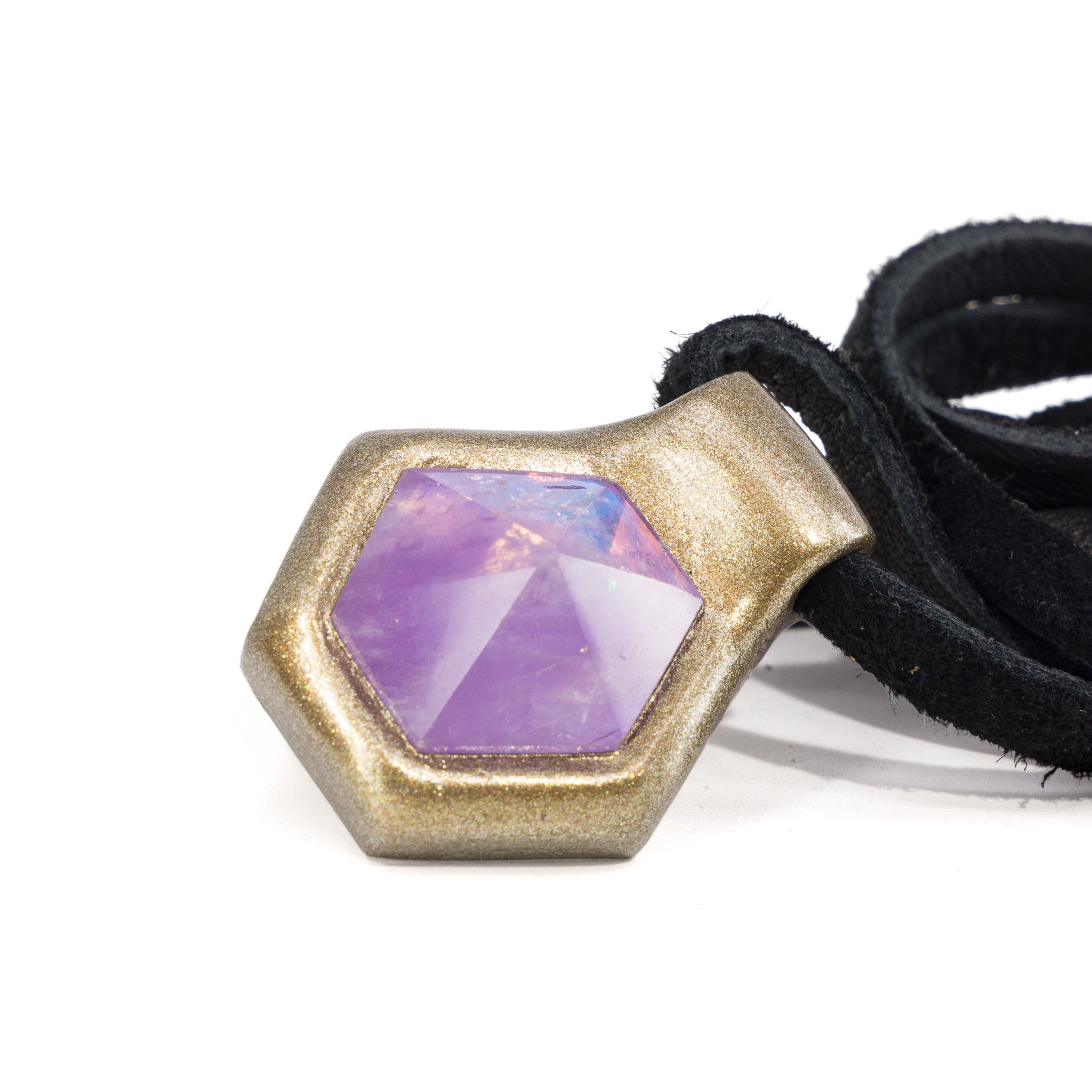 This vibrant amethyst crystal has been faceted into a charming little gemstone with great color and internal brilliance. The ring itself features a simple but ruggedly beautiful textured band with an open back setting to allow light to shine through the stone.