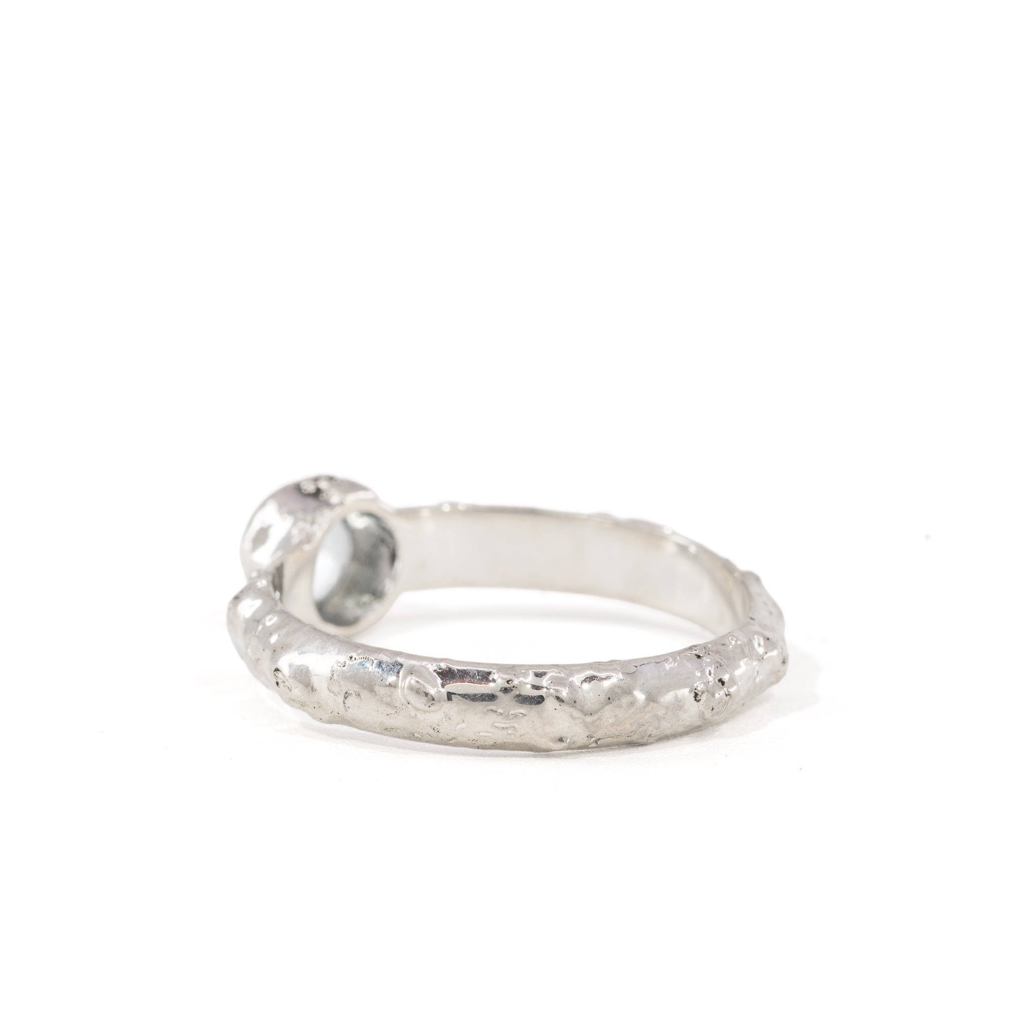 This vibrant amethyst crystal has been faceted into a charming little gemstone with great color and internal brilliance. The ring itself features a simple but ruggedly beautiful textured band with an open back setting to allow light to shine through the stone.