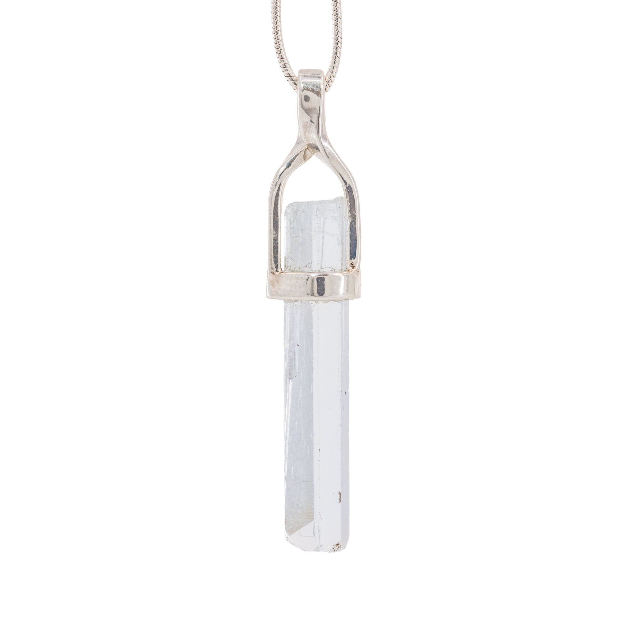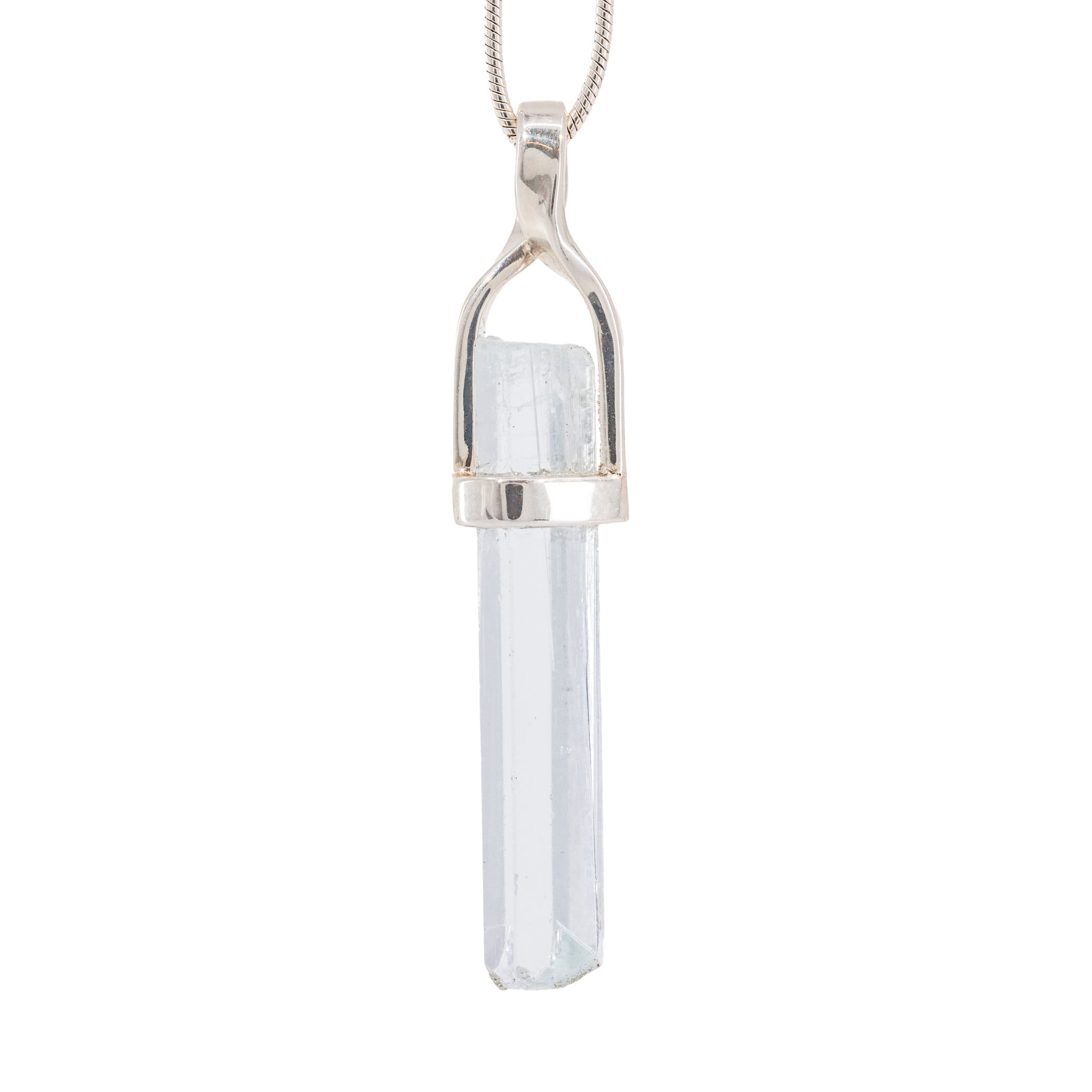 Water clear aquamarine (teehee...get it?) with a subtle blue color, mirror-bright faces, and a unique natural termination, is suspended in a custom Sterling Silver setting that's been artfully handcrafted for this specific crystal. Simply stunning!