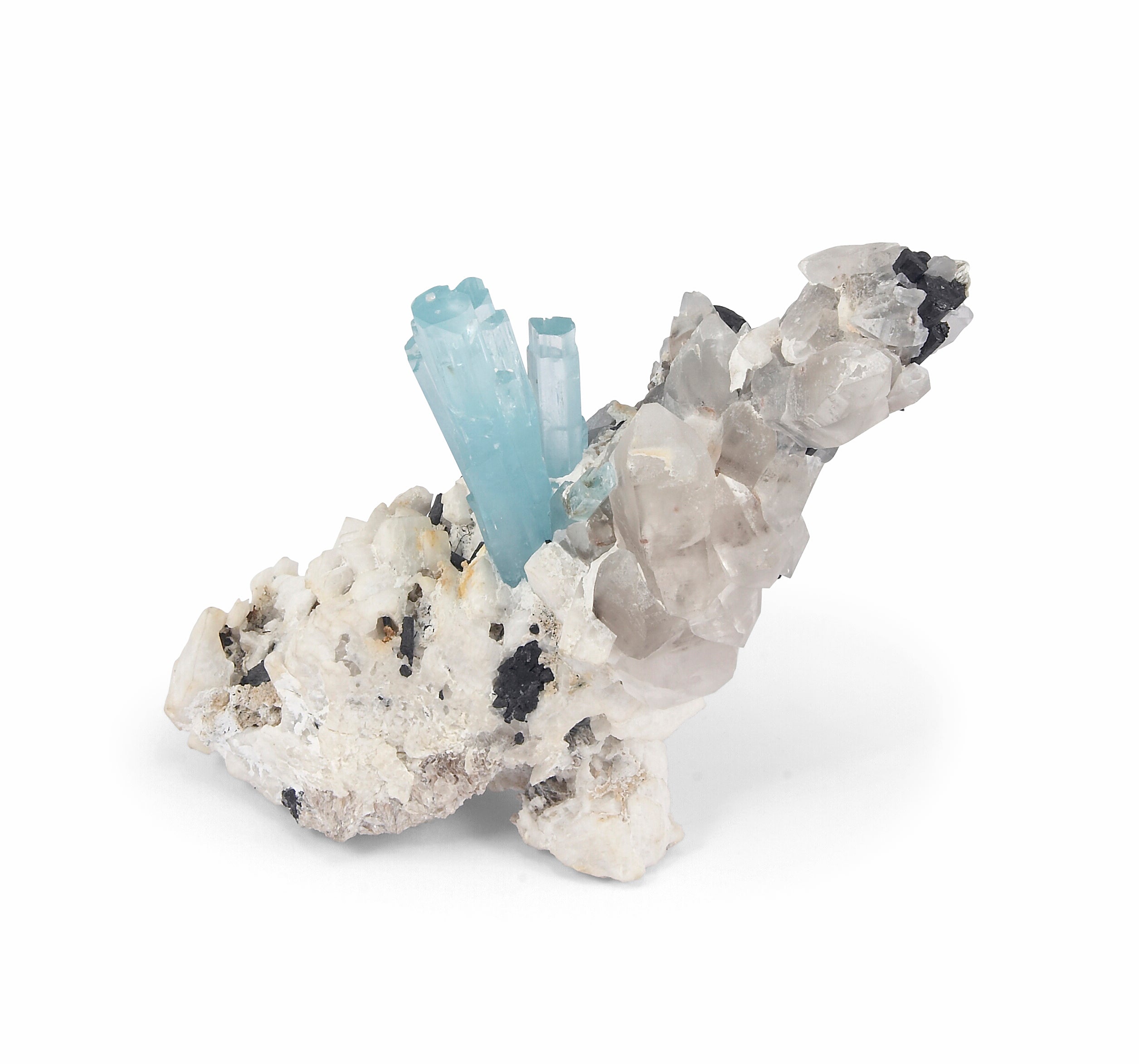 This superb Aquamarine crystal "spray" features exquisite color, large well-formed crystals and a truly remarkable overall composition, with attractive white Quartz and Black Tourmaline matrix.Origin is Pakistan.