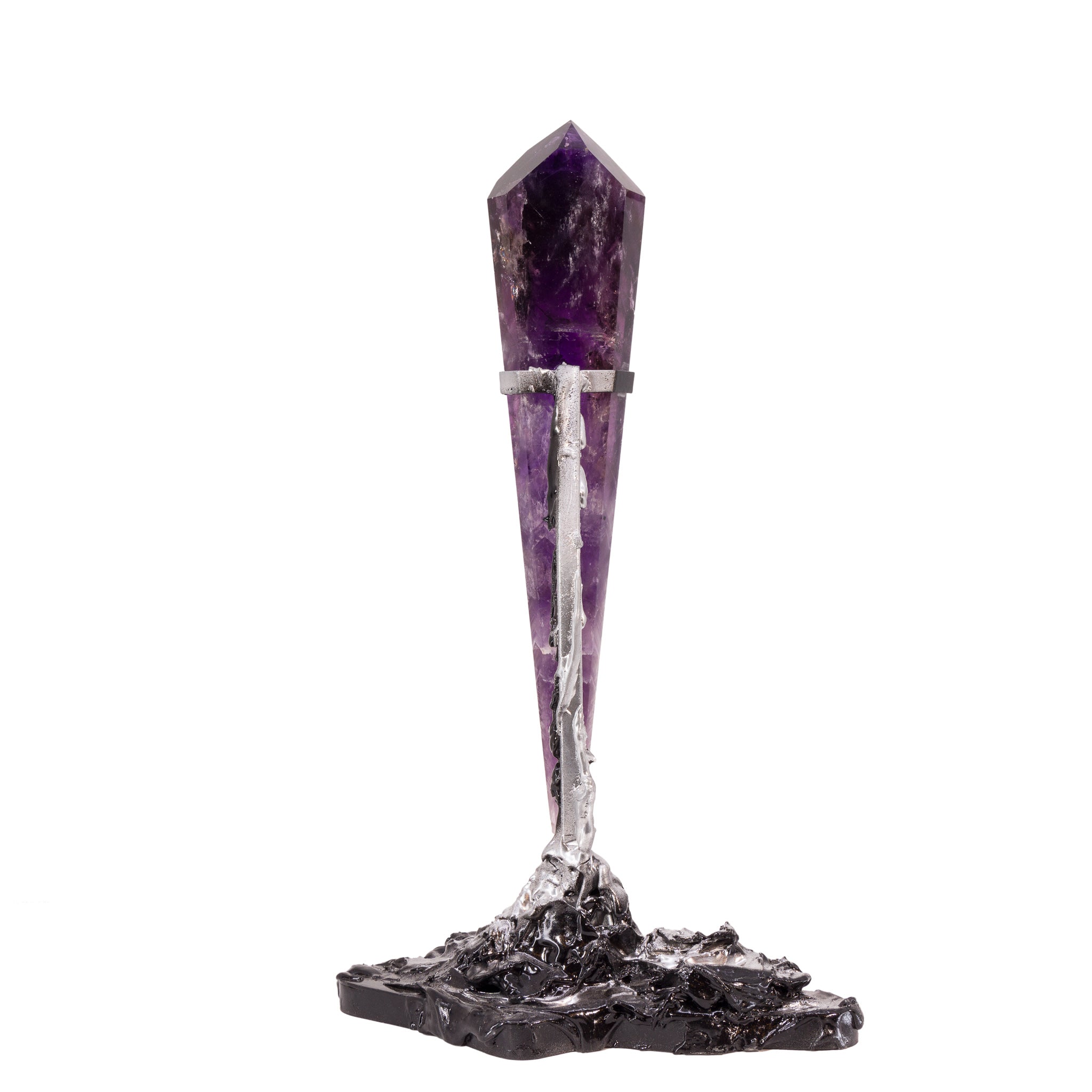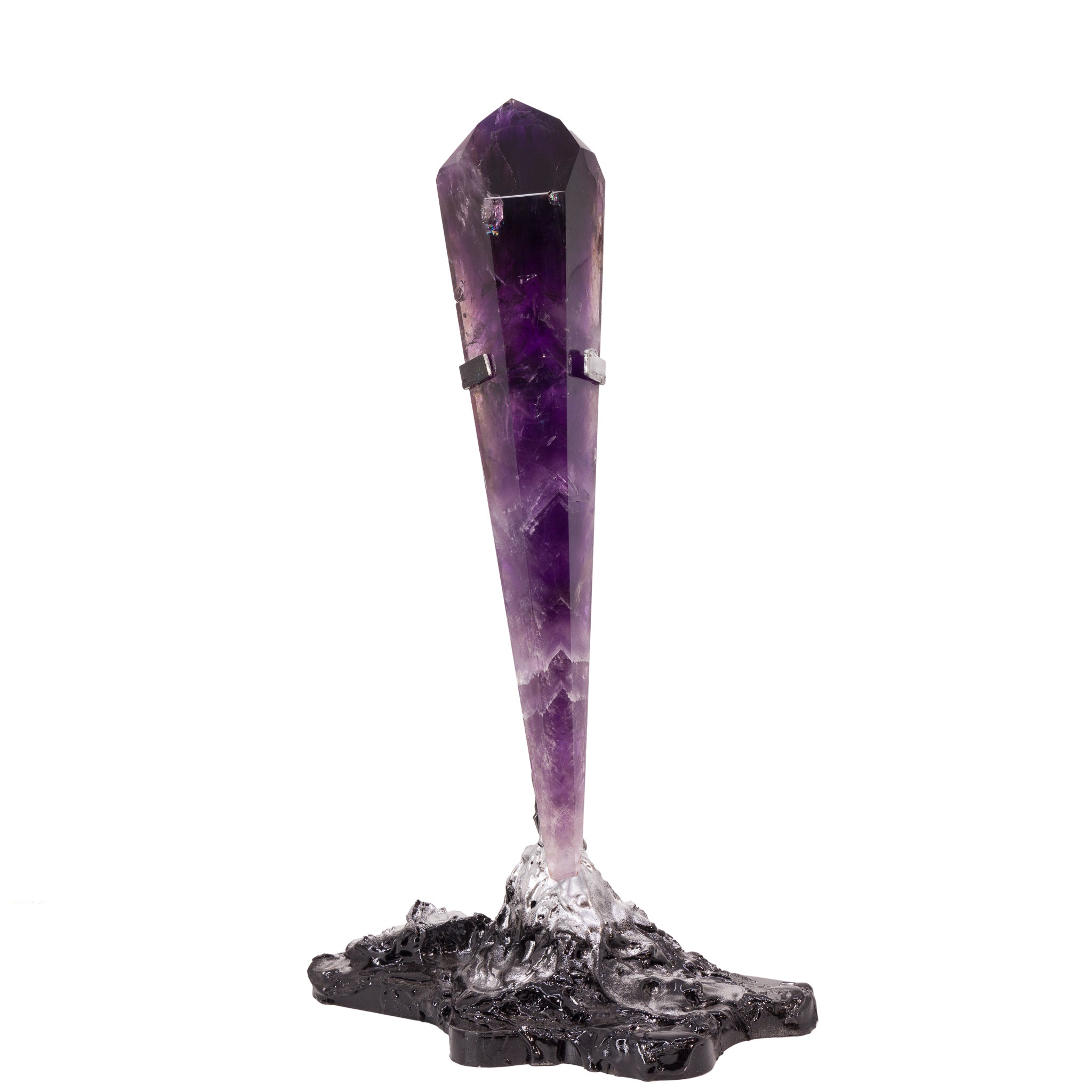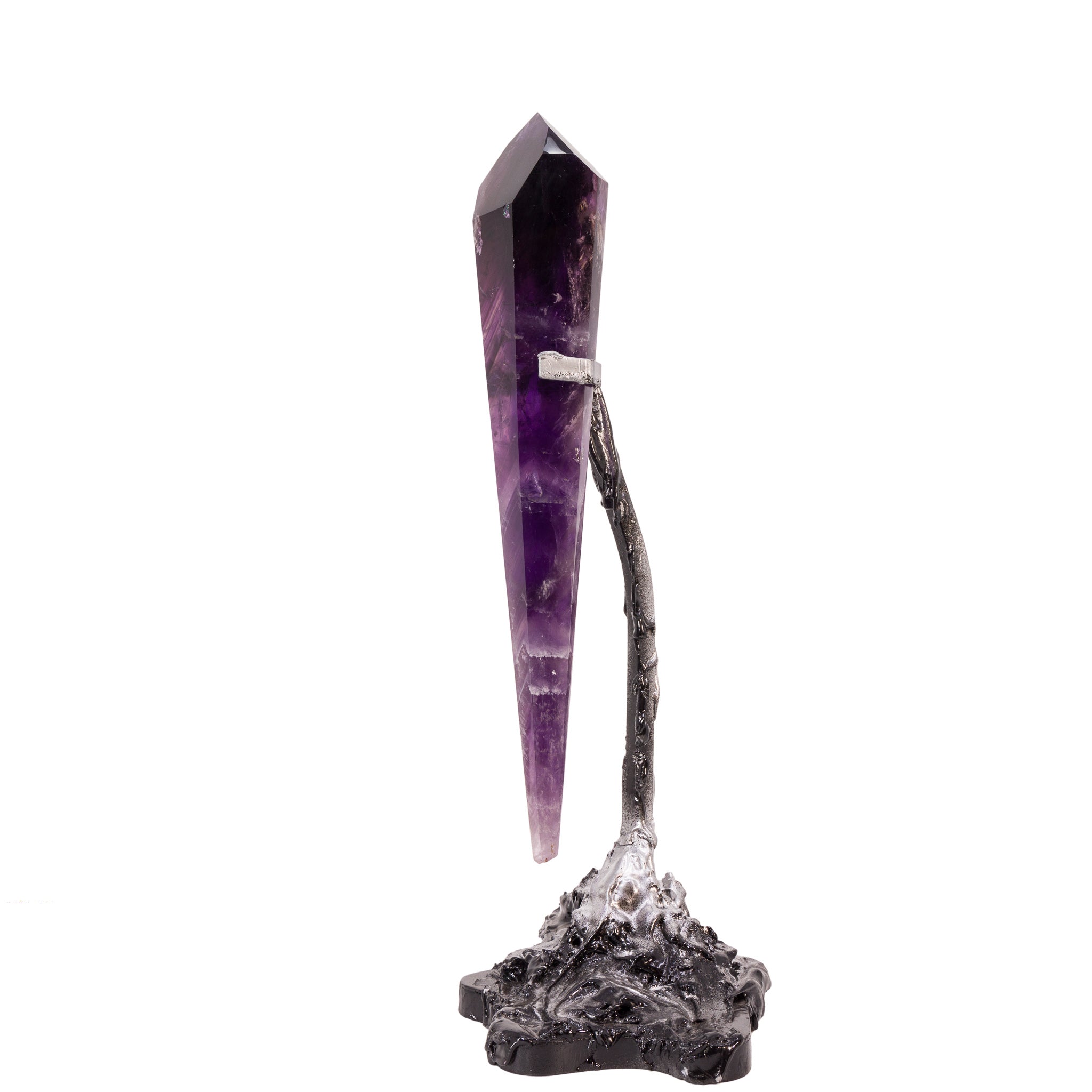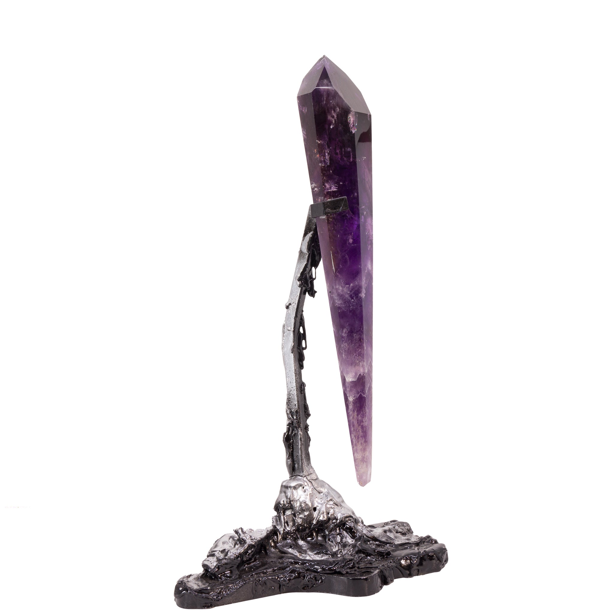 A single polished amethyst crystal has been suspended in a hand crafted work of art for an overall effect that feels both ancient and space aged at the same time.