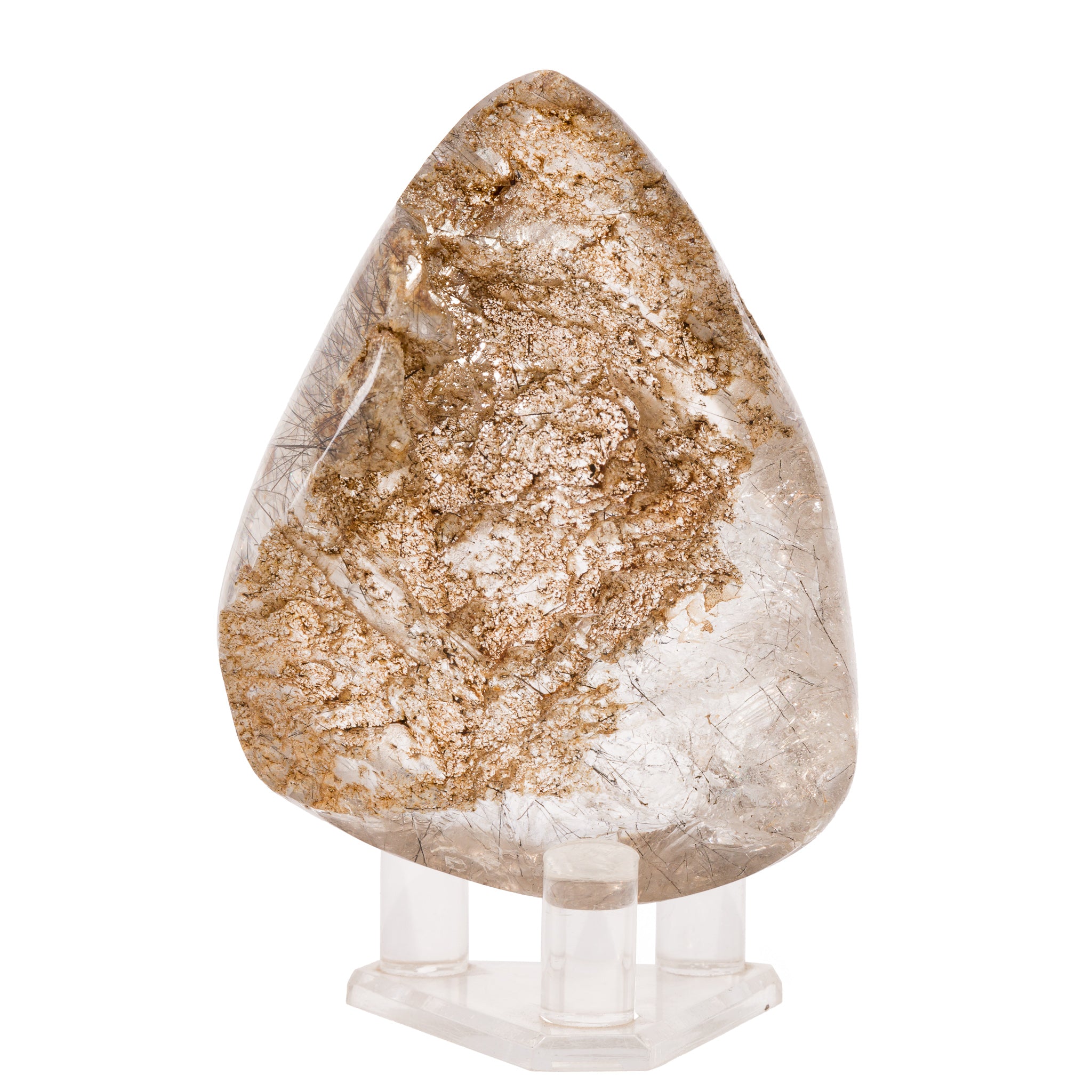 Long threads of black tourmaline intersect this water clear piece of polished quartz, creating a snow-globe like effect that's given even more dimension by the tastefully unpolished, natural back side. Such a special crystal!