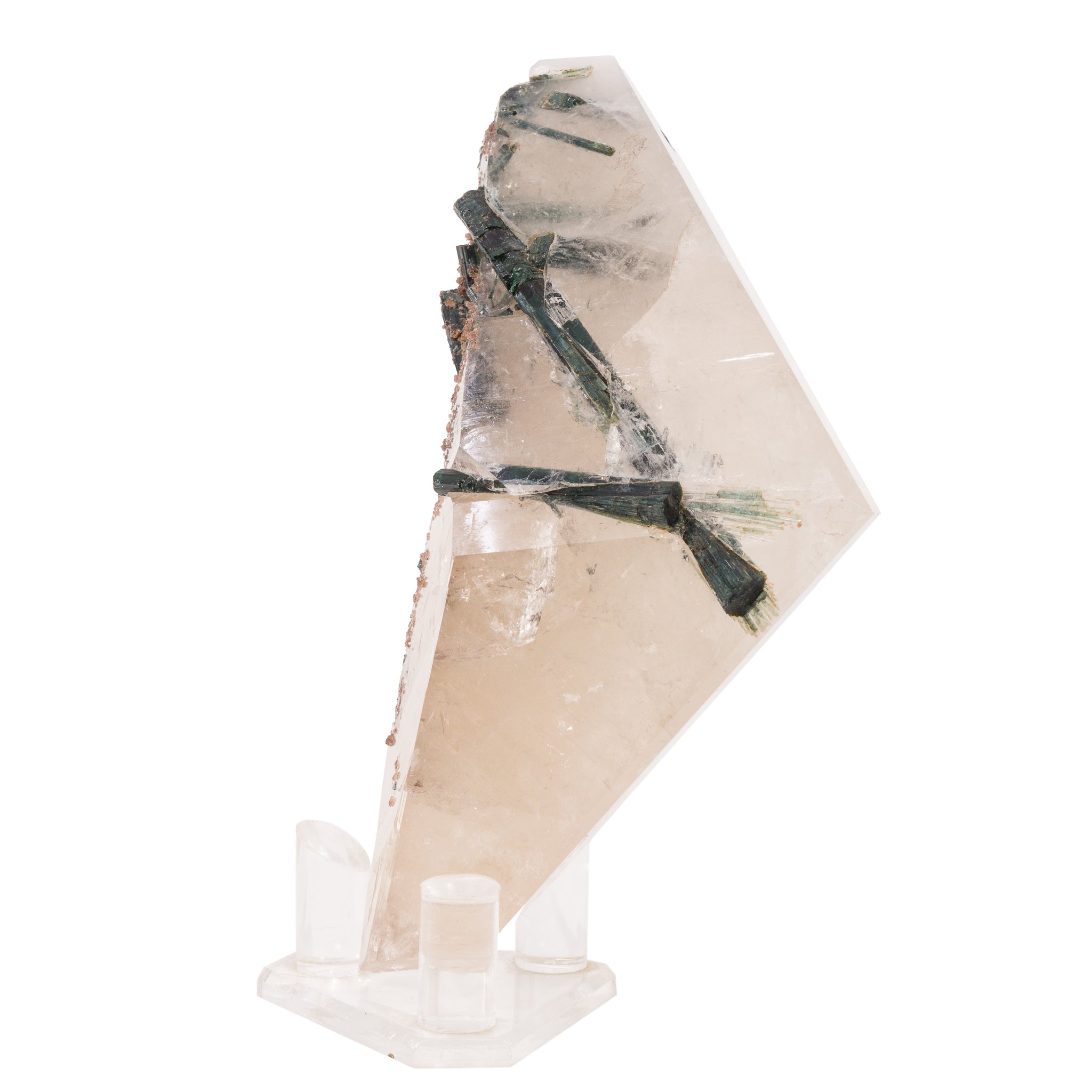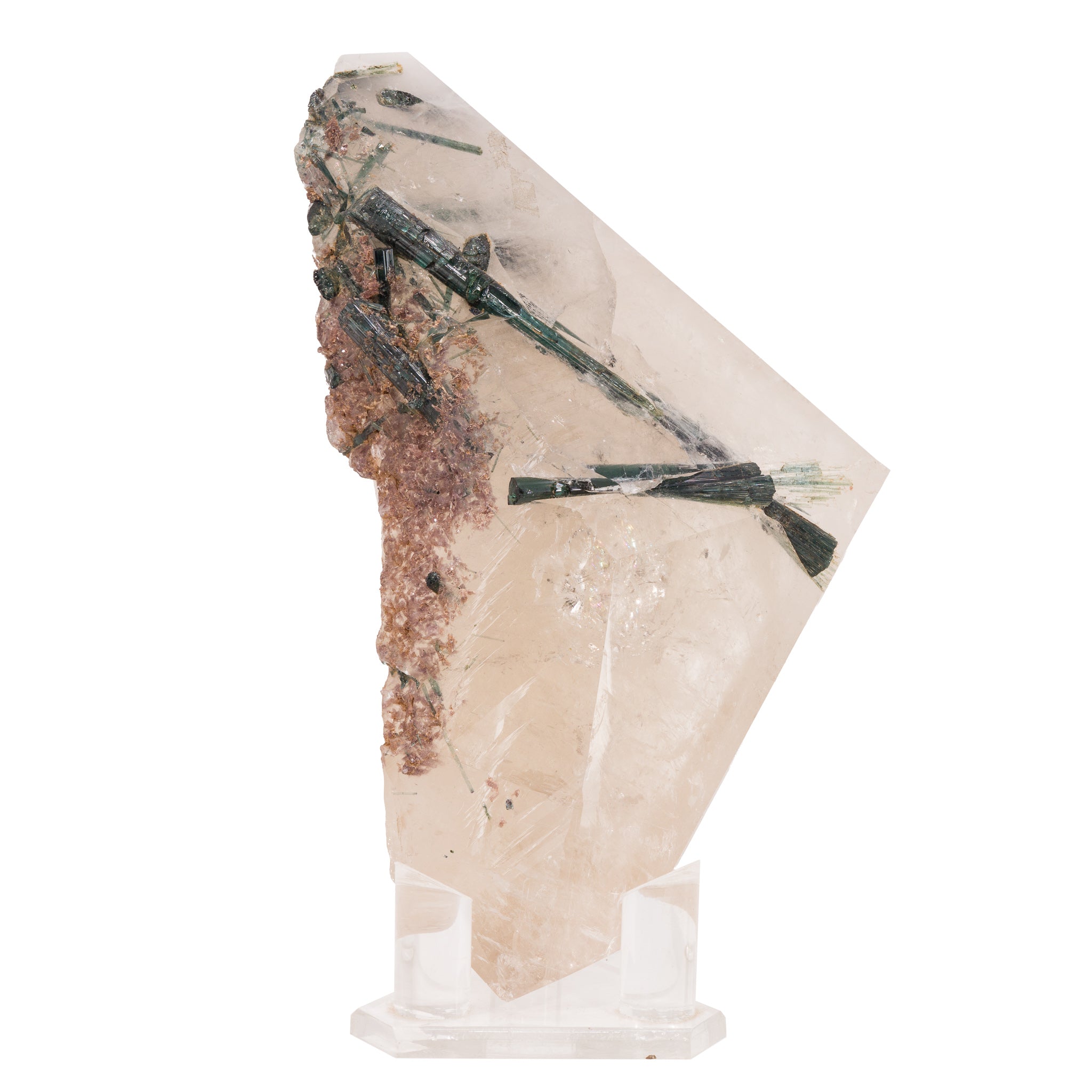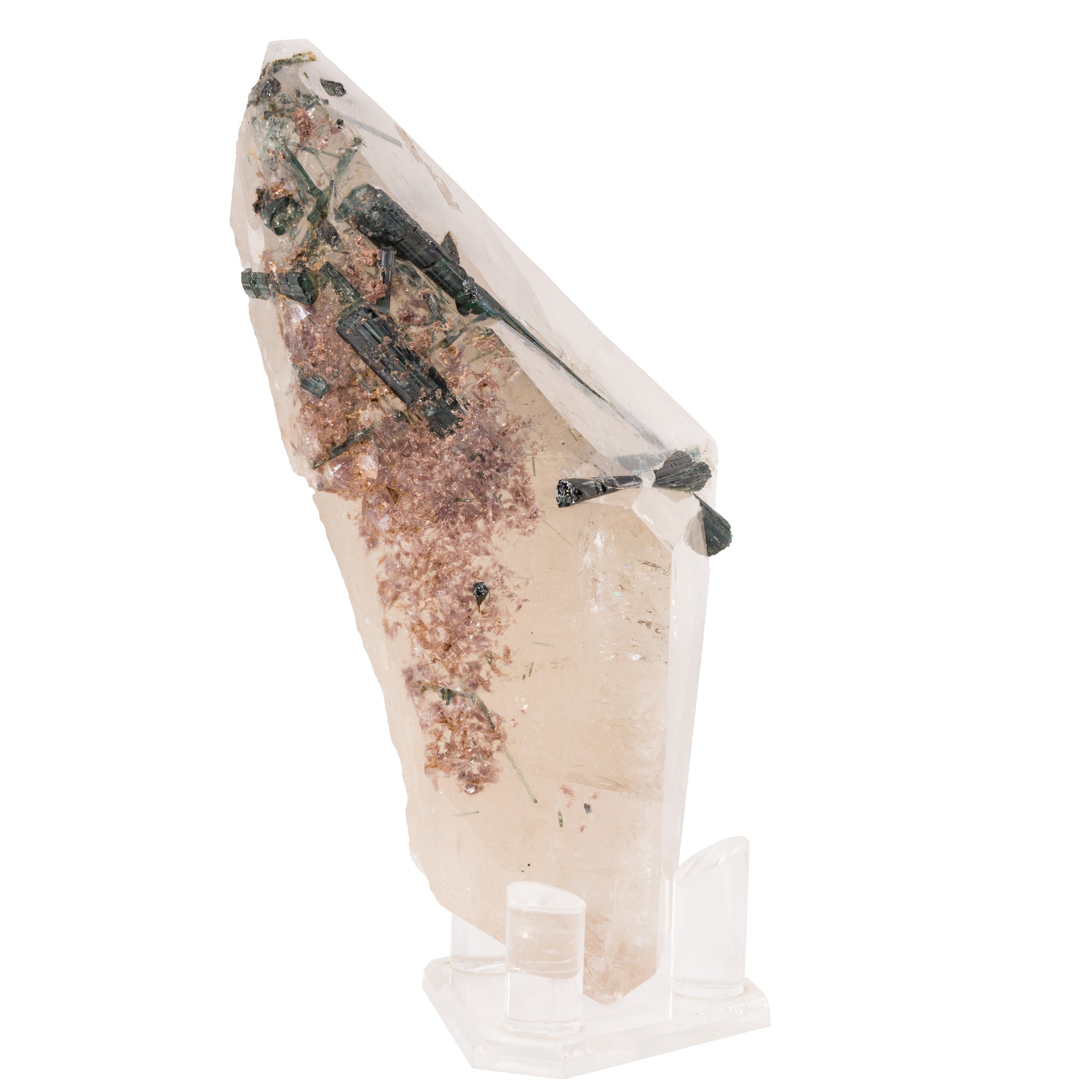 Long, gemmy tourmaline crystals are the star of this gorgeous polished quartz crystal, with a color that shifts between blue and green along each length, a gentle dusting of lepidolite along one side, and a contemporary, angular overall design. Stunning!