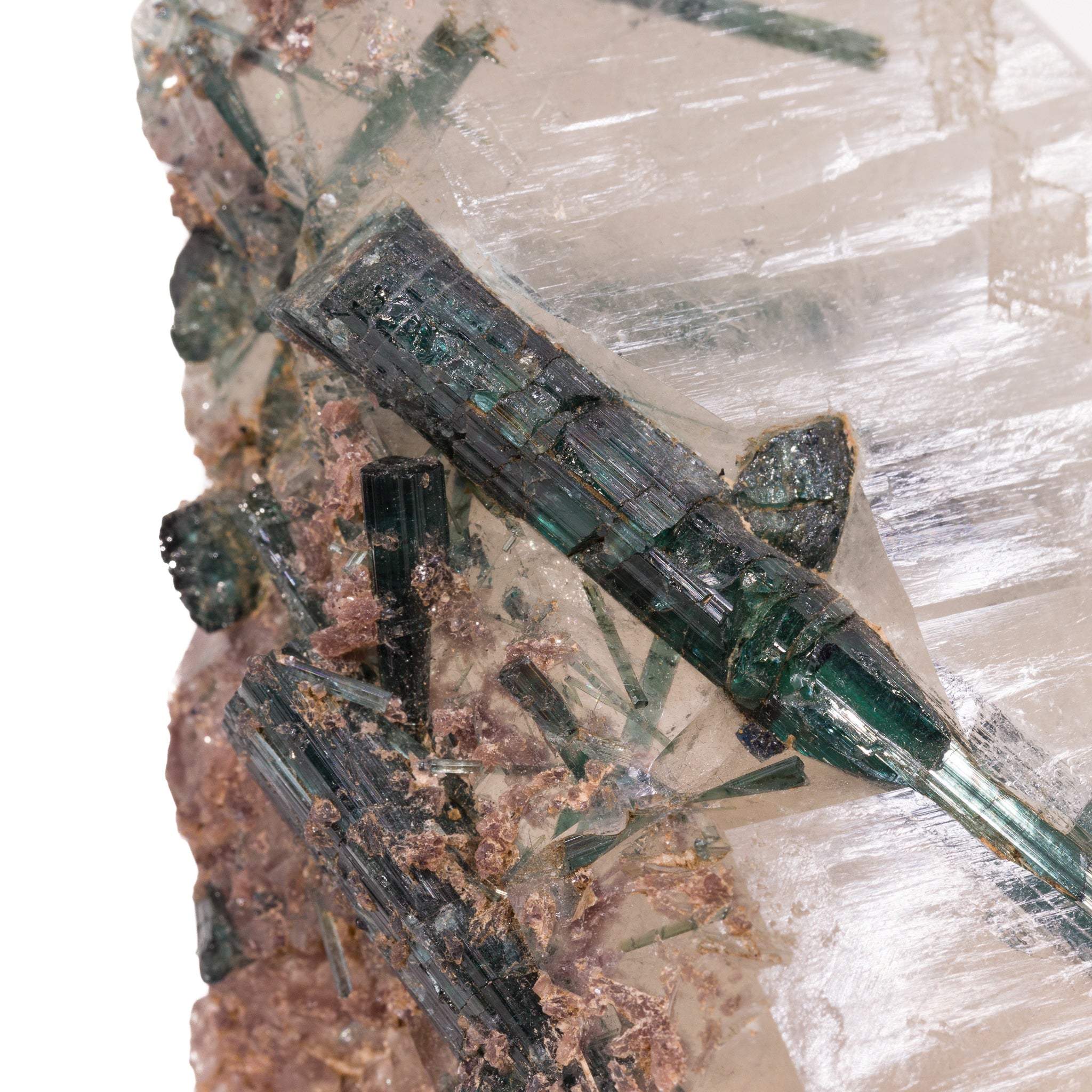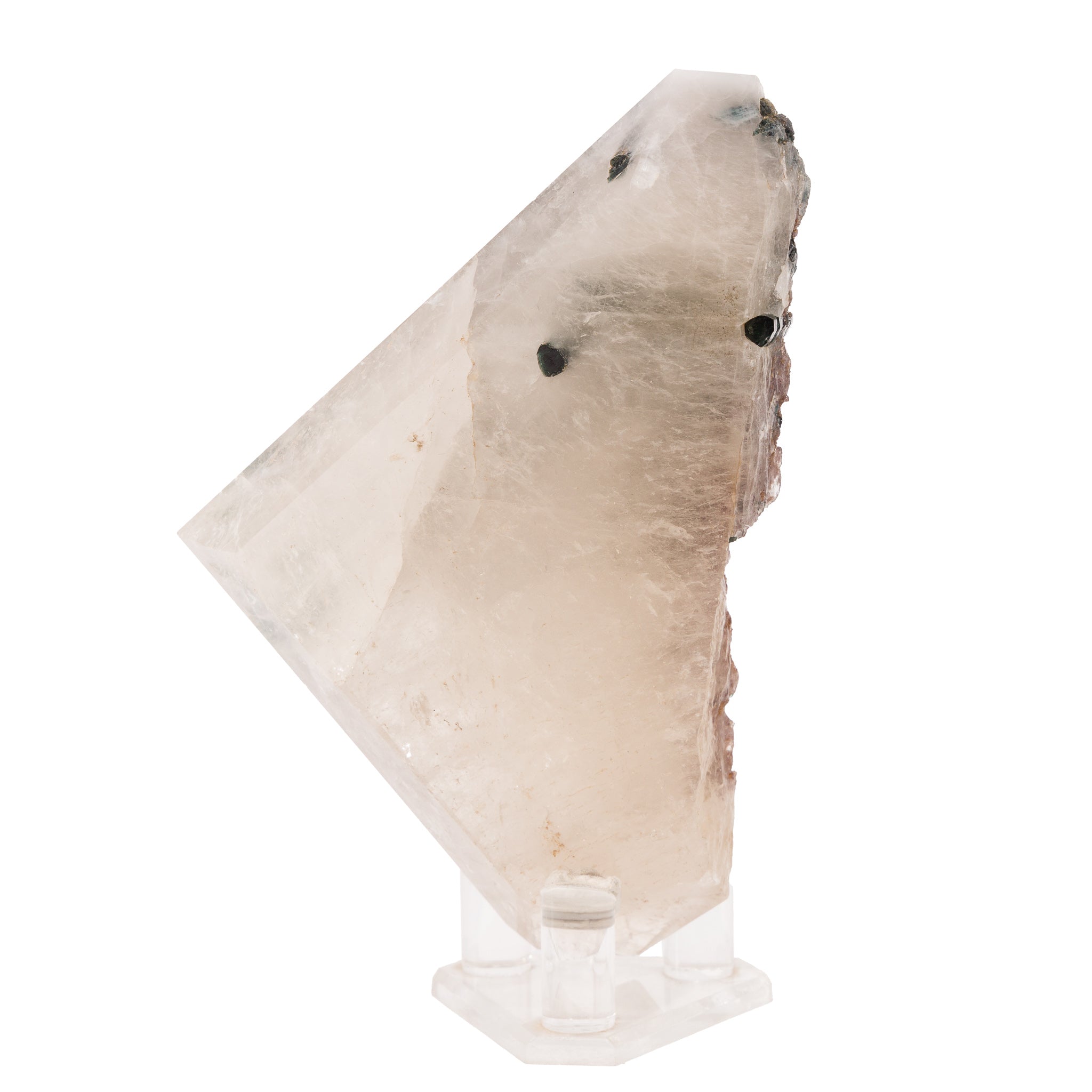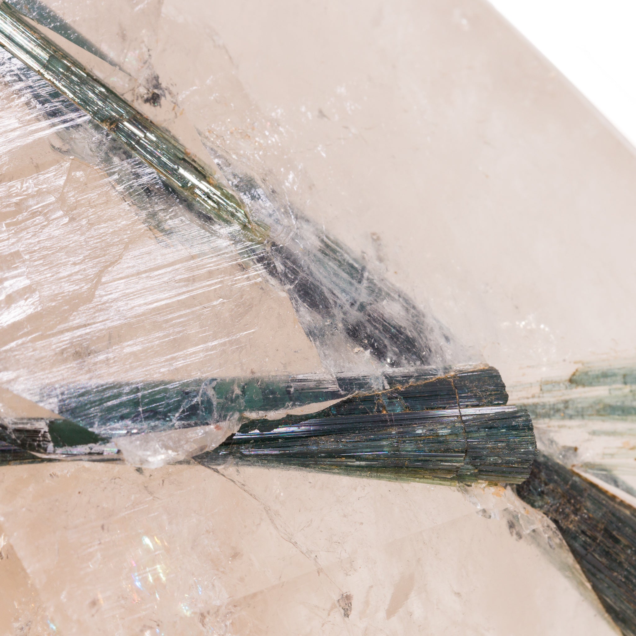 Long, gemmy tourmaline crystals are the star of this gorgeous polished quartz crystal, with a color that shifts between blue and green along each length, a gentle dusting of lepidolite along one side, and a contemporary, angular overall design. Stunning!