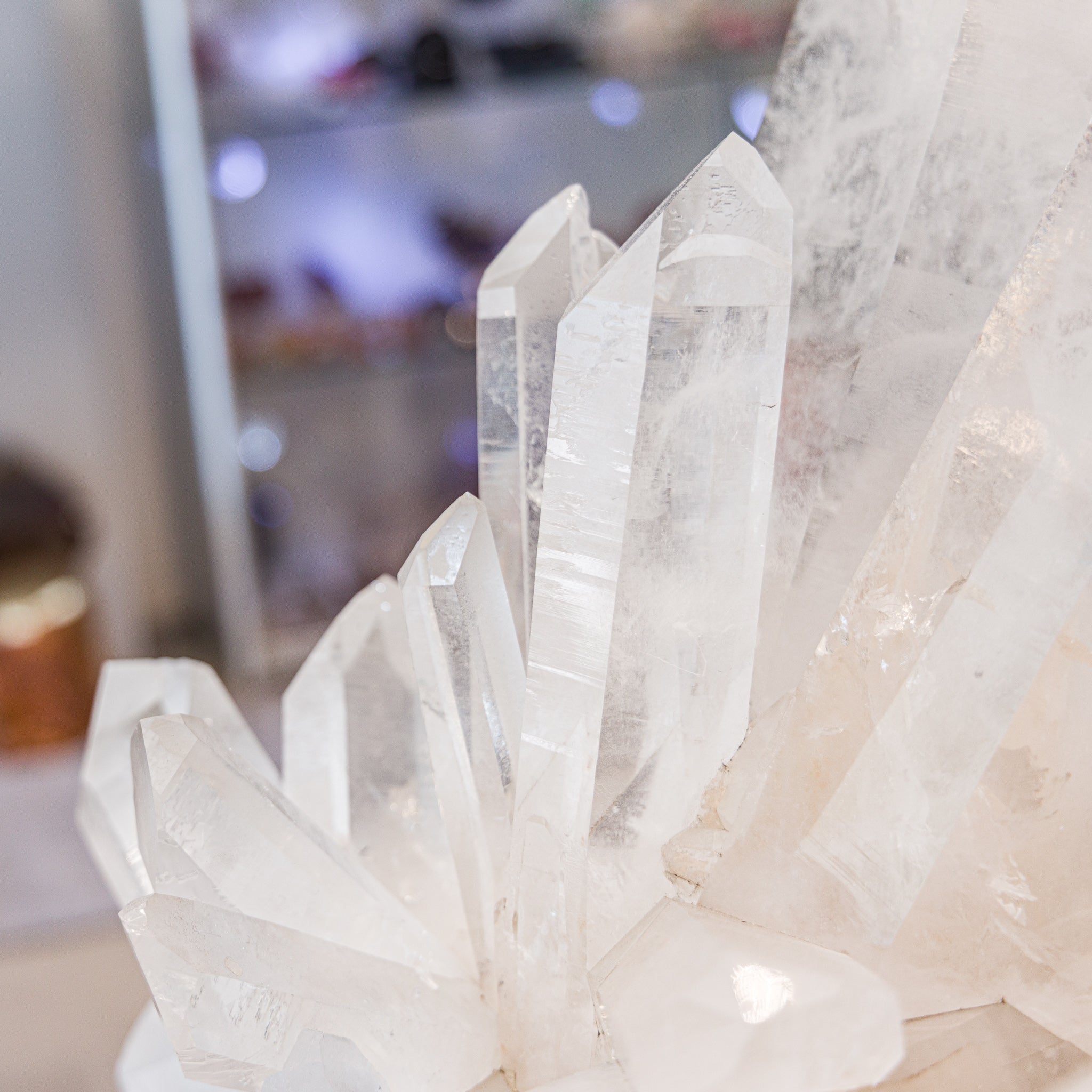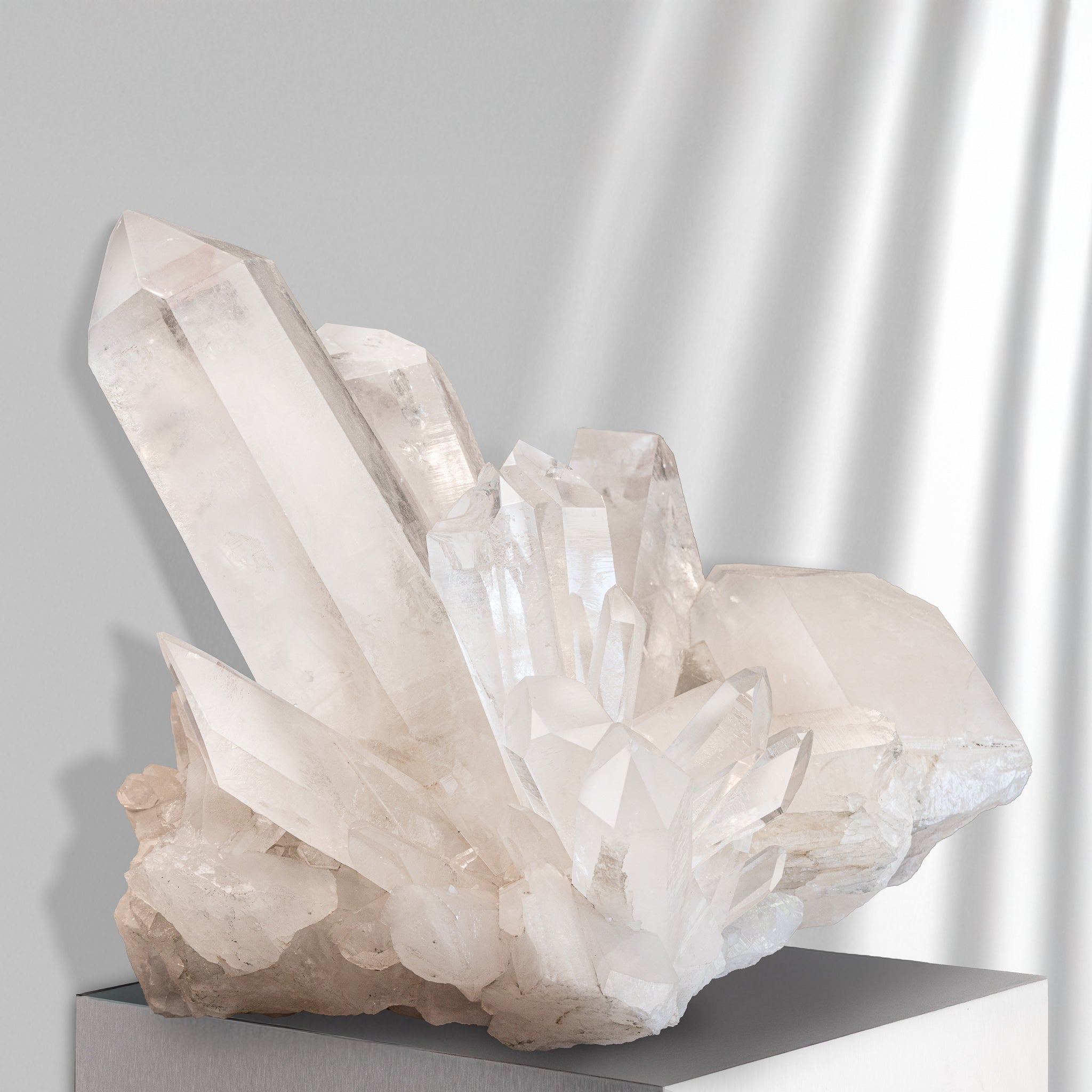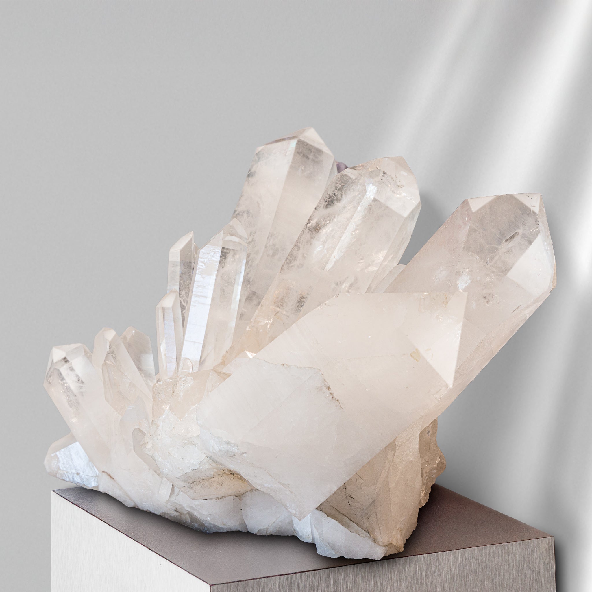 This monumental museum-quality Quartz cluster comes from a private collection where it has been treasured as a gallery centerpiece for nearly two decades. Featuring a dramatic spread of large, sharply terminated crystals, this specimen captures and refracts light to reveal luminous clarity and subtle rainbows. Natural surface textures give the piece an organic, sculptural presence, balancing clean crystal geometry with the rugged beauty of its matrix. Impressive in both scale and condition, this cluster is a true centerpiece for collectors, galleries, and sacred spaces.