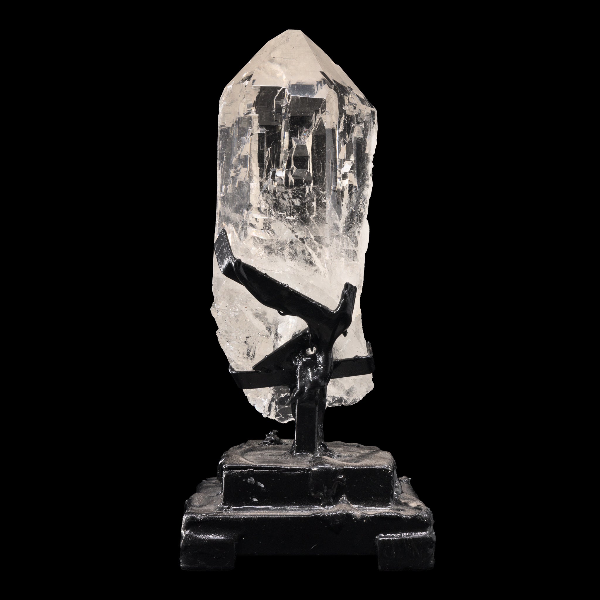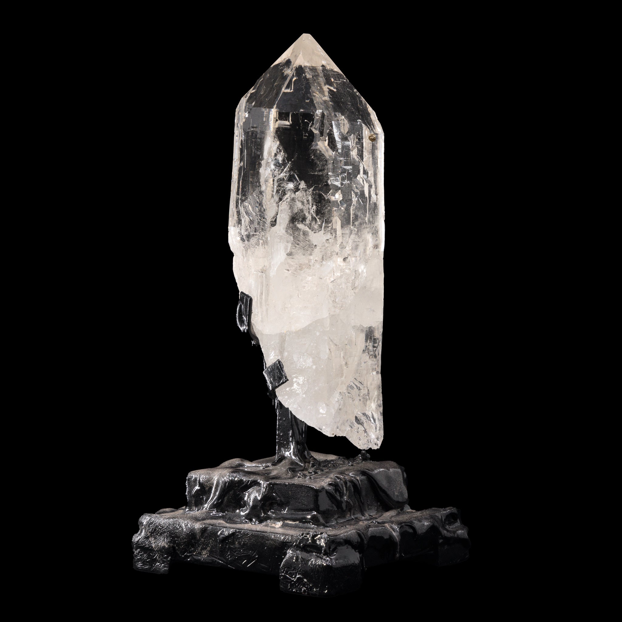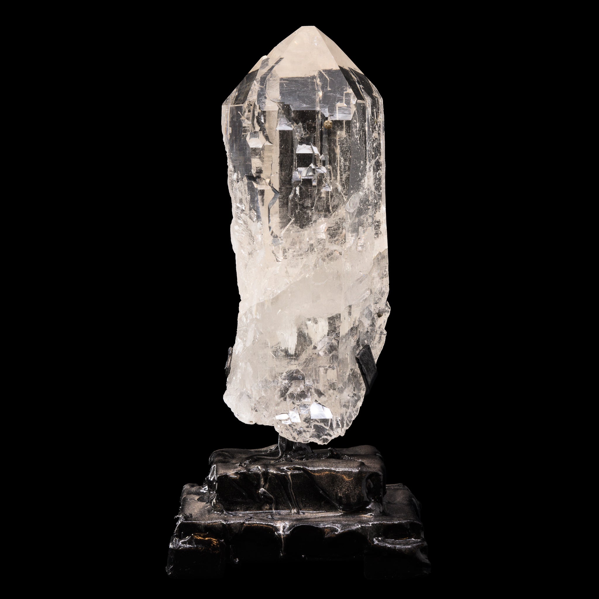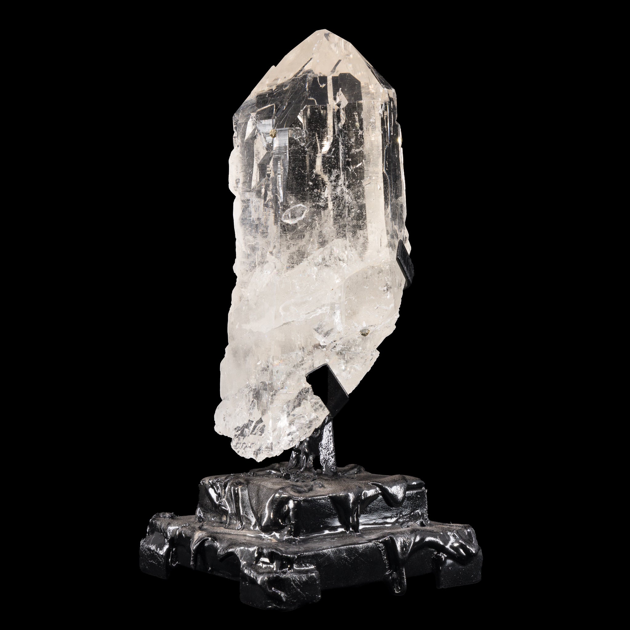 Water clear quartz with impressively well defined cathedral texturing across almost every face, and the cutest little pyrite sprinkles that catch the light and bring a kiss of glamour to an already regal natural crystal! This crystal comes with a custom, hand fabricated stand.
