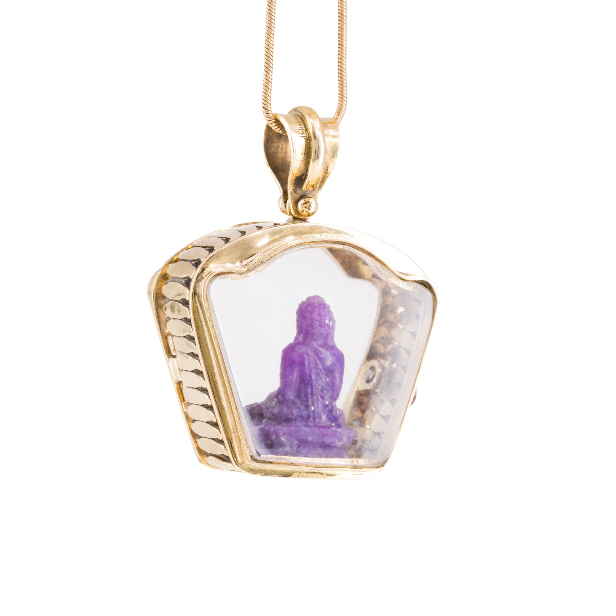 This handcrafted hinged altar pendant features a carved sugilite Buddha accented with a natural ruby, set in rich 18K gold. Sugilite is known as a powerful stone of spiritual protection, emotional healing, and higher consciousness, often associated with compassion and inner peace. The ruby accent adds warmth, vitality, and heart-centered strength, creating a meaningful talisman designed to hold intention, devotion, and grounding energy close.