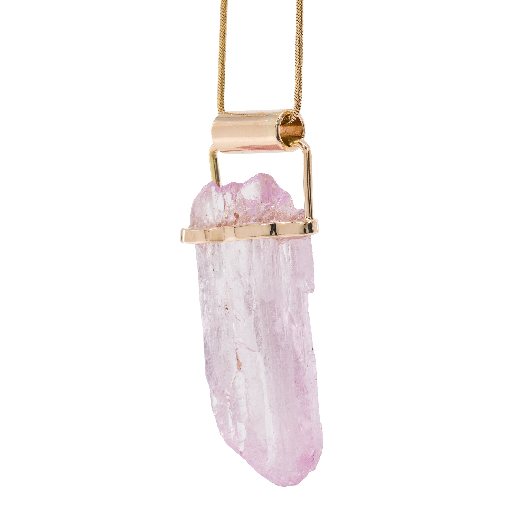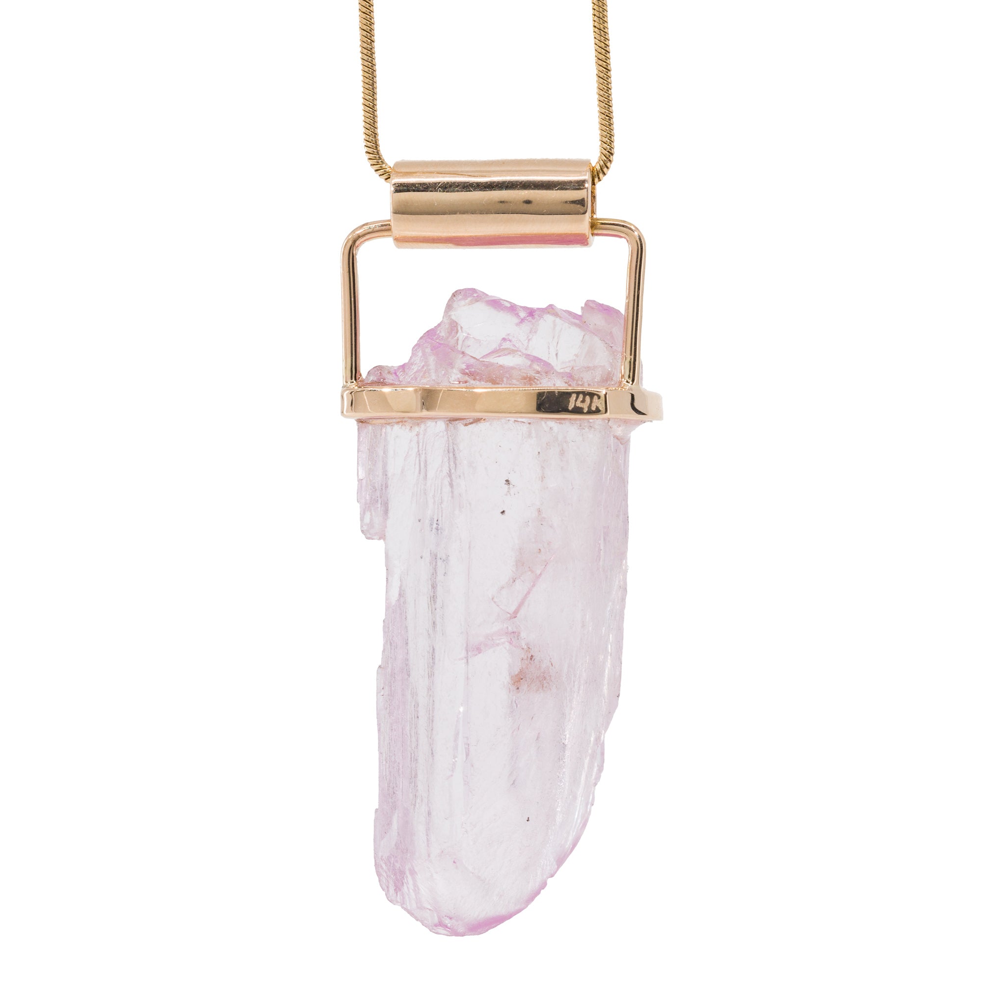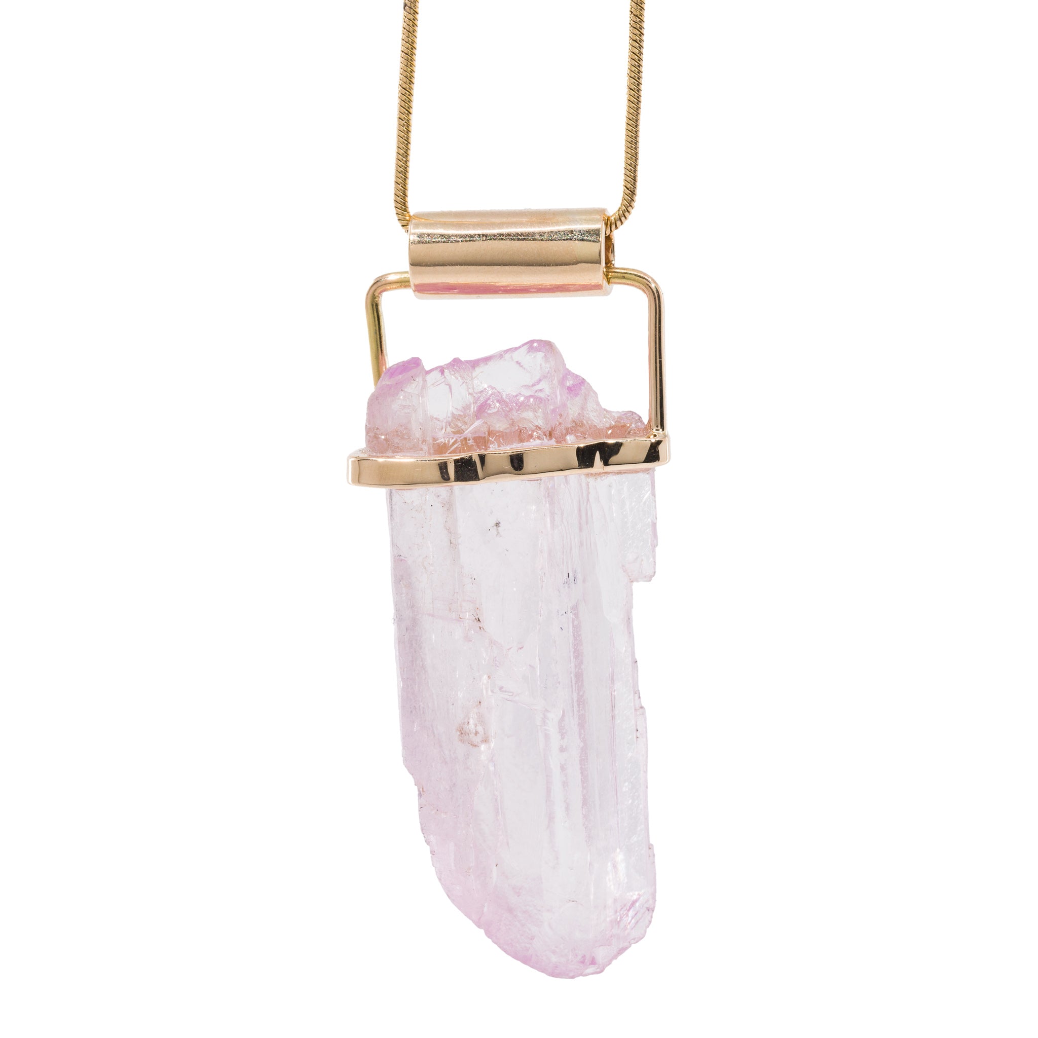 Soft pink kunzite with a subtle lavender undertone and a vibrant, glassy luster is suspended in a 14k gold pendant that's been perfectly formed around every angle of the crystal. Natural crystal jewelry at it's finest!