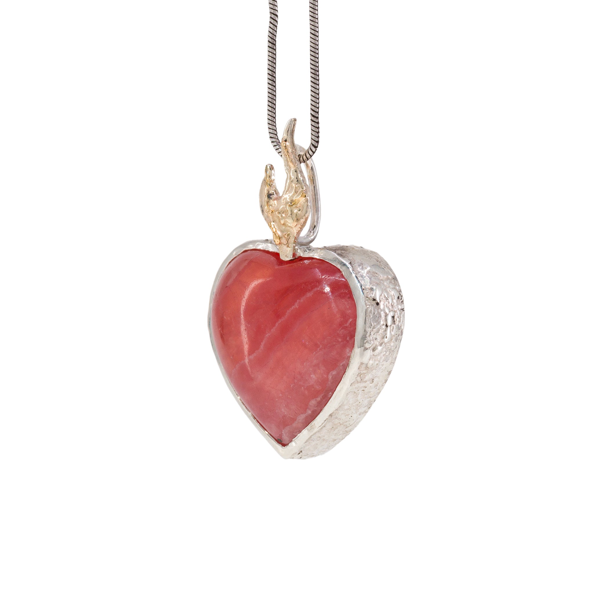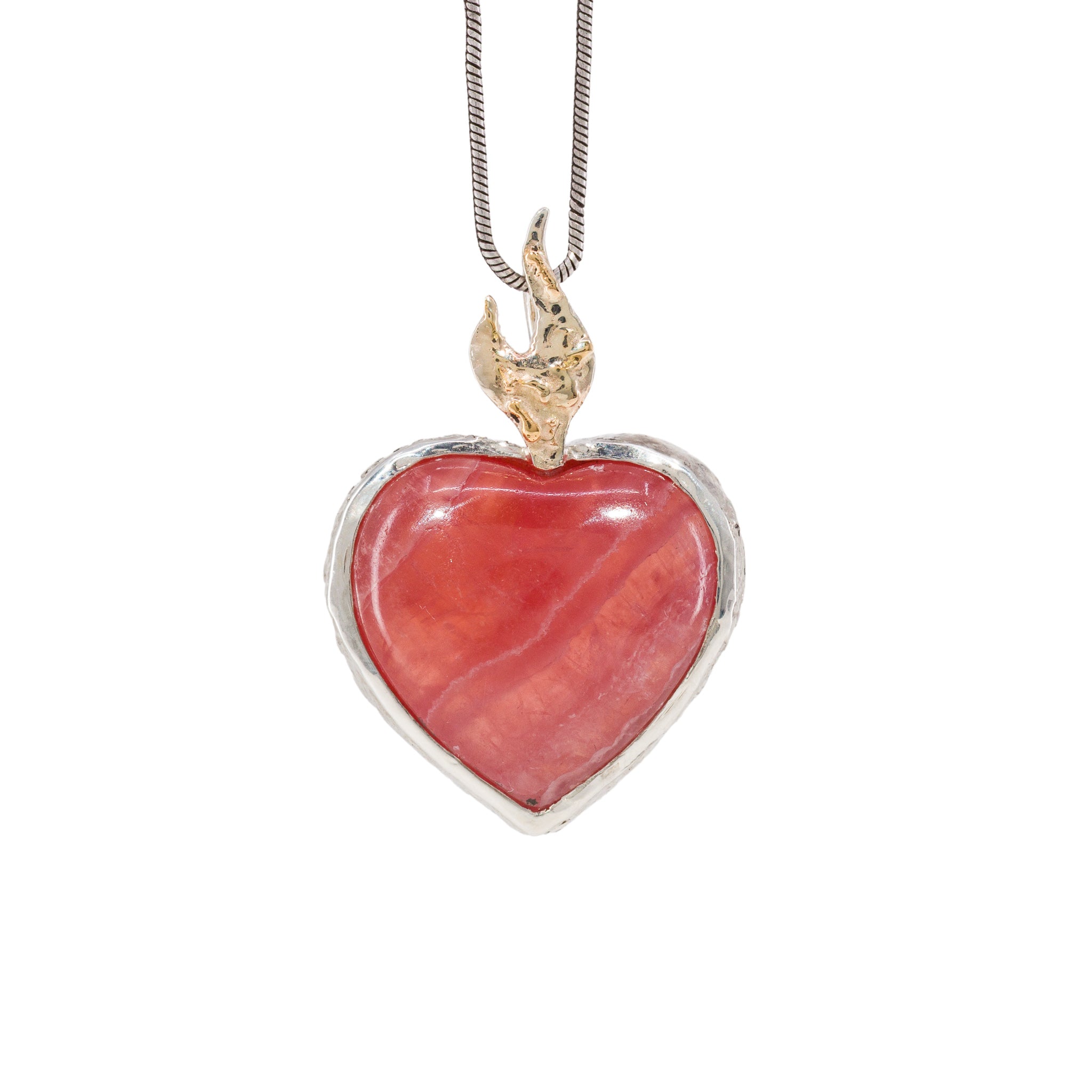 Rhodochrosite Sterling Silver & 14k Handcrafted Flaming Heart Pendant