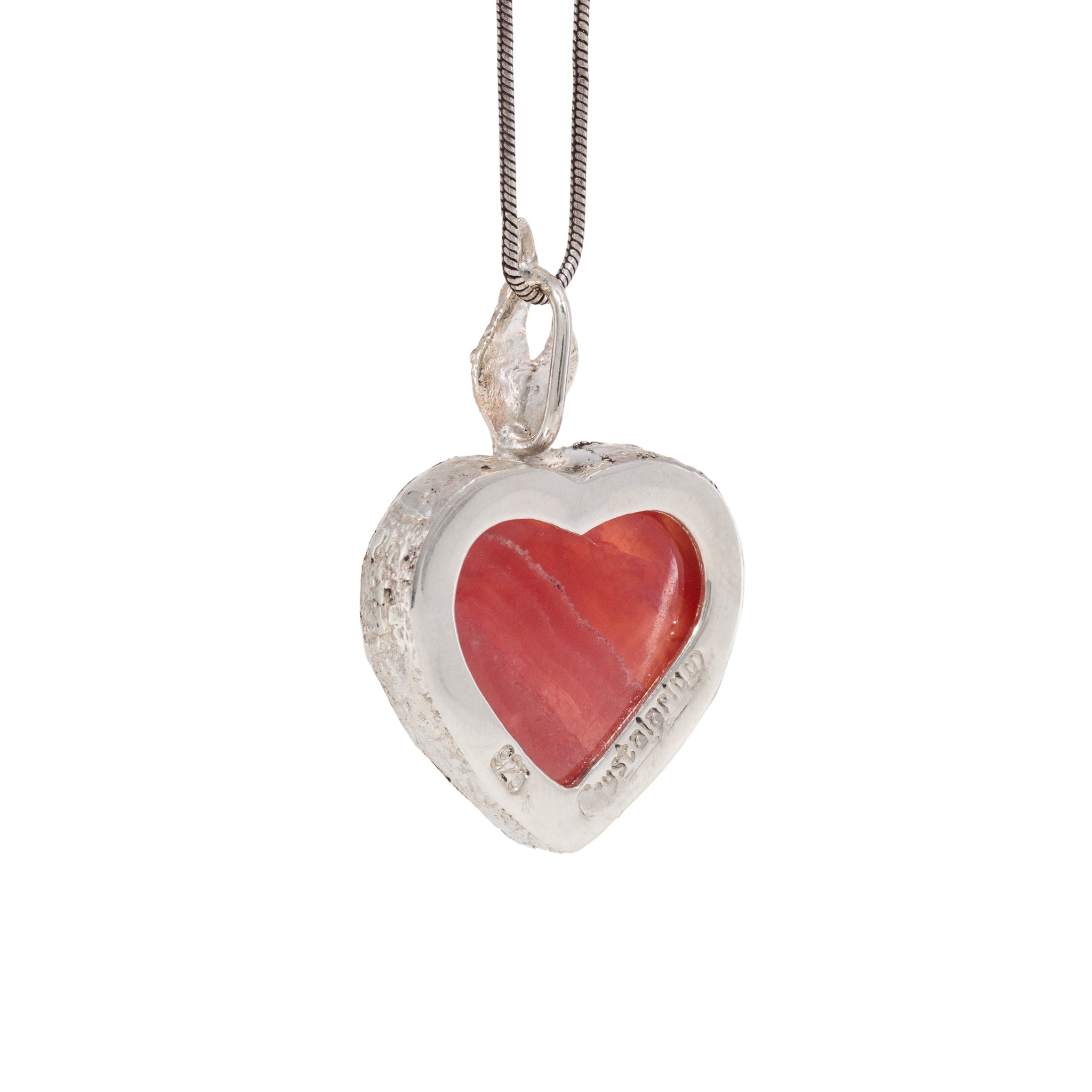 This handcrafted pendant combines the radiance of sterling silver with the warmth of 14k gold to frame a heart-shaped Rhodochrosite gemstone. The vivid pink stone glows with natural banding and depth, symbolizing love, courage, and emotional renewal. The “flaming heart” design adds a touch of passion and devotion, creating a timeless piece that embodies both artistry and meaning.