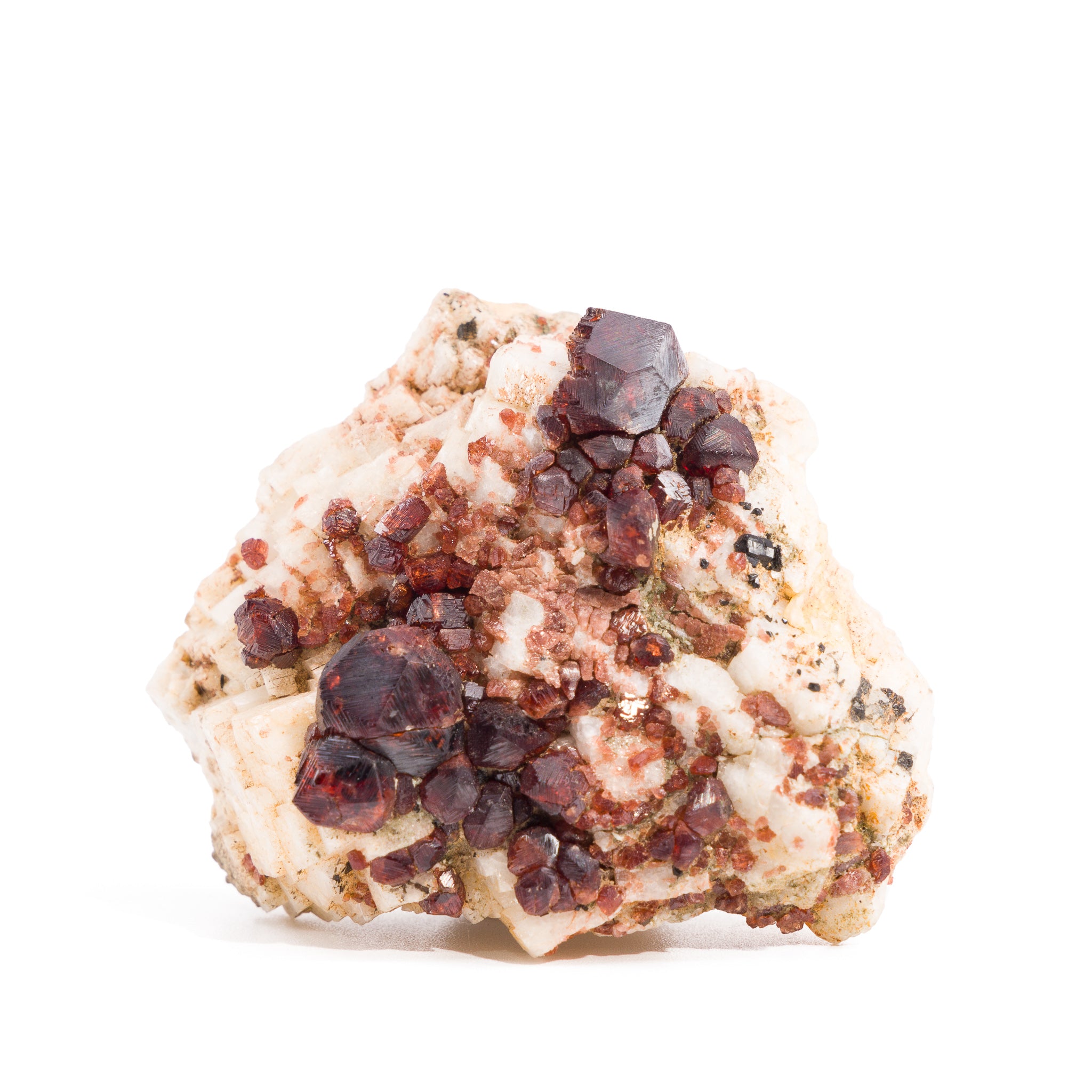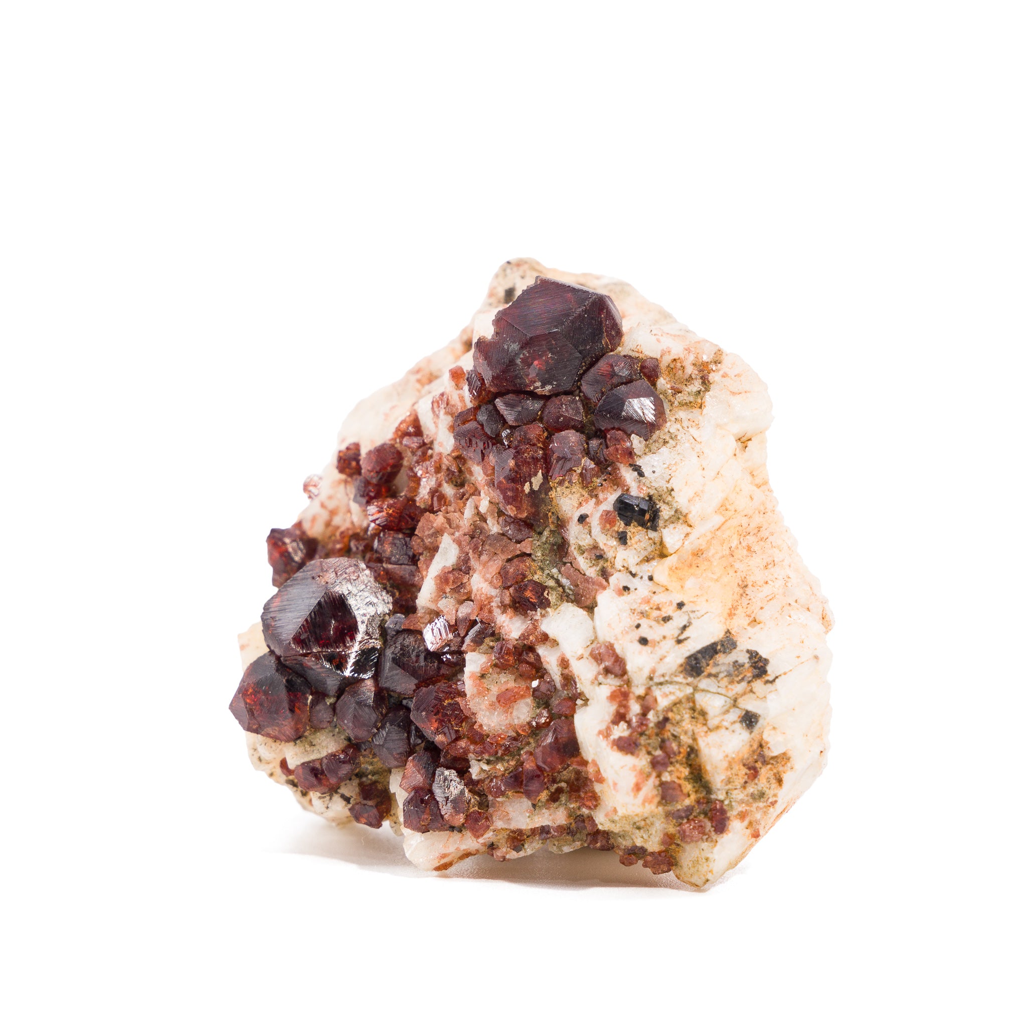 Deep red garnet crystals sit perched in their natural matrix exactly how they formed in the earth, with enchanting geometric etching across the faces of the larger crystals. A charming little specimen to jazz up a collection or bring a touch of natural crystal beauty to your home!