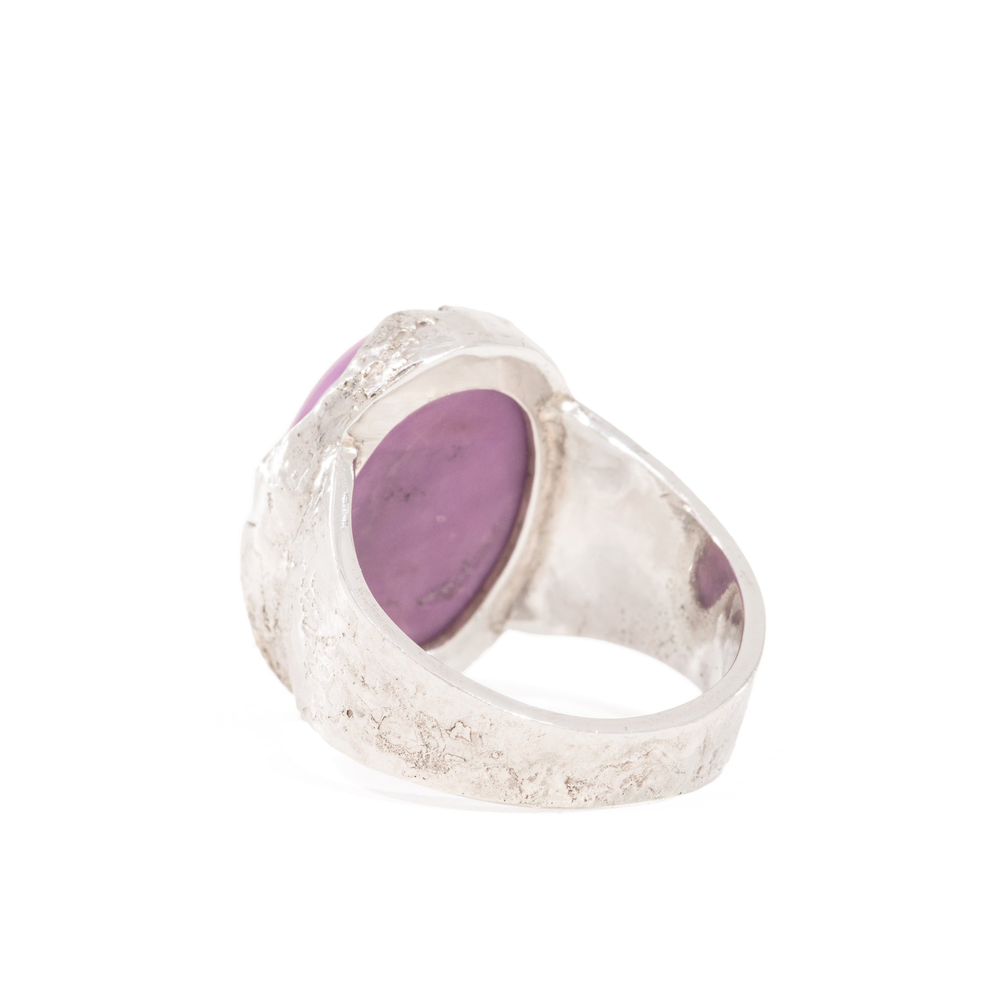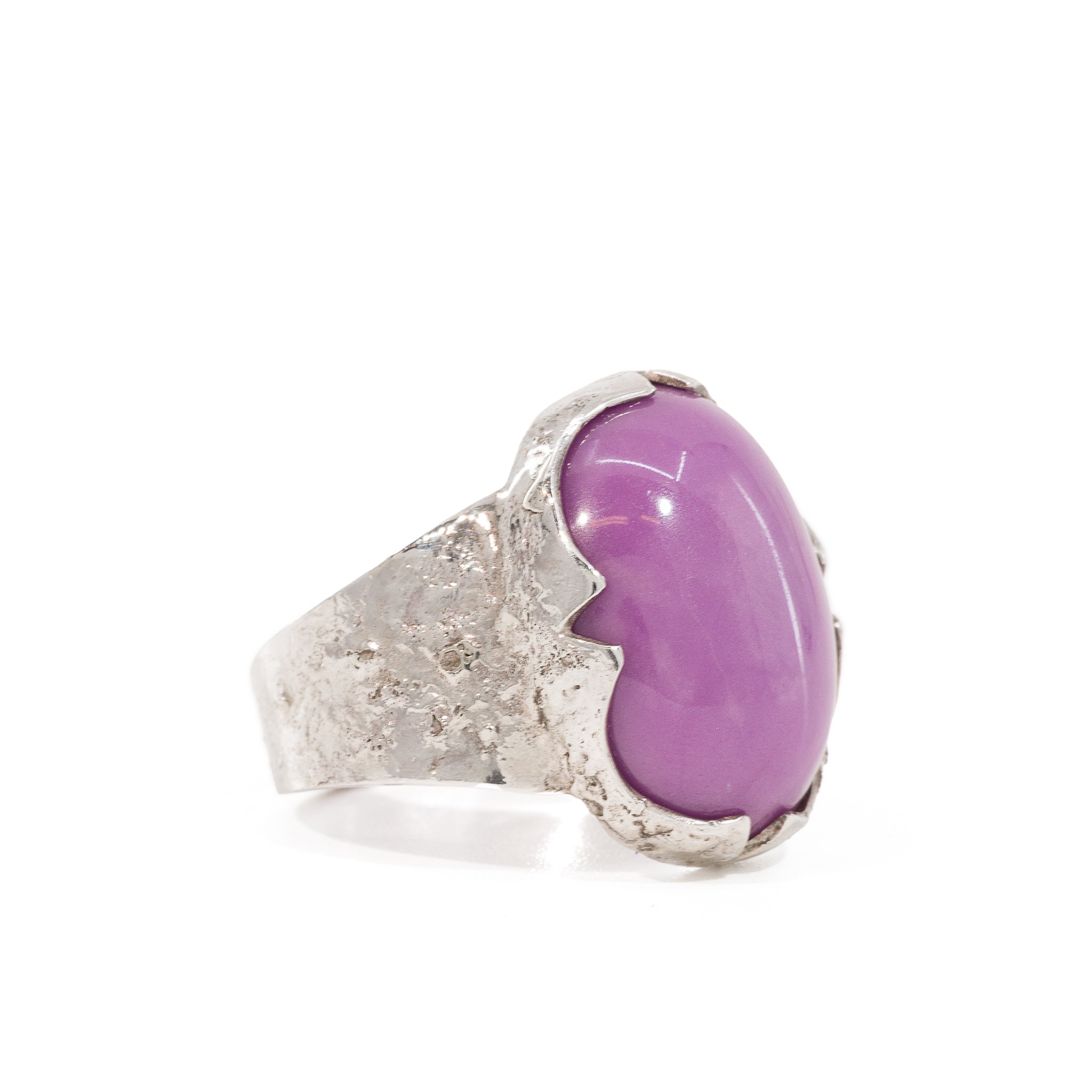 A highly distinct shade of purple, glossy finish and uniform opaque color make this phosphosiderite cabochon cut stone a true curiosity in the world of natural gemstones! Set in a gorgeous handcrafted Sterling Silver band and fancy bezel!