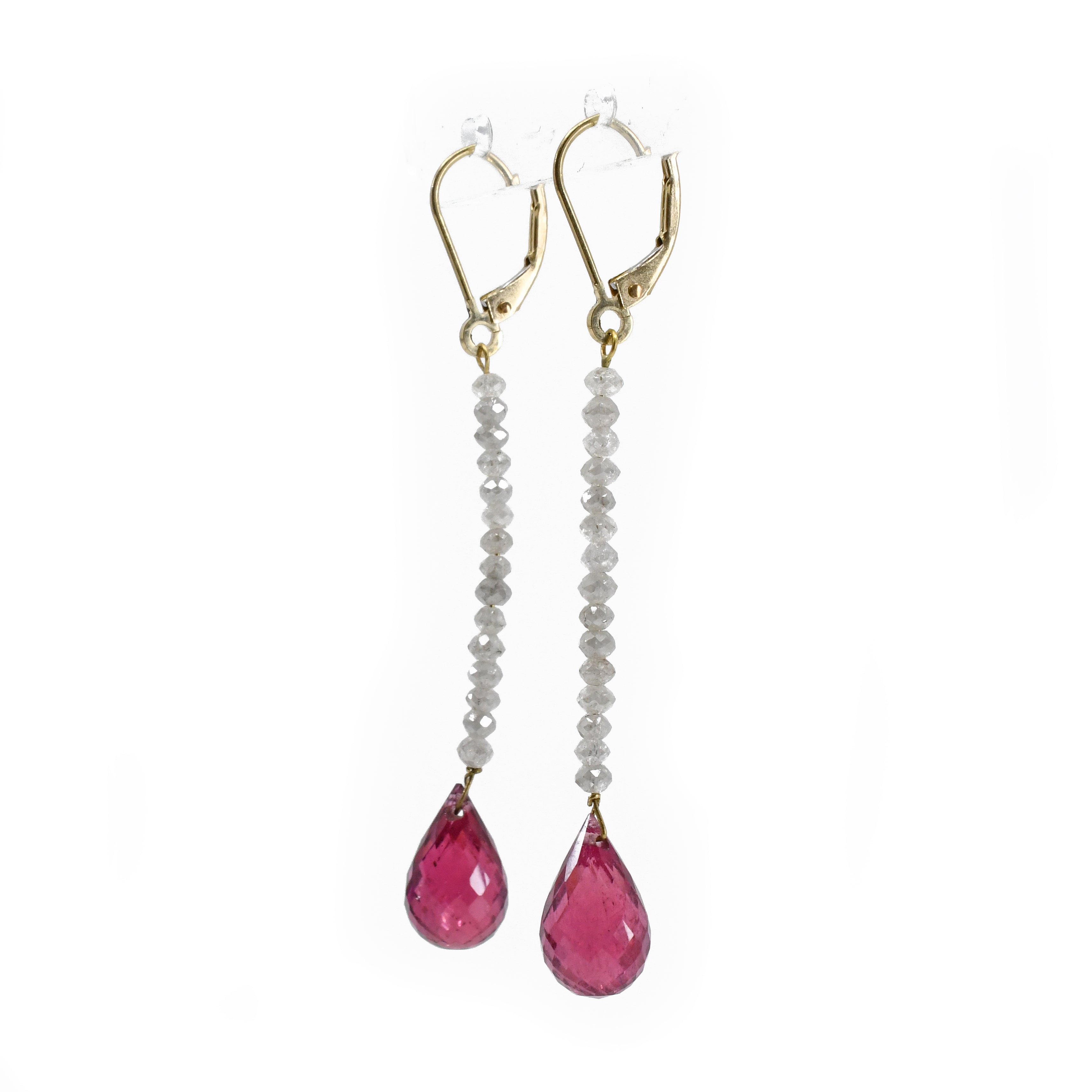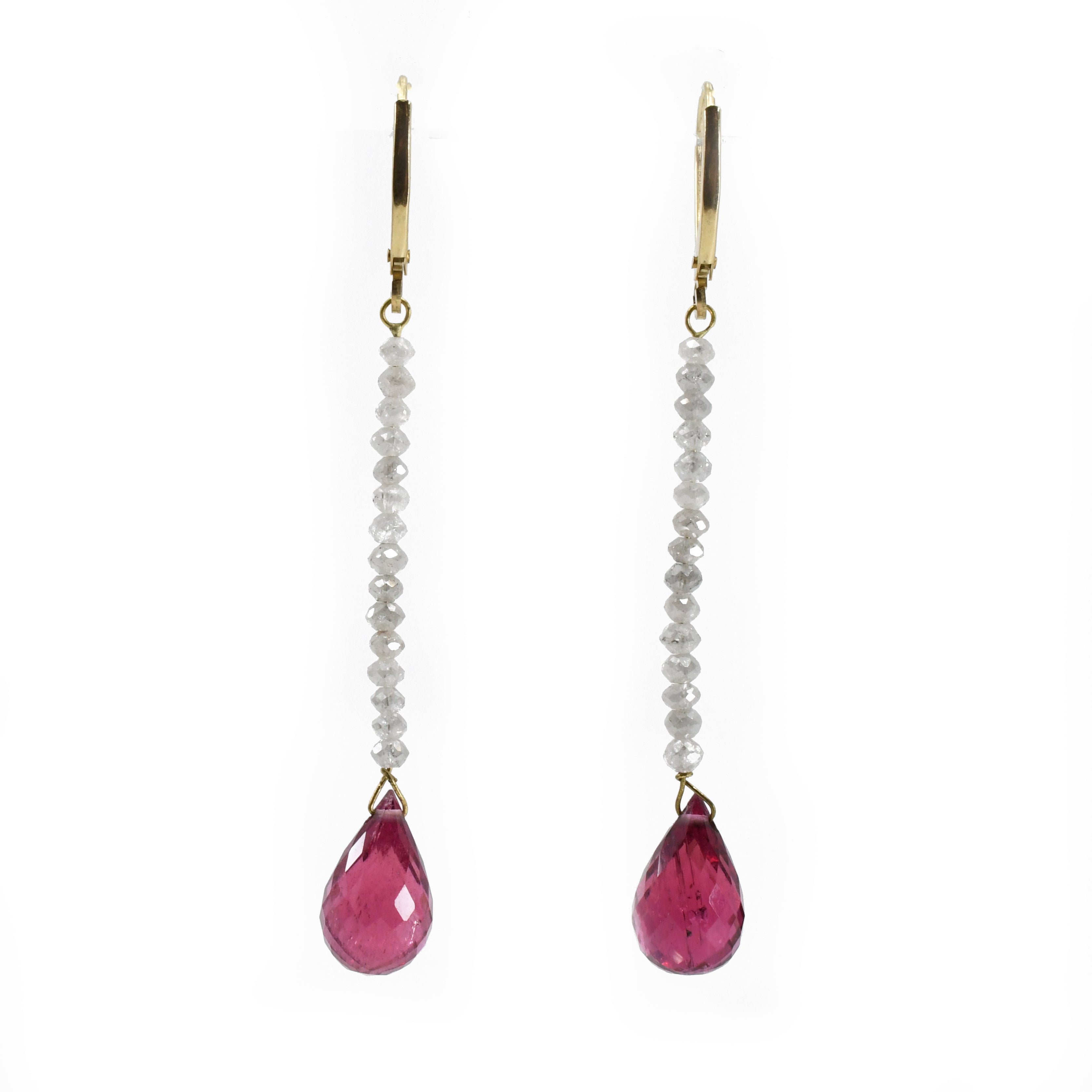 Rubelite 9.88ct Briolette & Diamond Bead 18k Gold Handcrafted Earring Pair