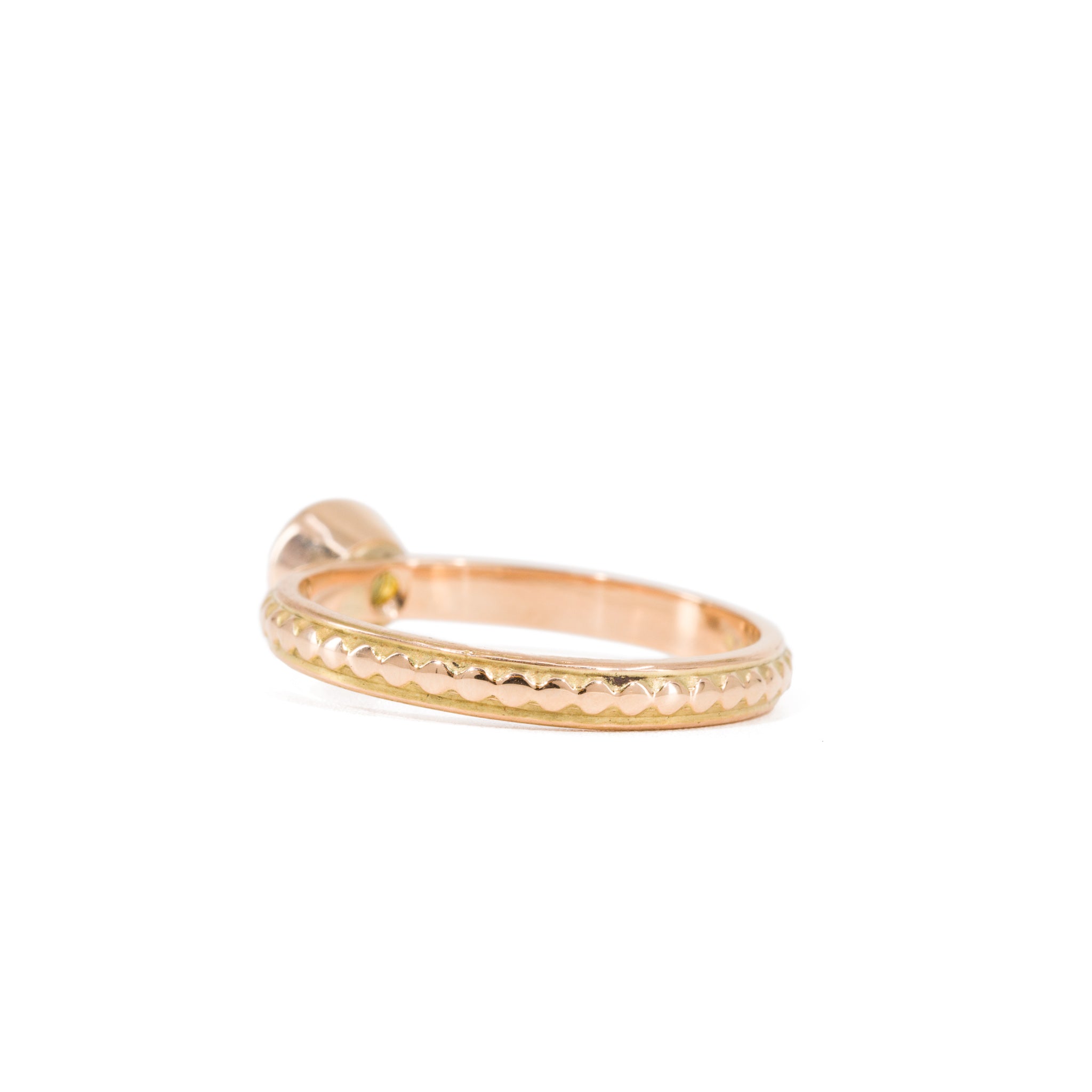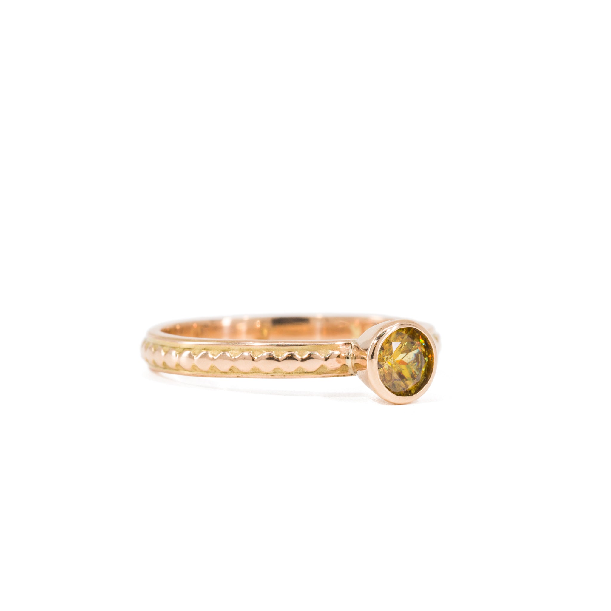 This little faceted sphene gem crystal packs quite a punch, with a color that dances between olive gold and green, and an internal fire that stops you in your tracks. An elegant textured band gives an added layer of interest to this darling little stackable ring!