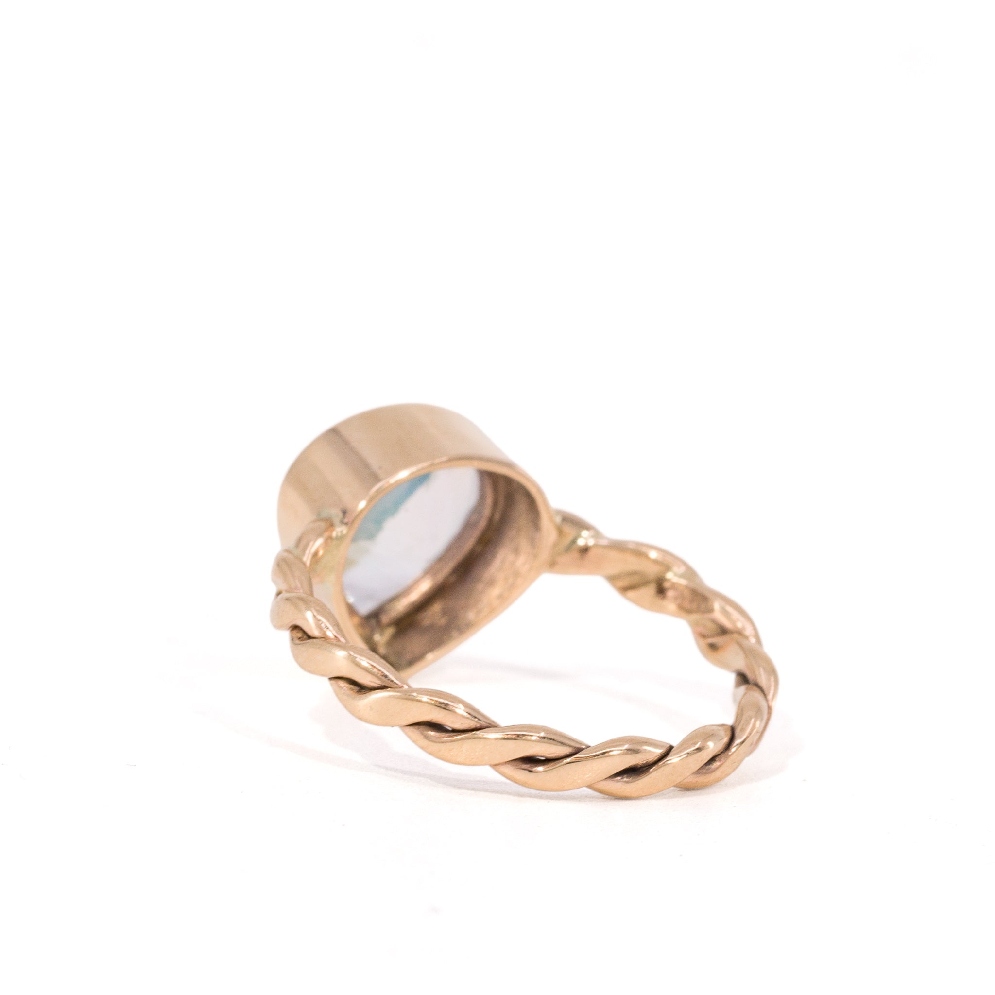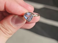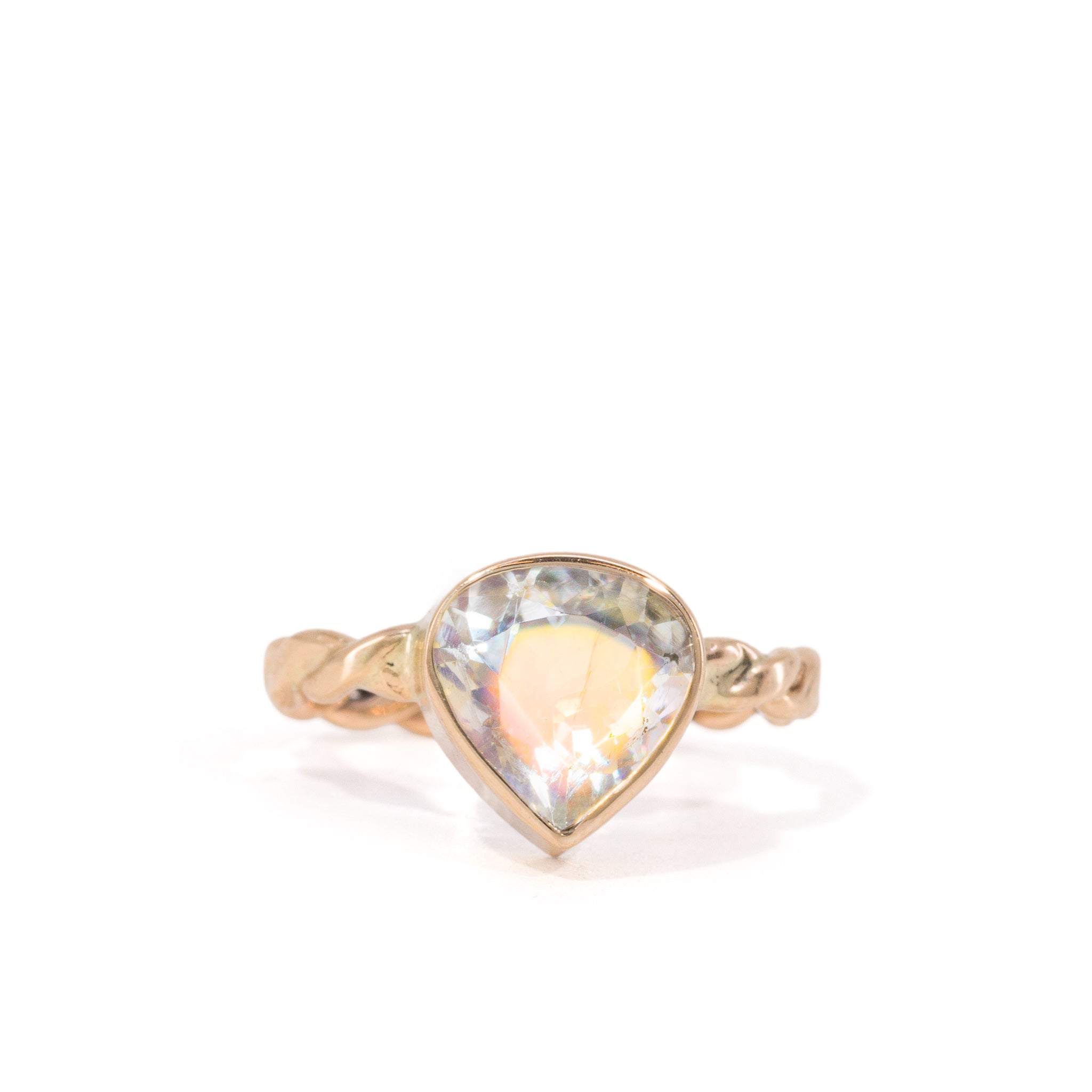 A 2.14 carat Madagascar moonstone set into an elegant, elven-like 14k gold ring. The surface carries a warm, golden sheen that drifts across the stone, giving it that signature glow this material is known for. As it moves, softer flashes of rainbow color appear at the edges, catching light in more subtle, shifting moments. The pear shape introduces a natural sense of flow, while the twisted band adds a charming sense of whimsy. Smooth, grounded, and easy to wear, with enough detail to keep the eye returning to it.