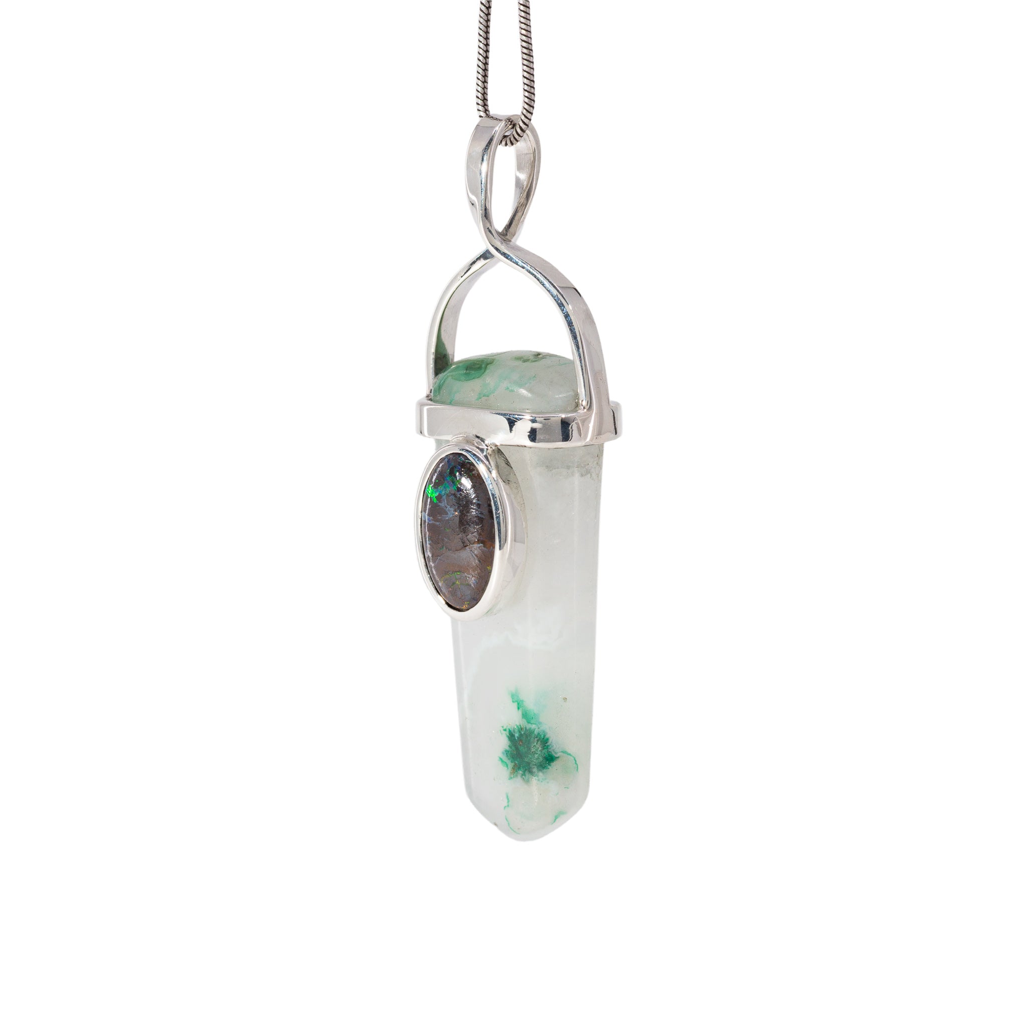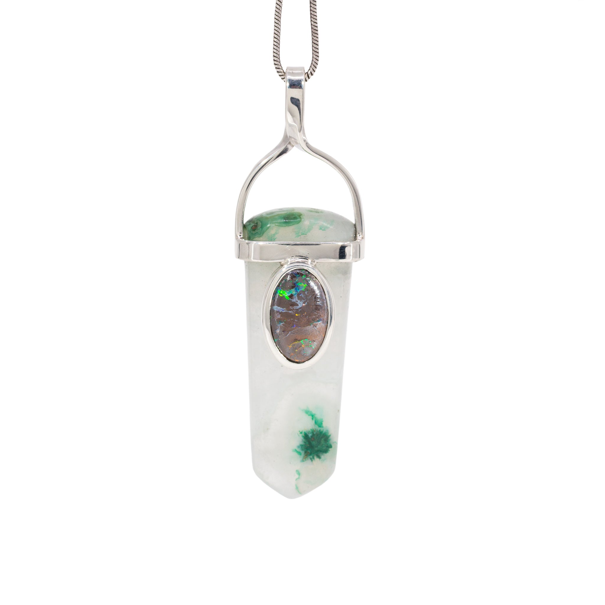 Malachite in Quartz with Boulder Opal Sterling Silver Handcrafted Crystal Pendant