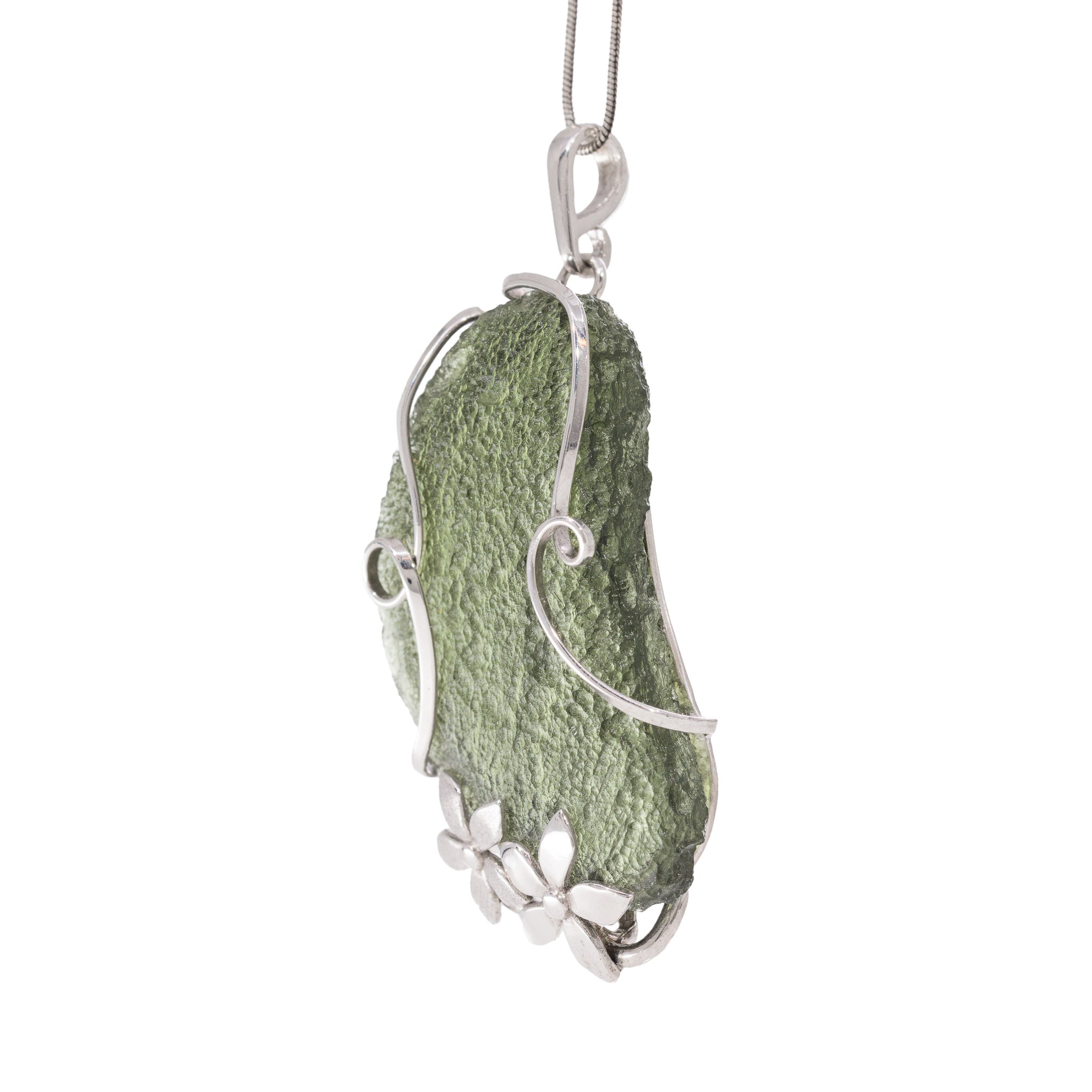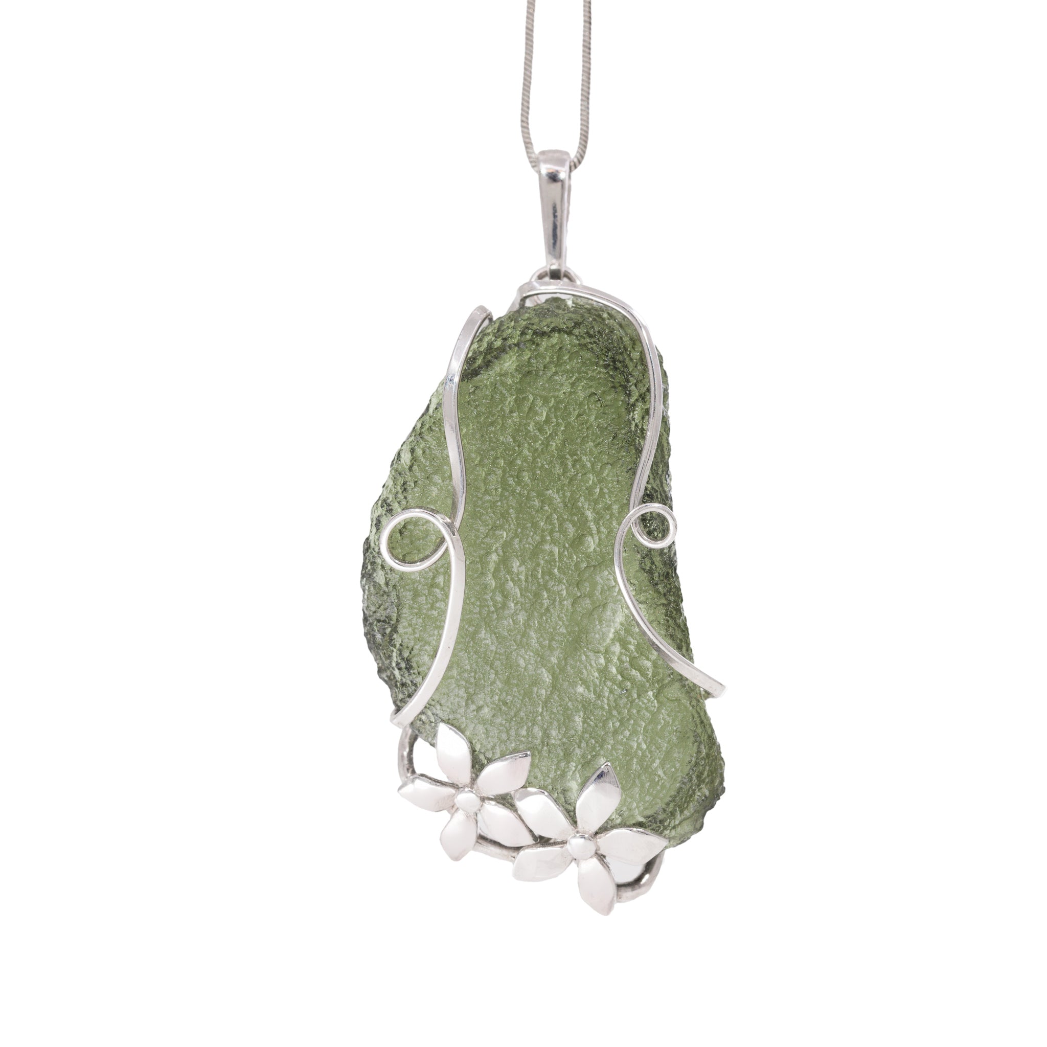 This one-of-a-kind Moldavite pendant features a richly textured natural crystal, wrapped in hand-sculpted Sterling Silver with an elegant floral design that enhances the stone’s mossy, organic look. At 14 grams, it’s both substantial and wearable, making it a striking statement piece that carries the otherworldly energy of authentic Moldavite.
