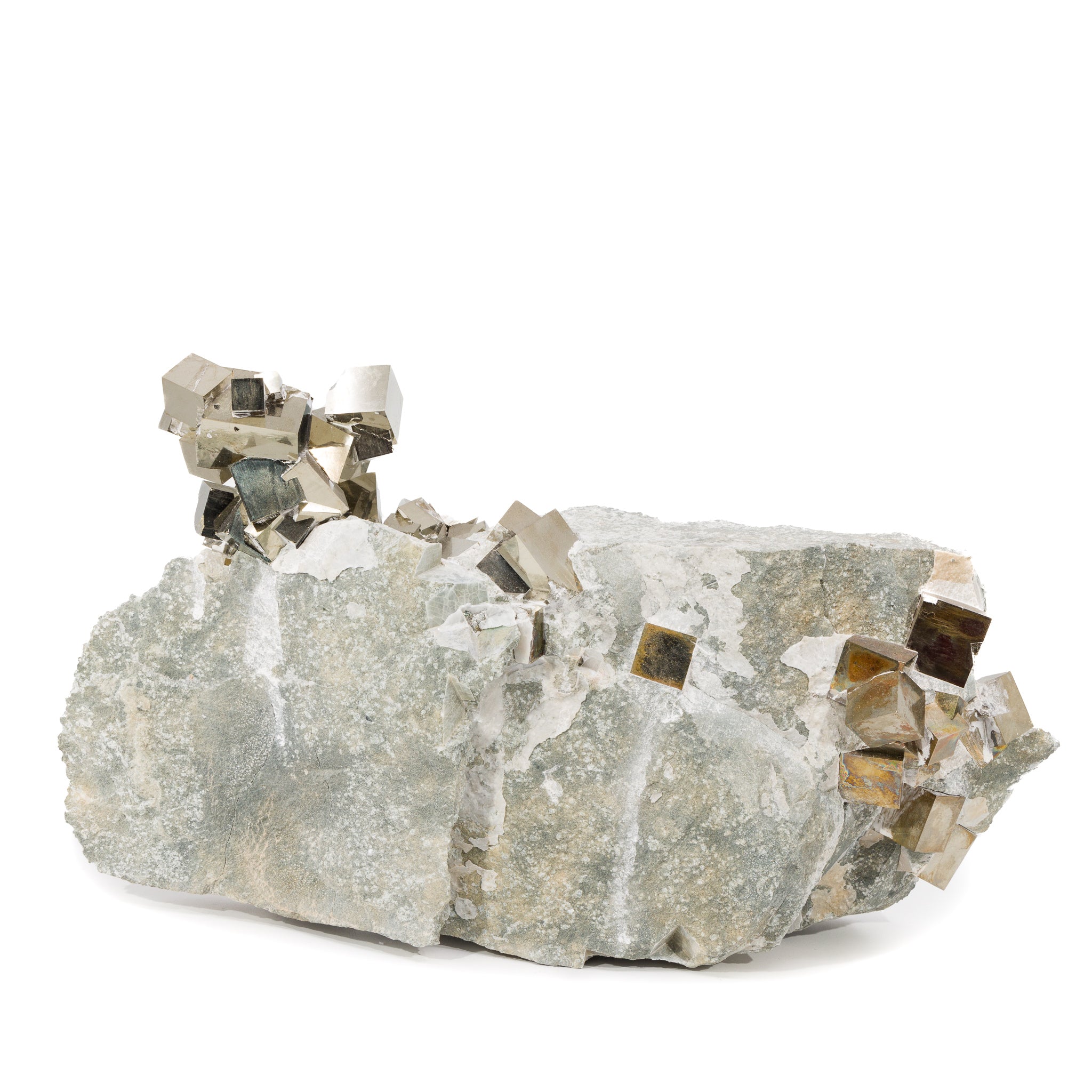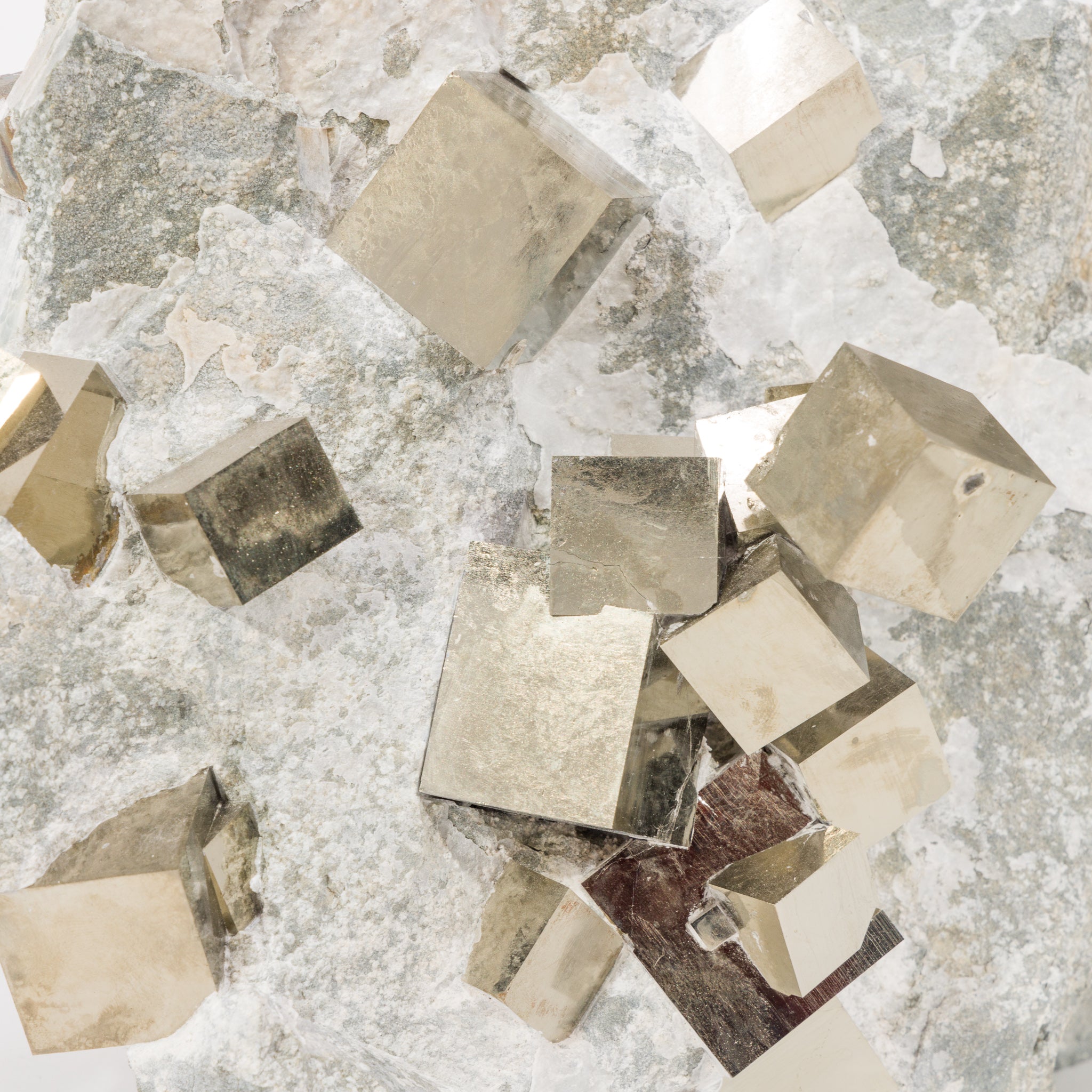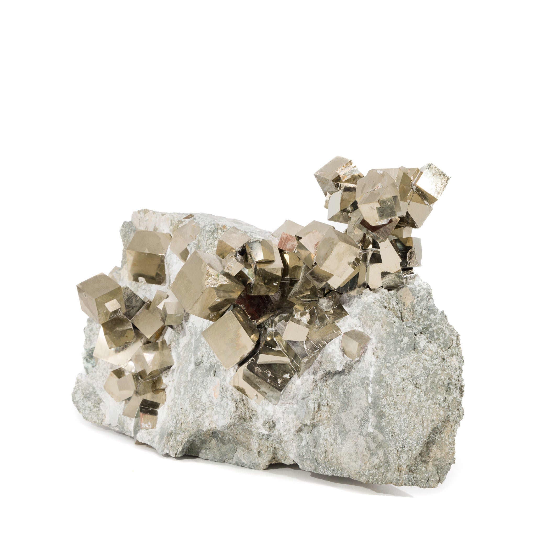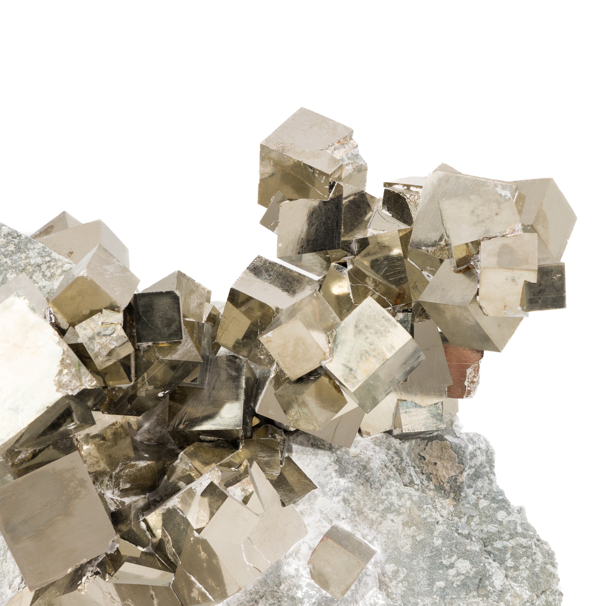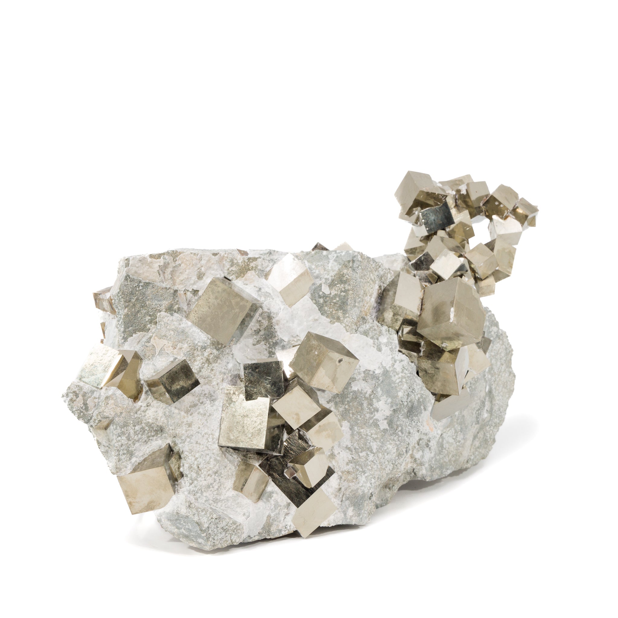Perfect golden cubes of pyrite perch along the surface of a gray marlstone matrix, with a single impressive chain of intersecting cubes arcing upwards to one side.