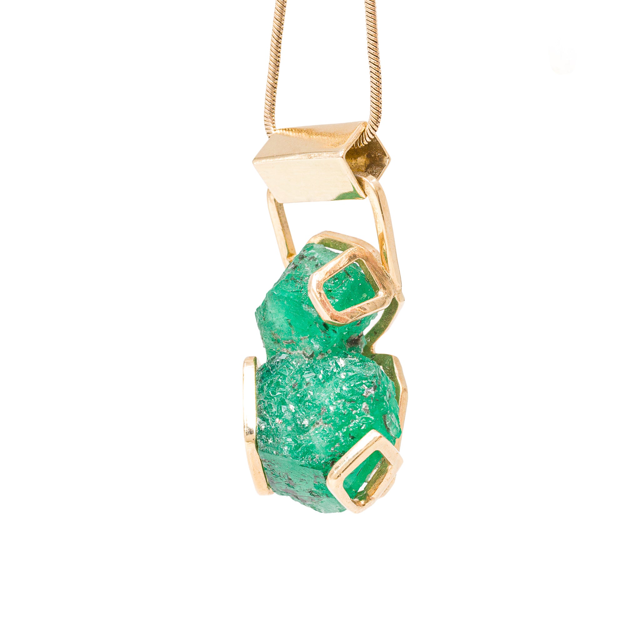 A vivid green emerald crystal cluster sits at the center of this pendant, its surface raw and uneven, with natural planes catching light beautifully irregularly.