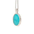 This handcrafted pendant features a vivid Kingman Turquoise cabochon set in polished sterling silver. The stone’s bright sky-blue color, accented by its natural matrix patterning, gives this piece a bold yet timeless presence. The textured bezel enhances the Turquoise’s unique patterning, creating a classic pendant that feels both earthy and refined.