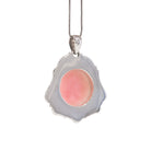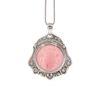 This handcrafted pendant features a delicately carved Pink Opal scarab set within an ornate sterling silver frame. The stone’s soft blush tone brings a gentle warmth, while the scarab carving adds symbolic depth inspired by ancient iconography. The detailed silverwork enhances the piece’s vintage, heirloom-like aesthetic, creating a pendant that feels both meaningful and beautifully crafted.