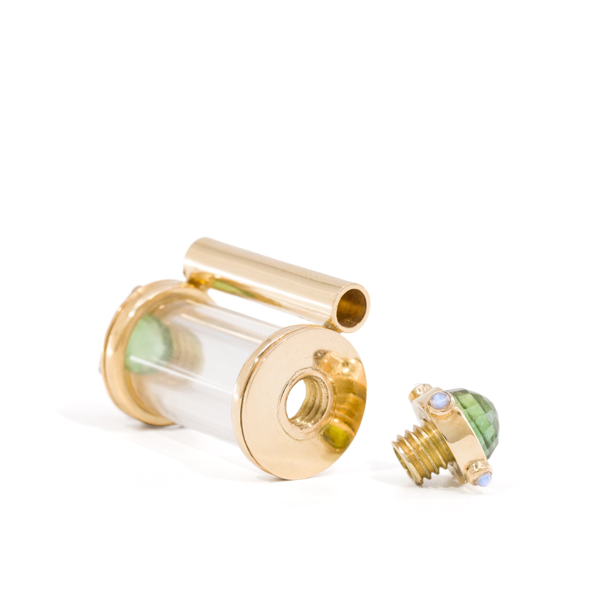 This handcrafted 18k gold gemstone pendant features a substantial polished quartz vessel centerpiece accented with faceted green tourmaline and subtle moonstone cabochons. One side unscrews, allowing you to store precious treasures inside. The gold work is all entirely hand crafted from buttery 18k gold, highlighting the uniqueness of both the stones and the overall design of this one-of-a-kind heirloom.