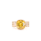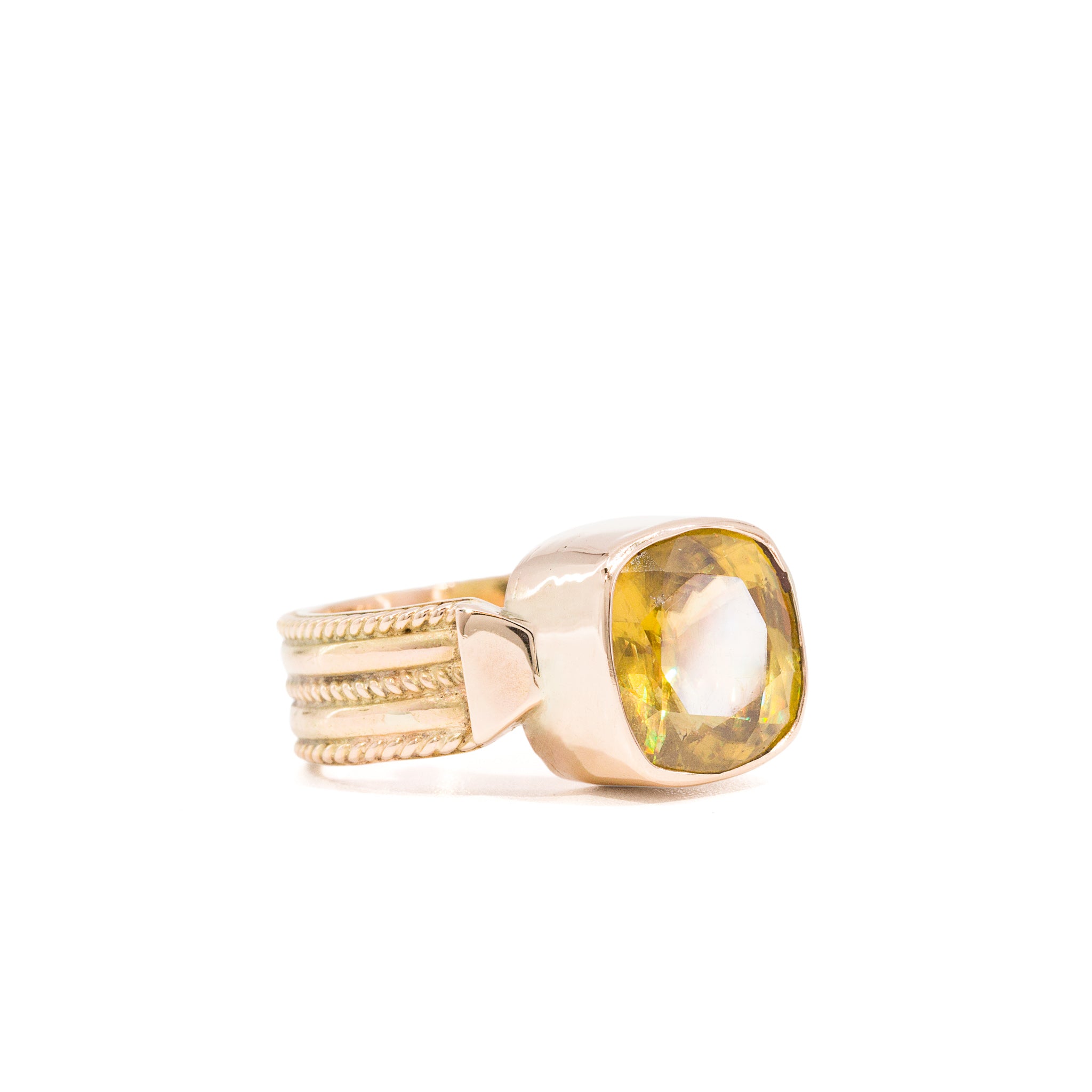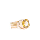 Set in 14k gold, the ring has a sculptural presence, with a softly contoured setting that integrates the stone into the band. The proportions feel balanced, allowing the faceting to remain the focal point without distraction.