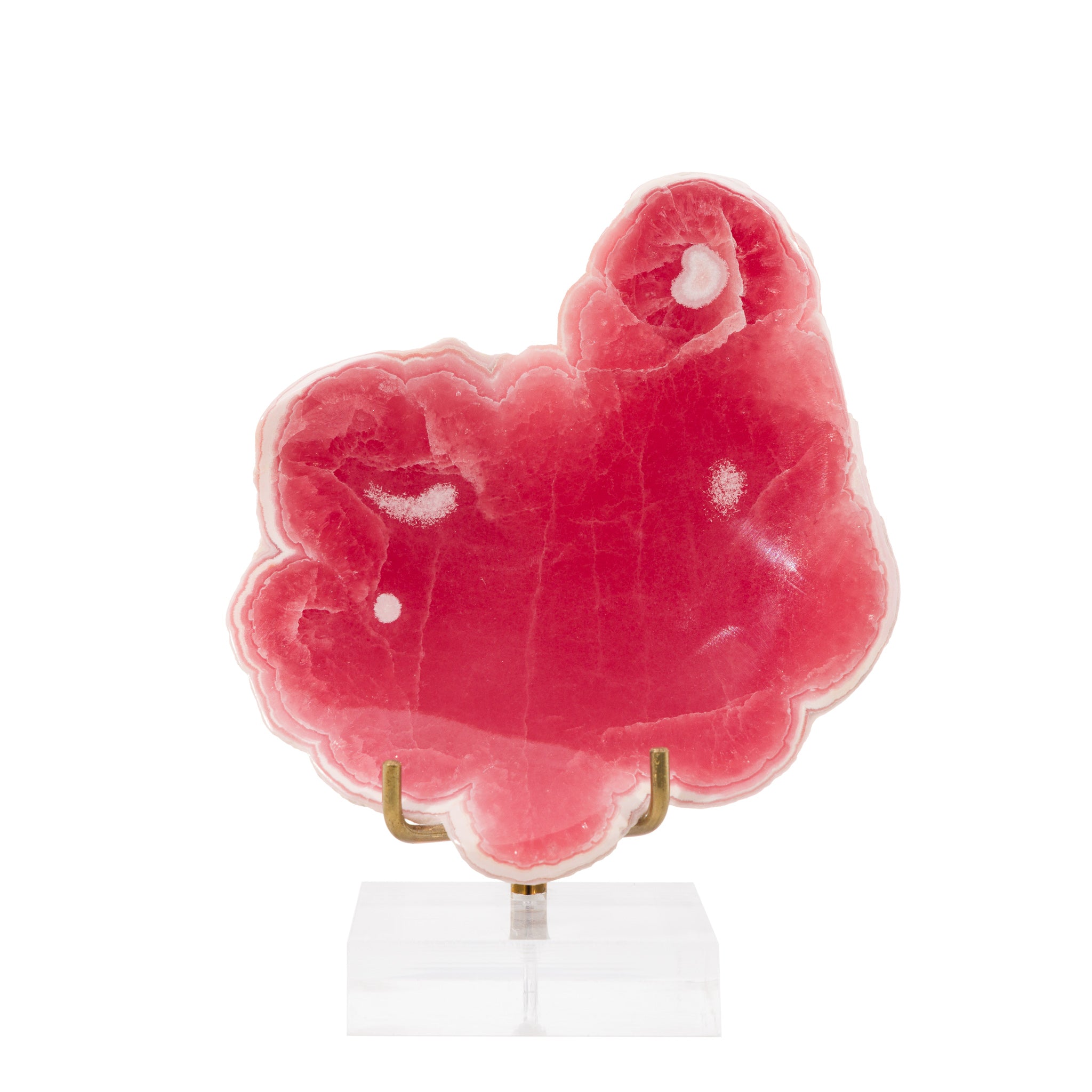 Top tier rhodochrosite has been polished into a charming little dish, using it's natural nodular formation to create the overall shape. The backside has been left unpolished, adding a rustic flare to this exceptional crystal specimen.