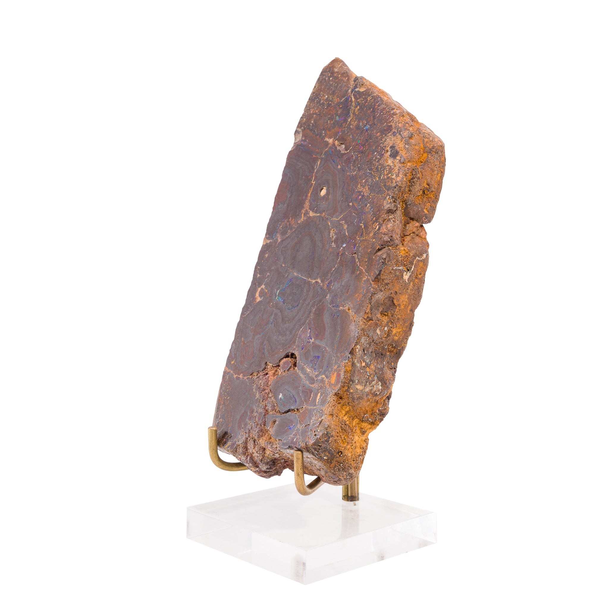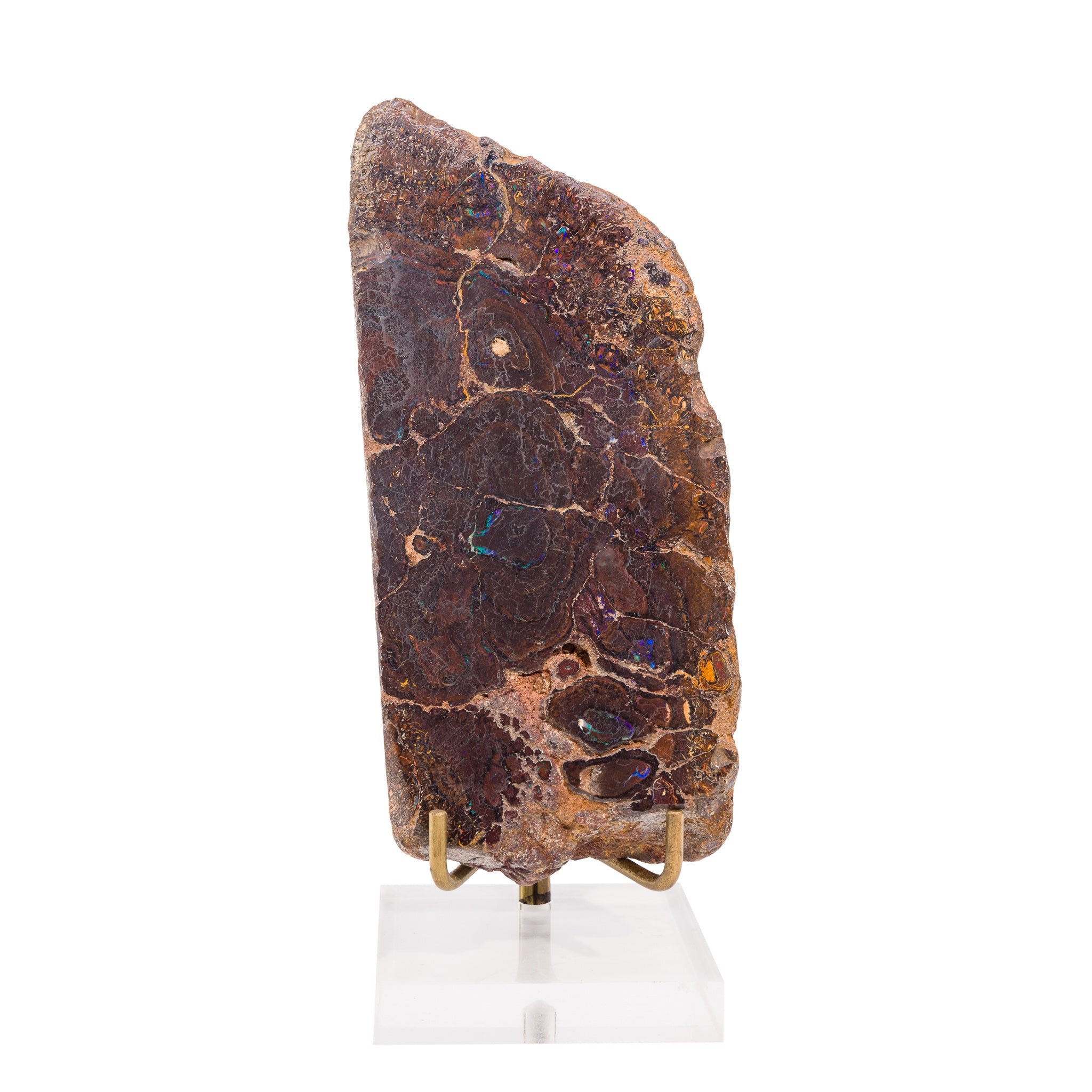 Rich topographical patterns of ironstone unfold across the surface of this polished piece of boulder opal from Australia, with pinfire opal sparkles creating small rivers through the earthen scenes. A beautiful collector's piece!