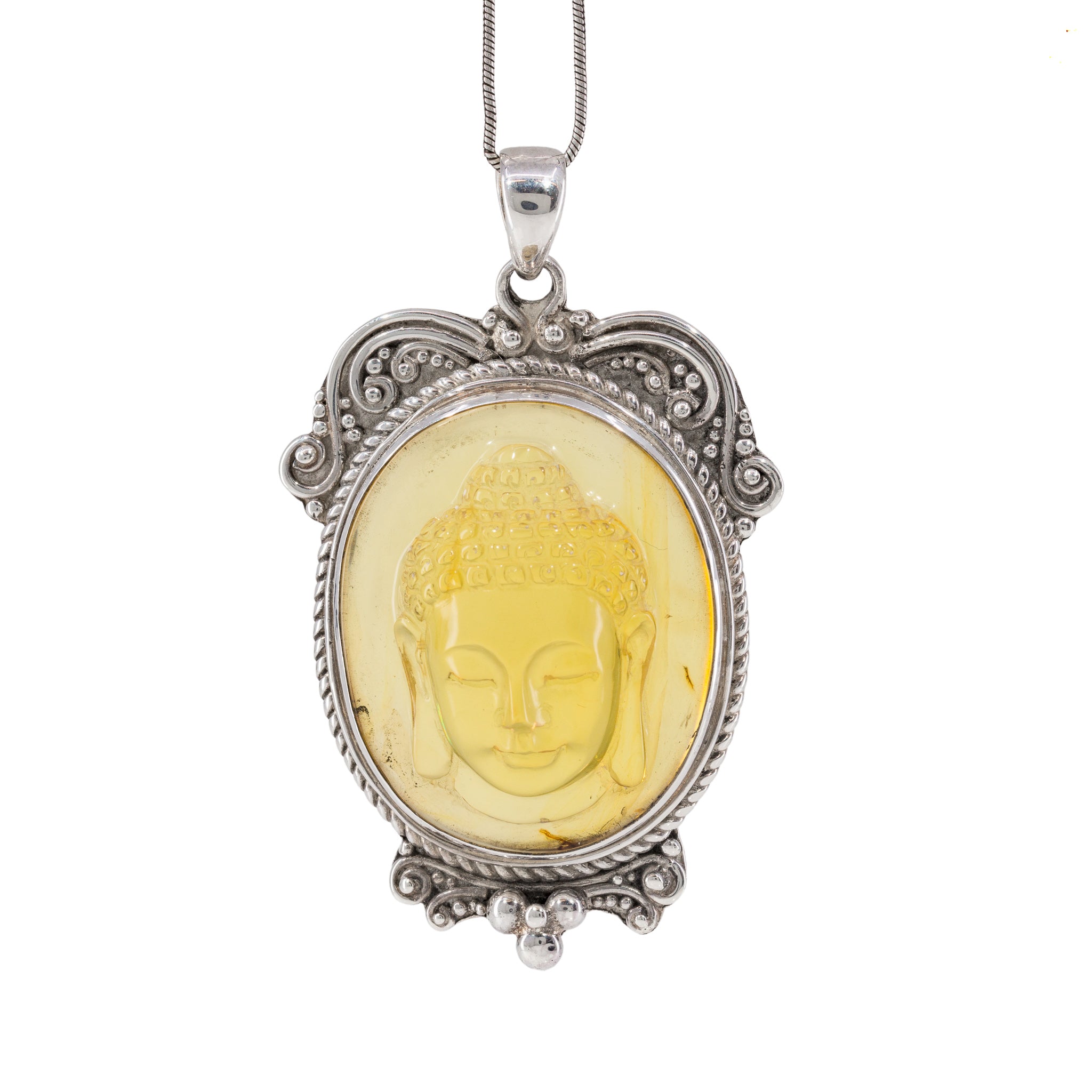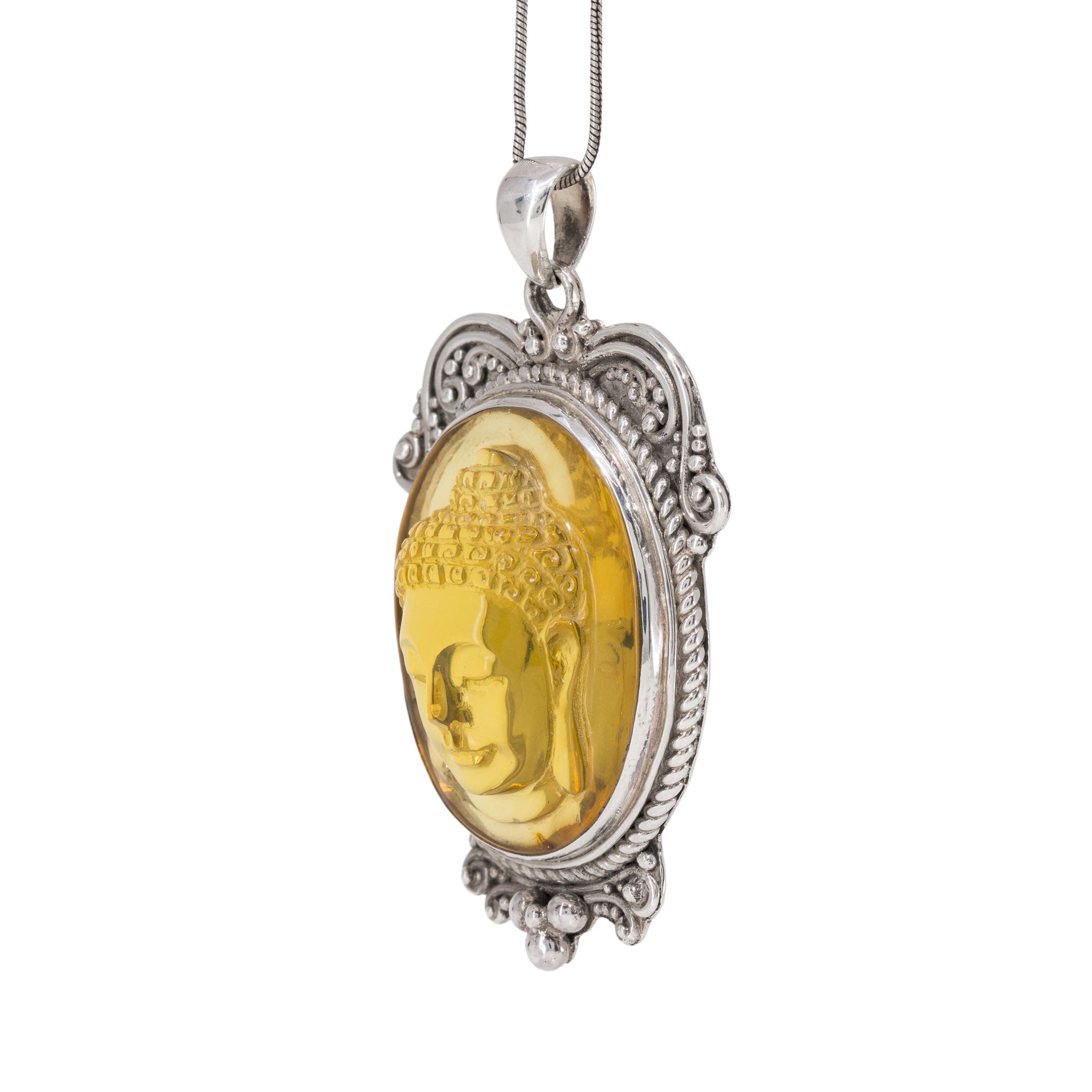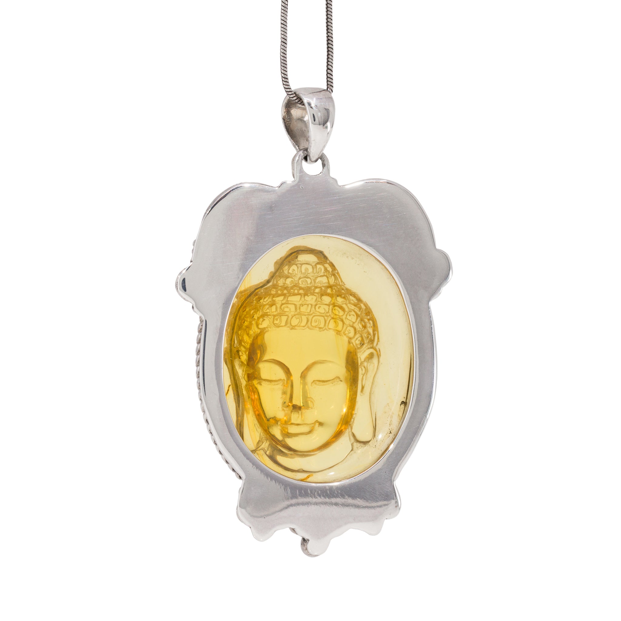 Amber Buddha Sterling Silver Handcrafted Carved Gem Cabochon Pendant