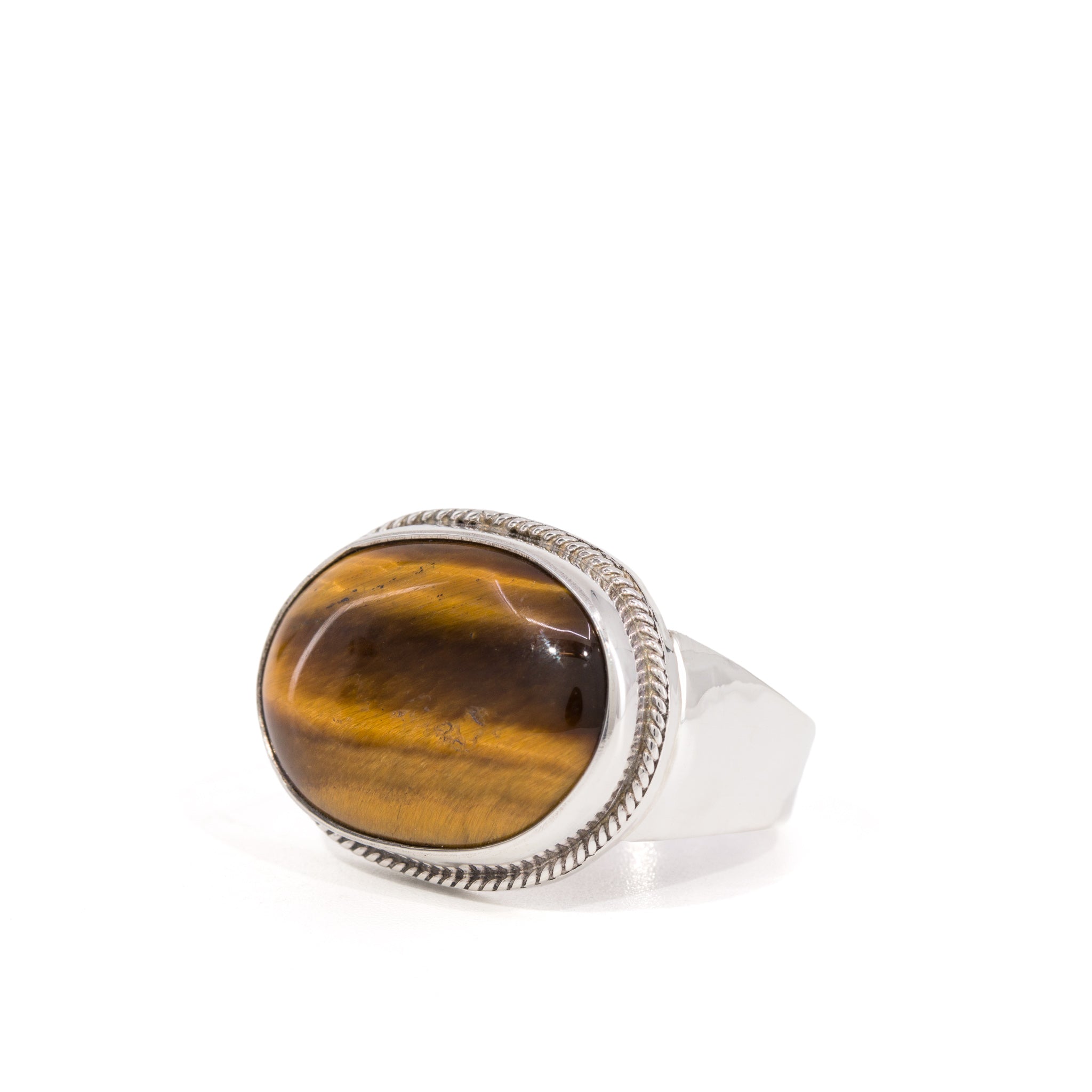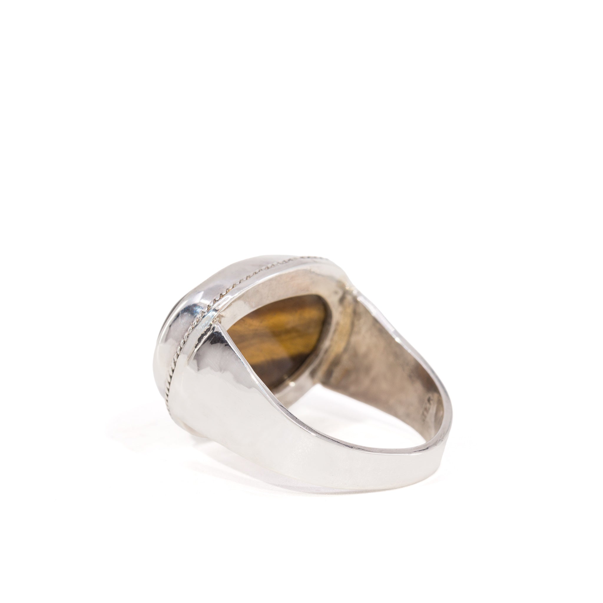 This handcrafted sterling silver ring features a 17.95 carat Tiger’s Eye gemstone with striking golden-brown bands and a natural chatoyant glow. The bold, oval-cut stone is framed in an elegant silver setting with twisted accents, creating a dynamic statement piece that embodies strength and style.