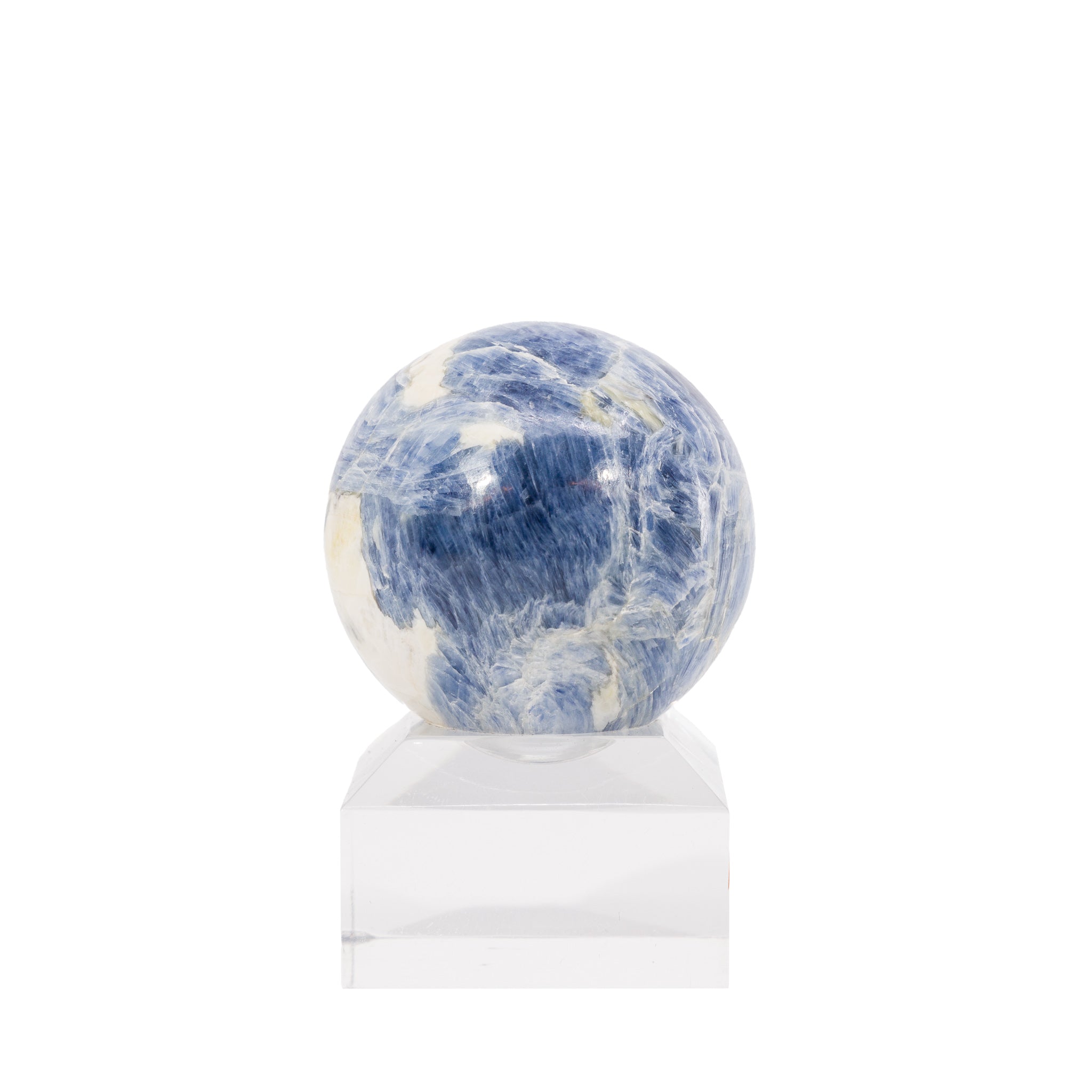 Deep blues and playful patterns are revealed by an exceptional polish in this charming little kyanite crystal sphere! Adorable!