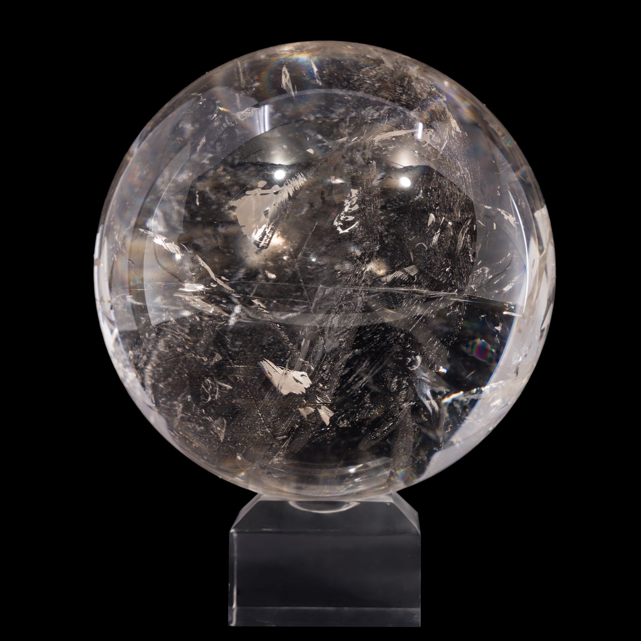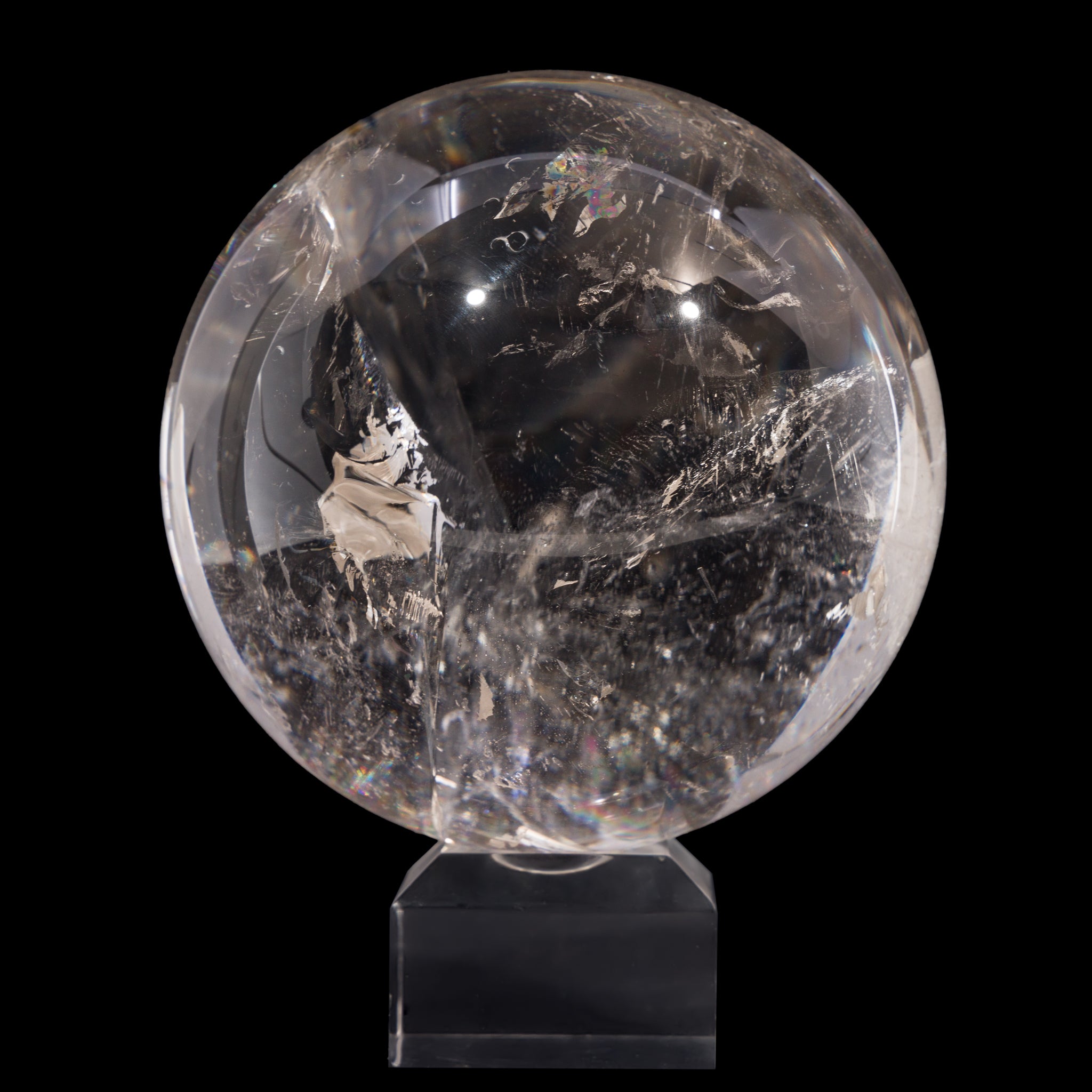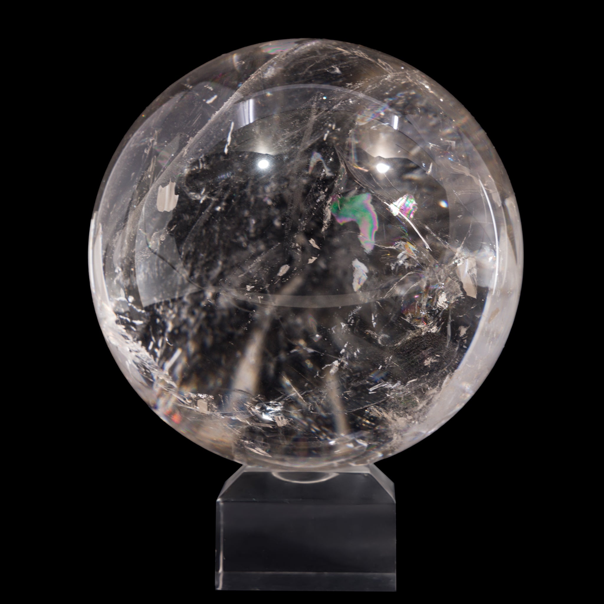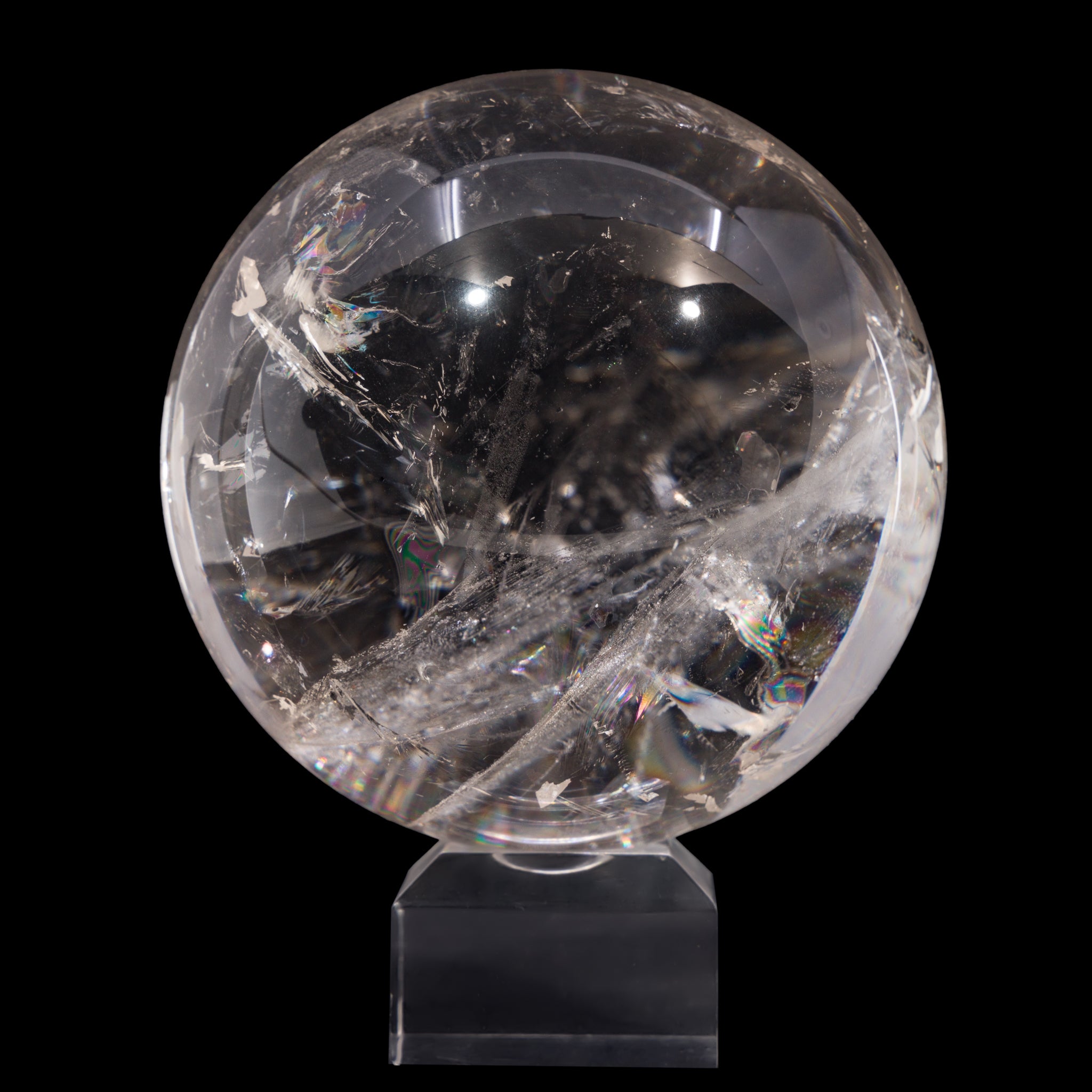 An impressive piece in size, clarity, and overall presence, this quartz crystal sphere offers endless hours of gazing and glamour with vibrant rainbows and mirror-like natural inclusions.