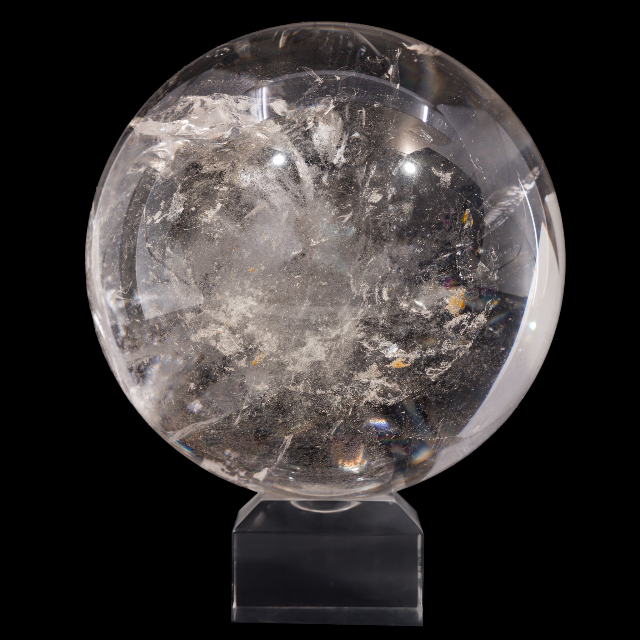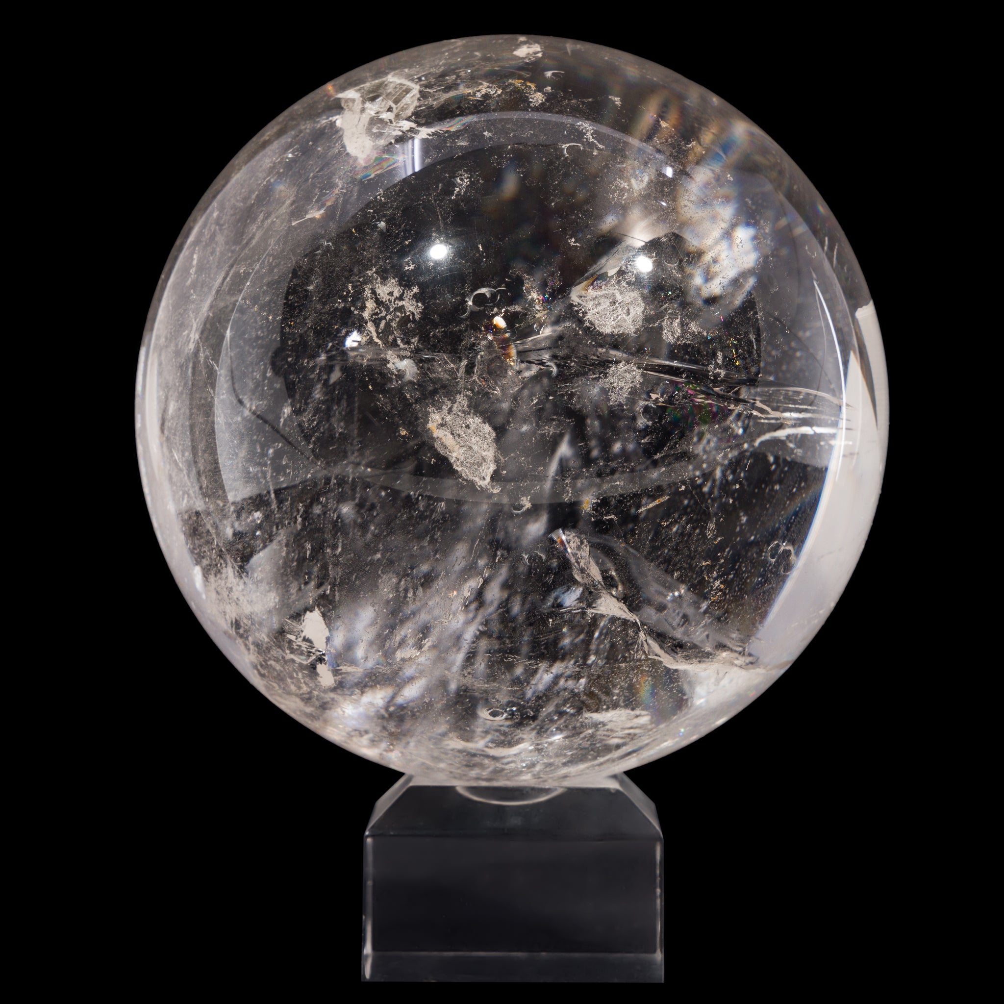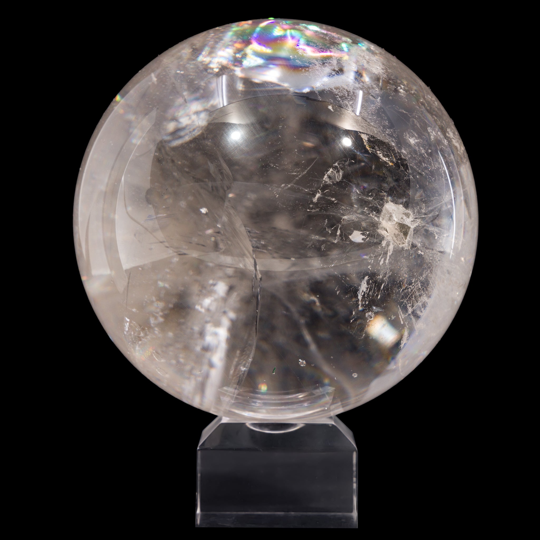 Subtle milky inclusions contrast brilliant quartz and shimmering rainbows in this substantial quartz crystal sphere! This would be a stunning addition to a collection of crystal spheres, or a beautiful way to add some ambience to a desk, home, or altar.