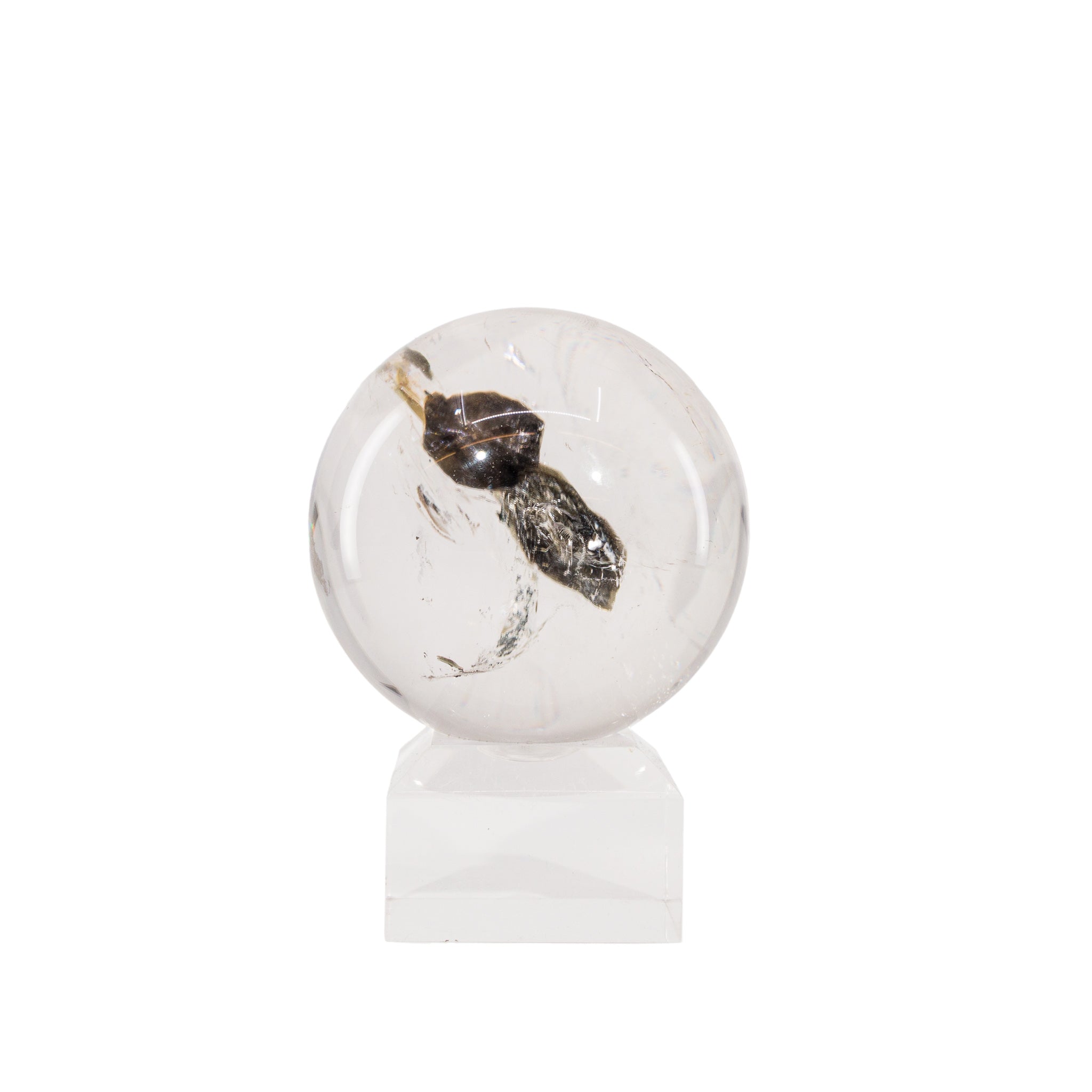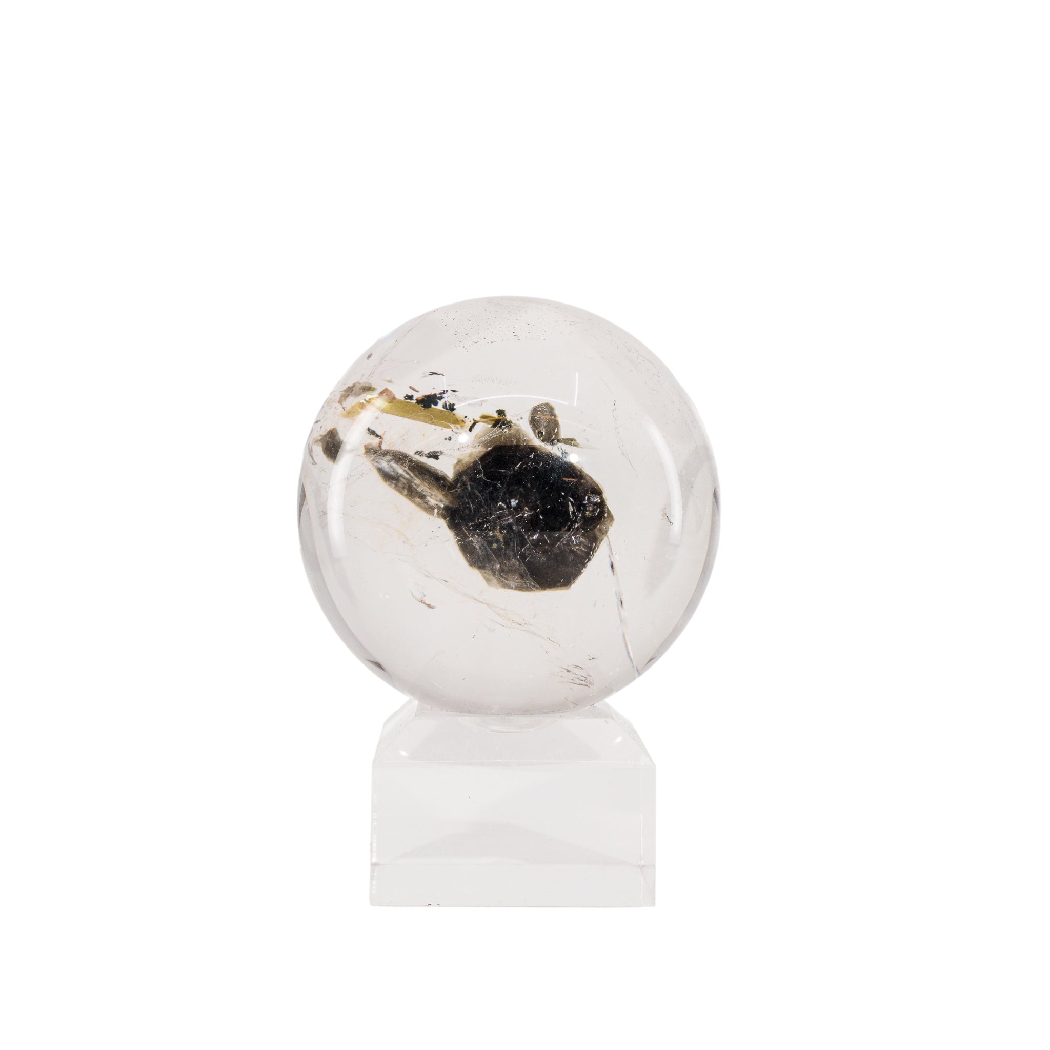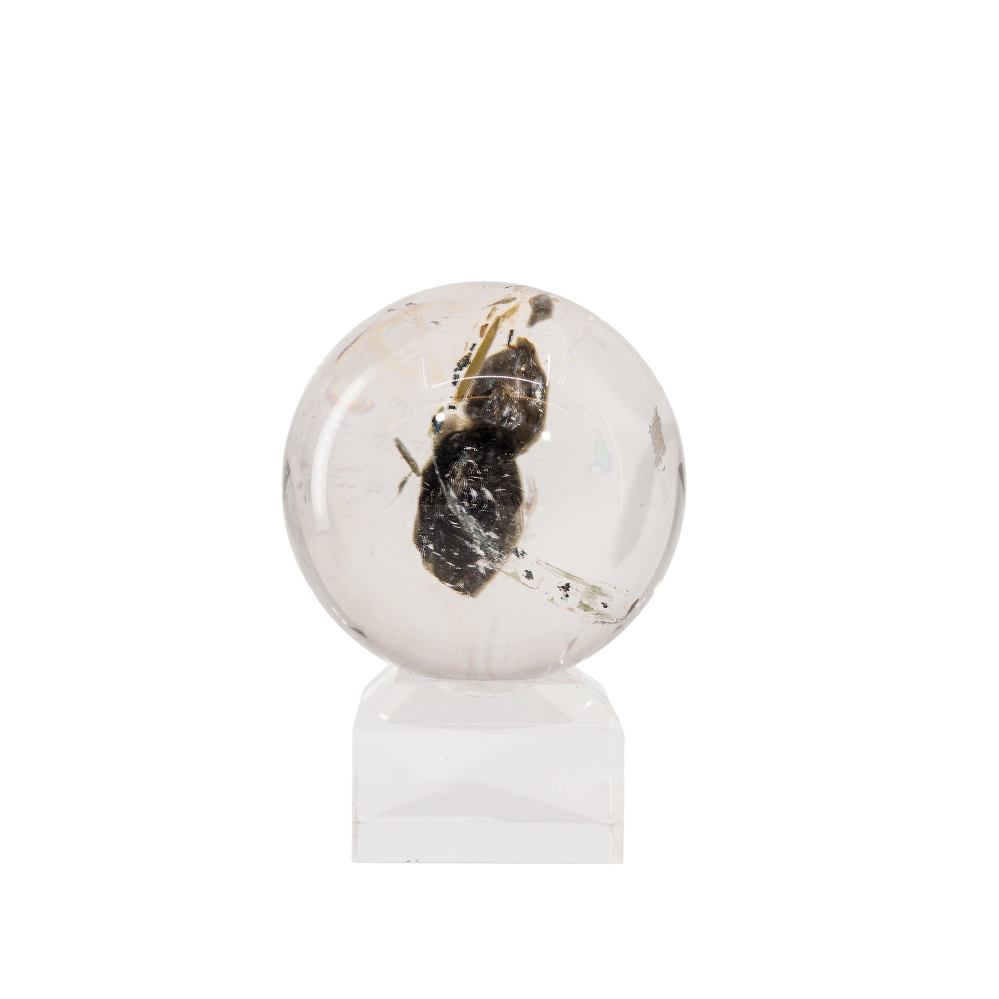 This captivating sphere features two perfectly formed black mica (biotite) crystals interlocked and beautifully suspended within clear quartz. Along the surface, a delicate rosette formation of stacked parallel sheets adds an extra layer of dimension and visual intrigue. Polished to perfection, this piece is not only a geological wonder but also a magical addition to any crystal collection.