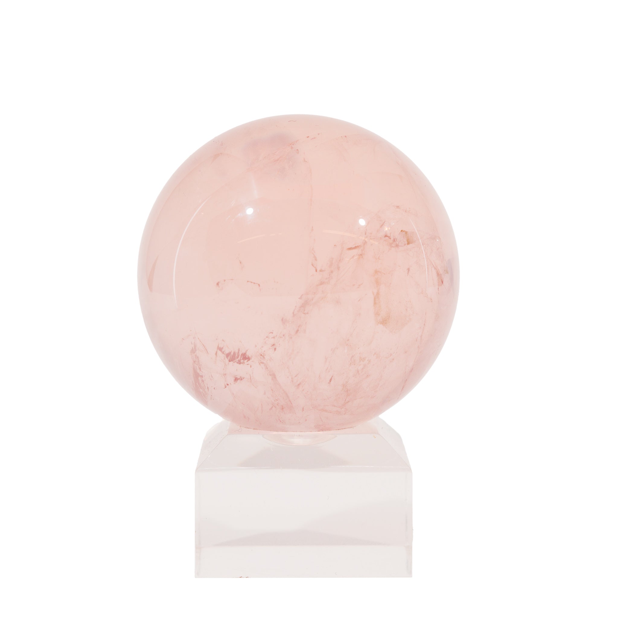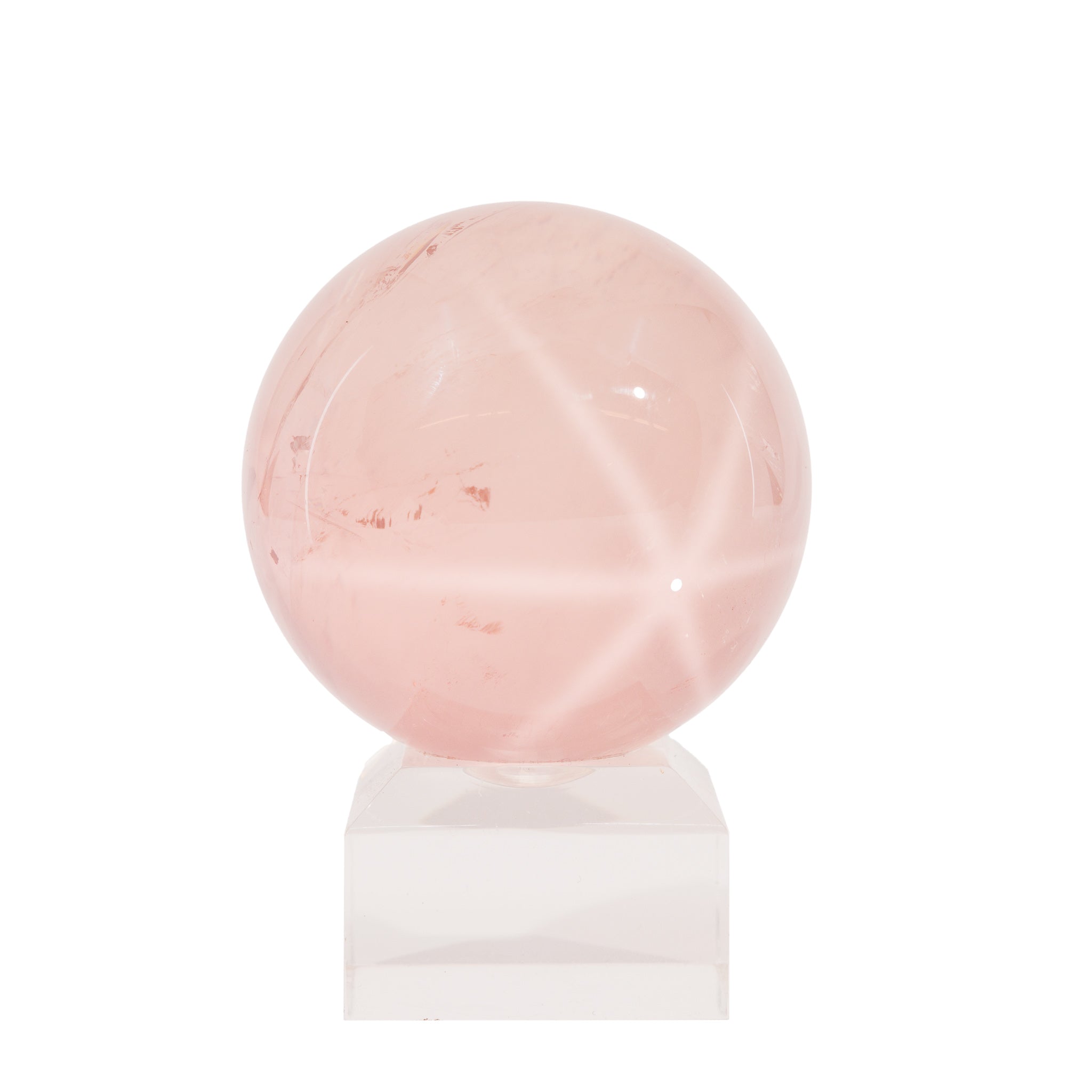 Small but mighty, this little rose quartz sphere has a beautiful pale pink color with an exceptionally strong, sharp 6 rayed star that travels along it's surfaces. In the right lighting it's so strong that it almost appears holographic - definitely be sure to watch the video on this one.