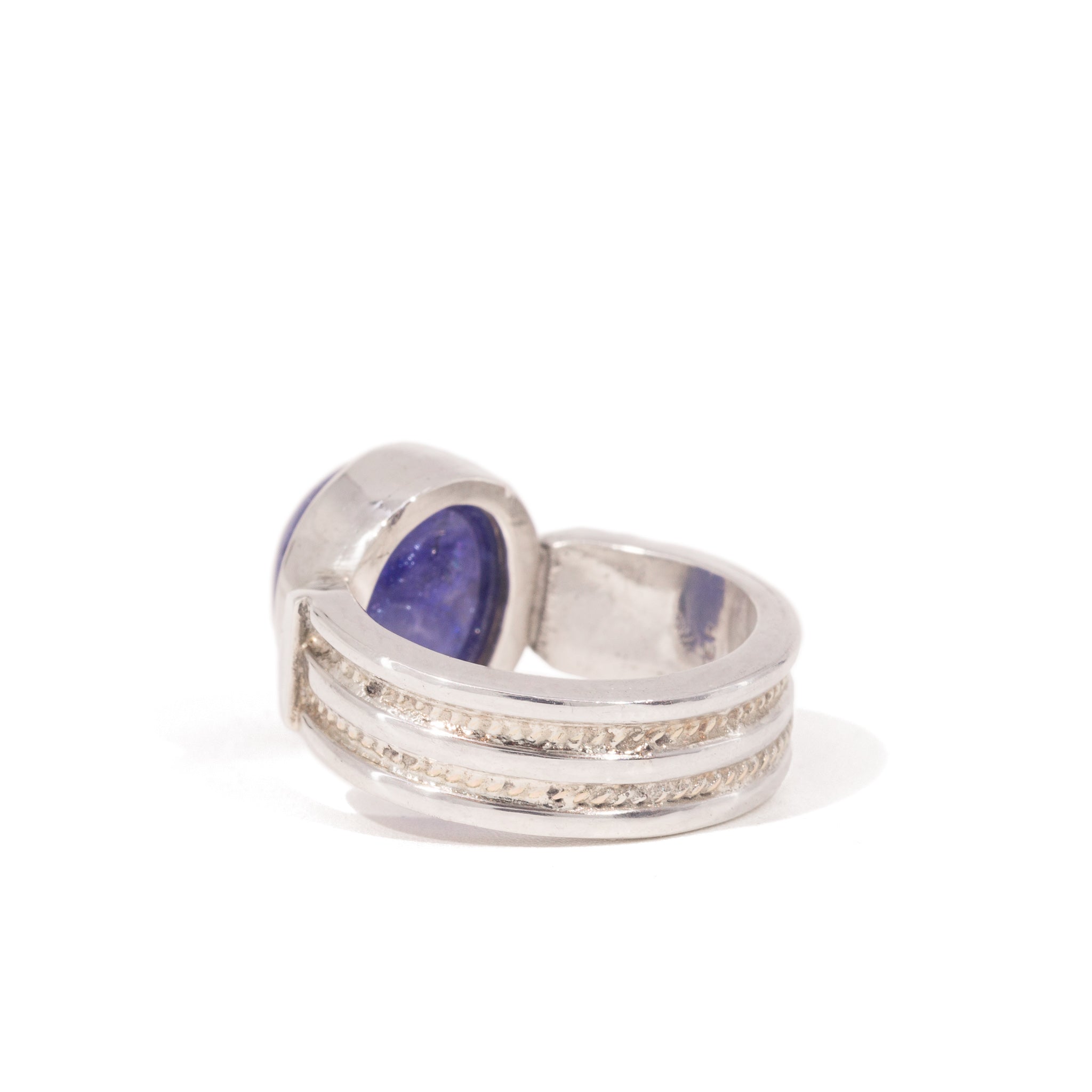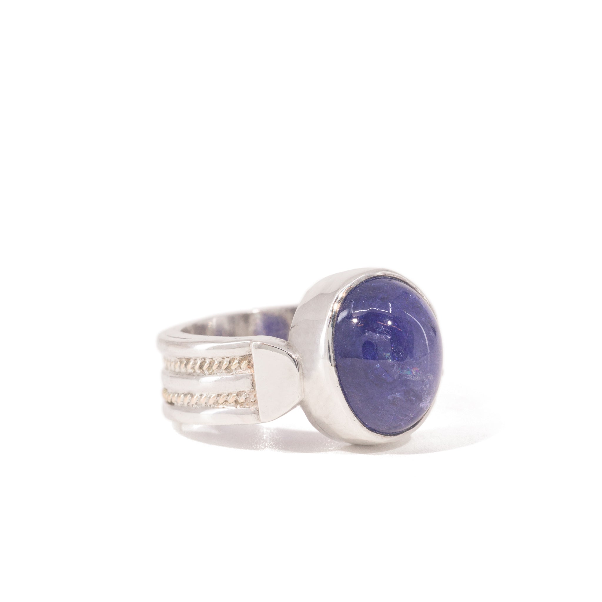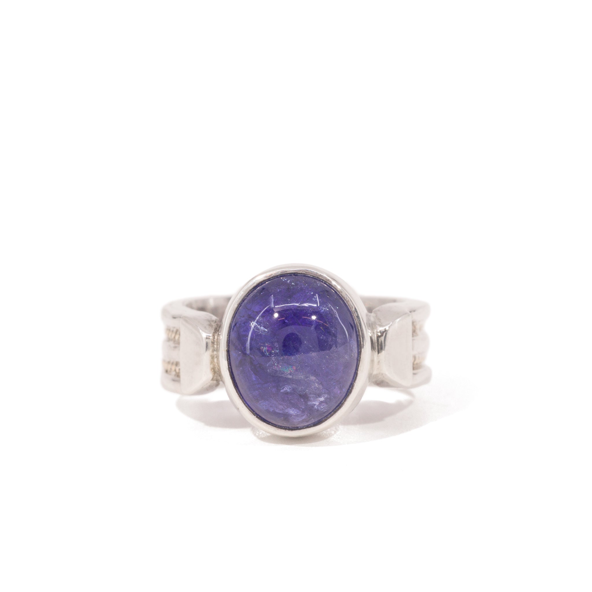 Glittering, Indigo tones within this gorgeous Tanzanite cabochon give this sterling silver thick, braided band ring a deep and mysterious air. A powerful ring for any collection!