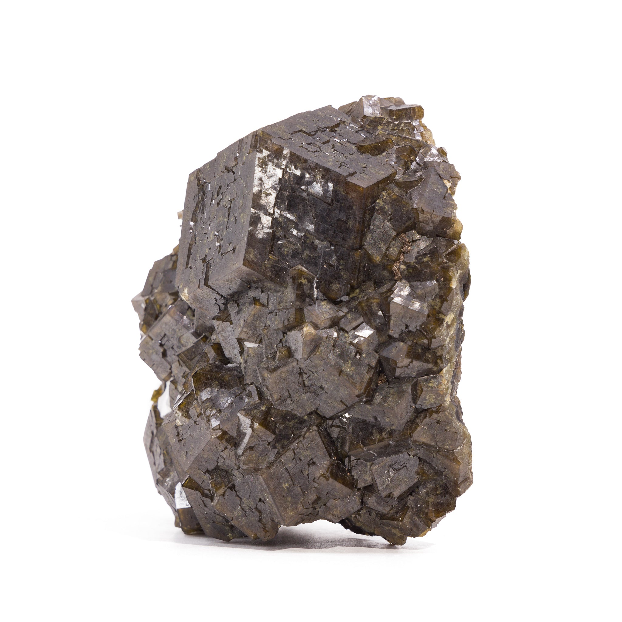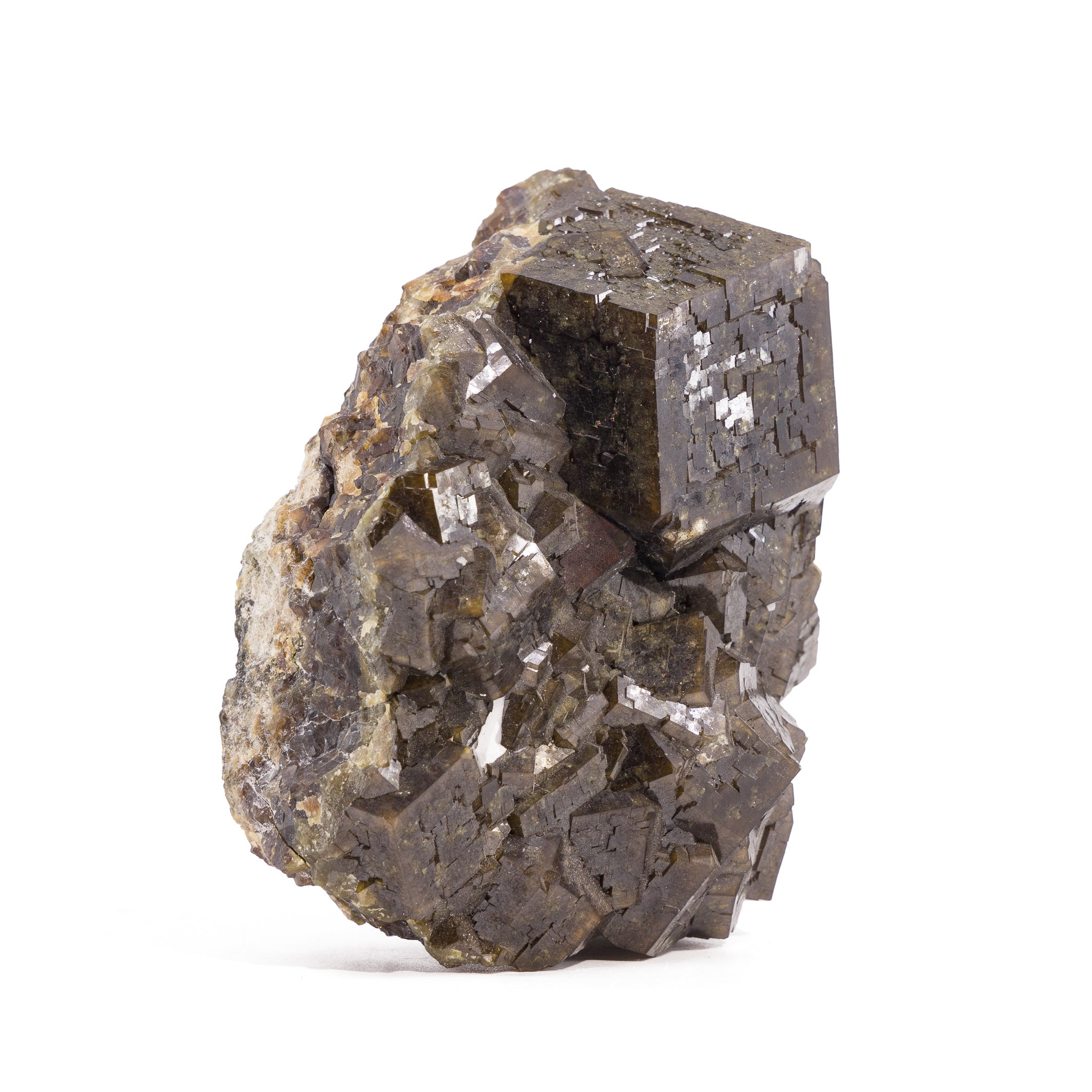 This is a handsome cluster of andradite garnet with dark, olive-green color and well defined stepped growth across the entire piece, especially on the faces of the largest crystal. A substantial piece of a unique material!