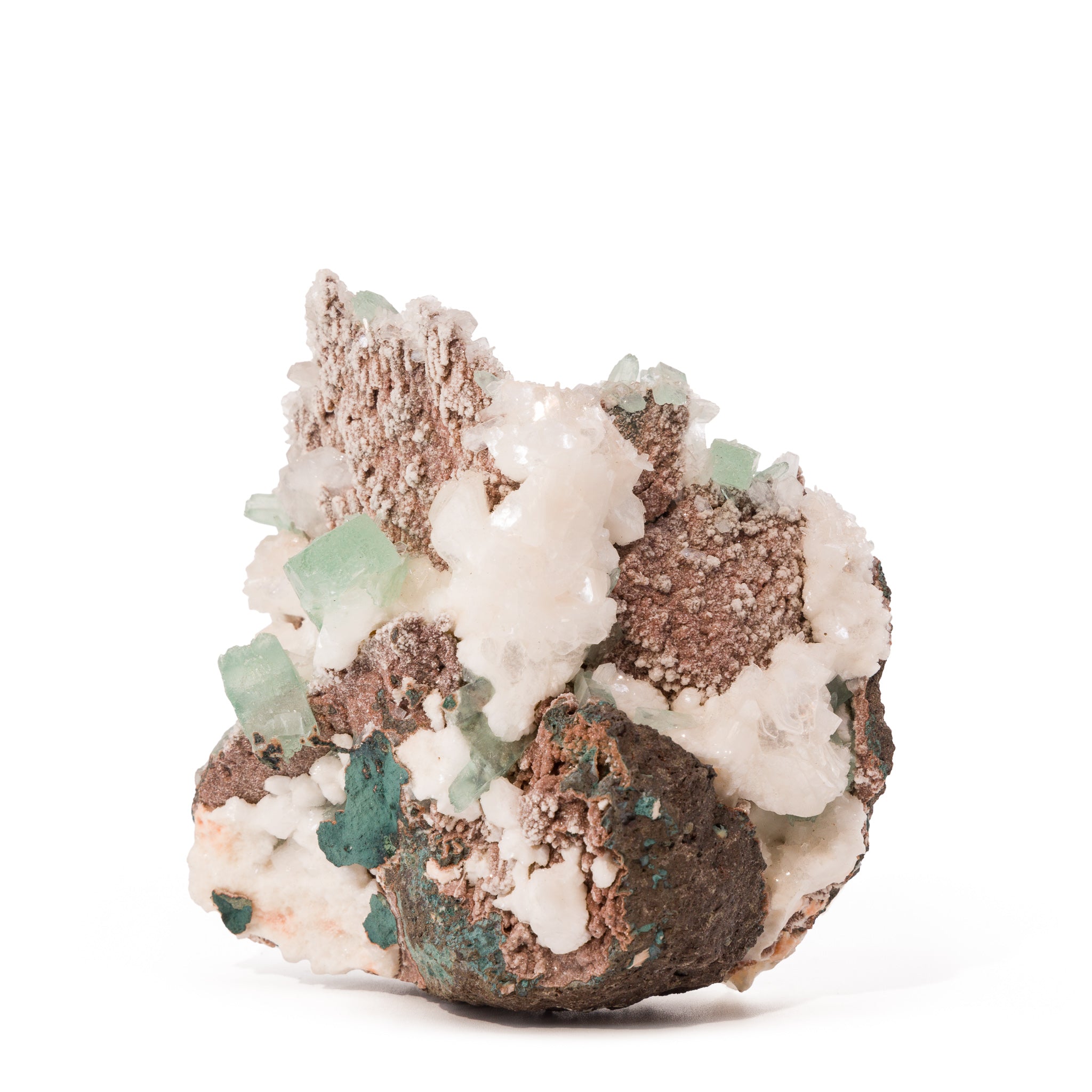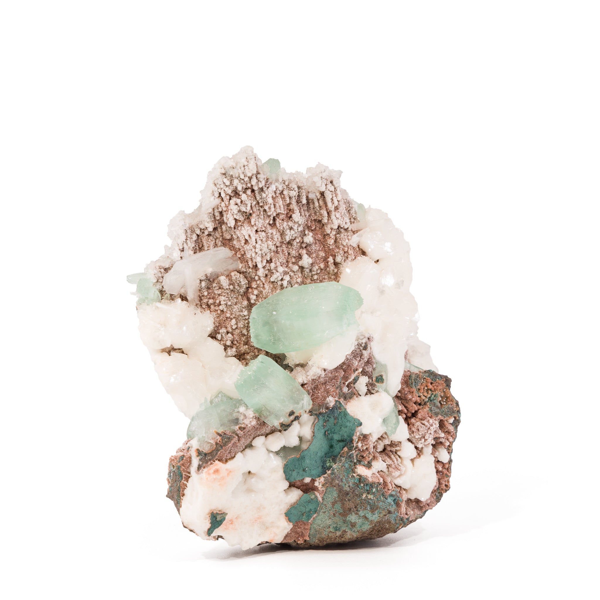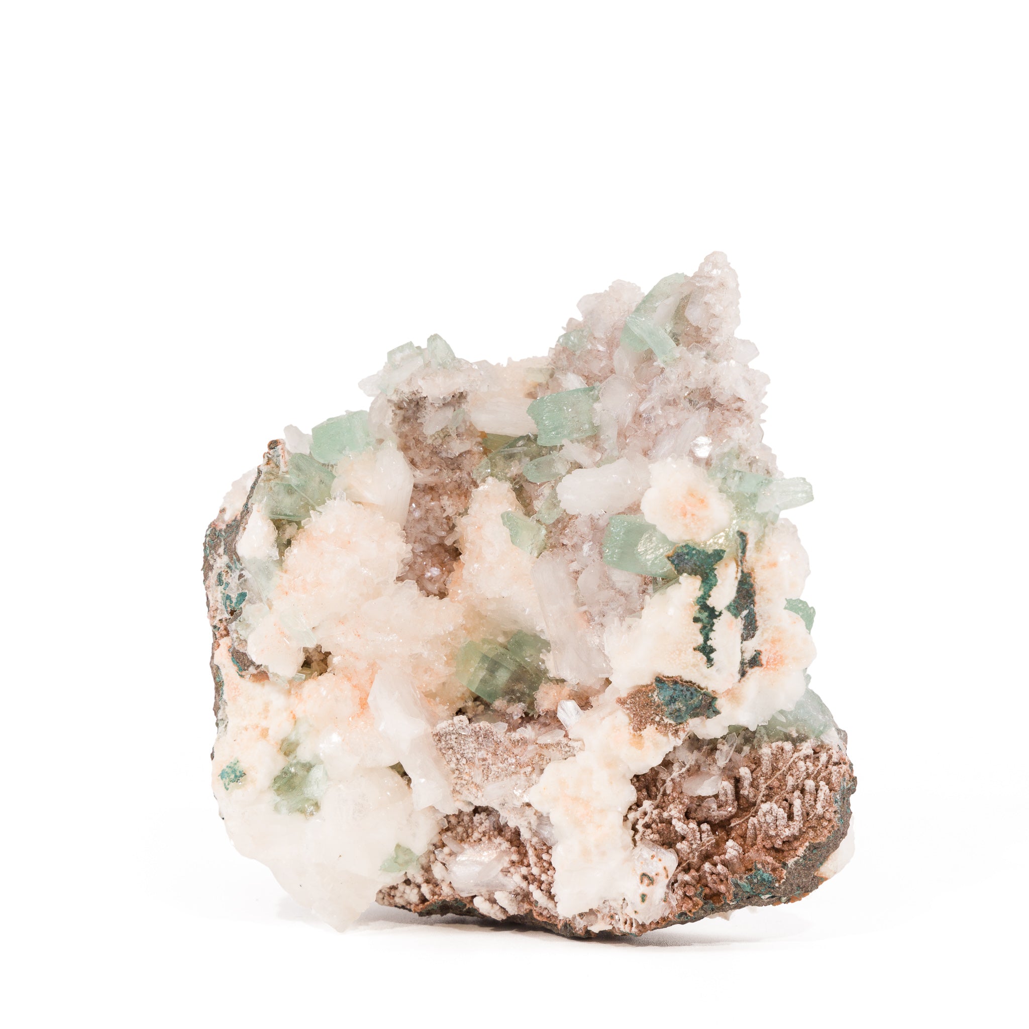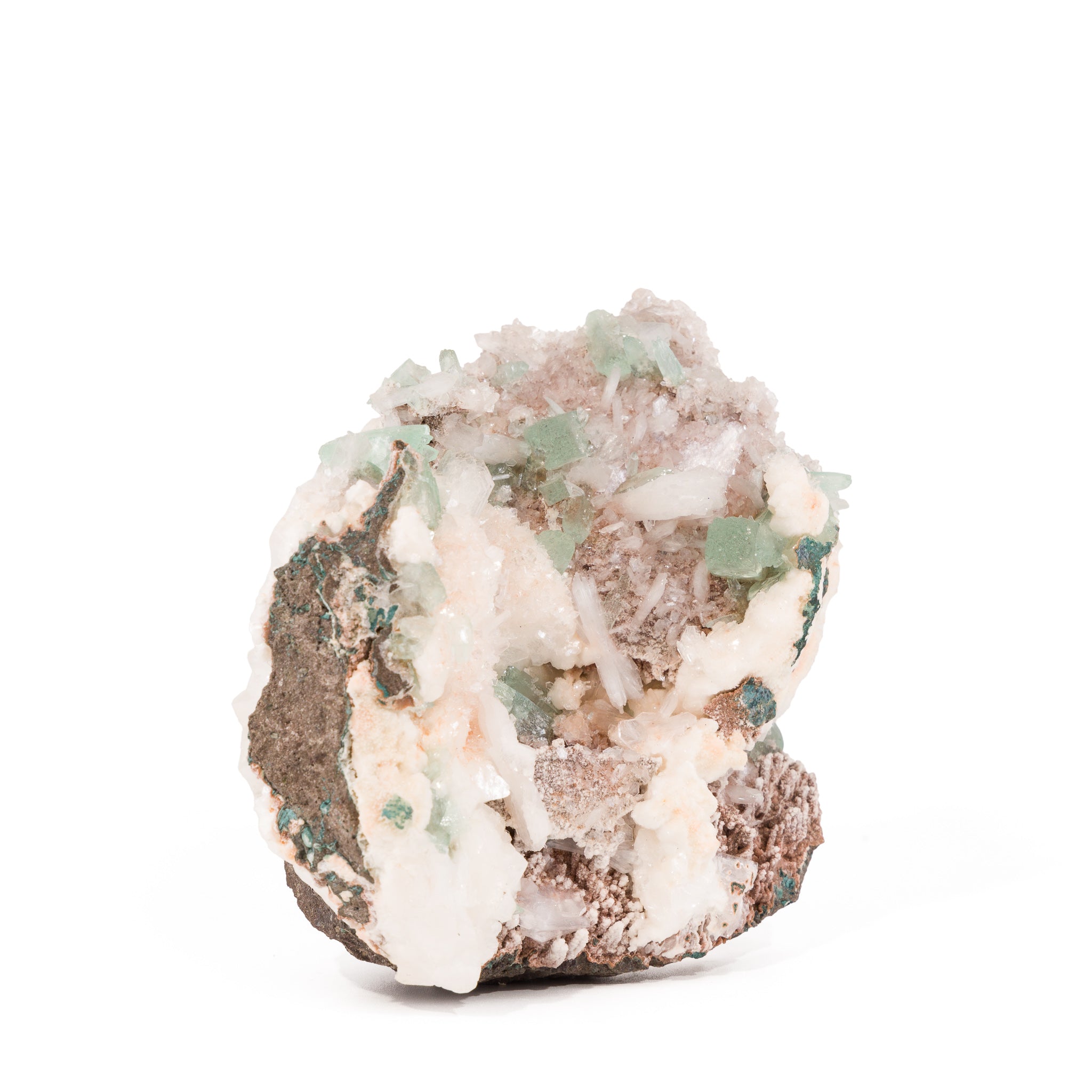 A superb 360° presentation and gemmy, mint green apophyllite crystals are the highlights of this piece, with the added brilliance of silky white stilbite crystals for an extra layer of intrigue.