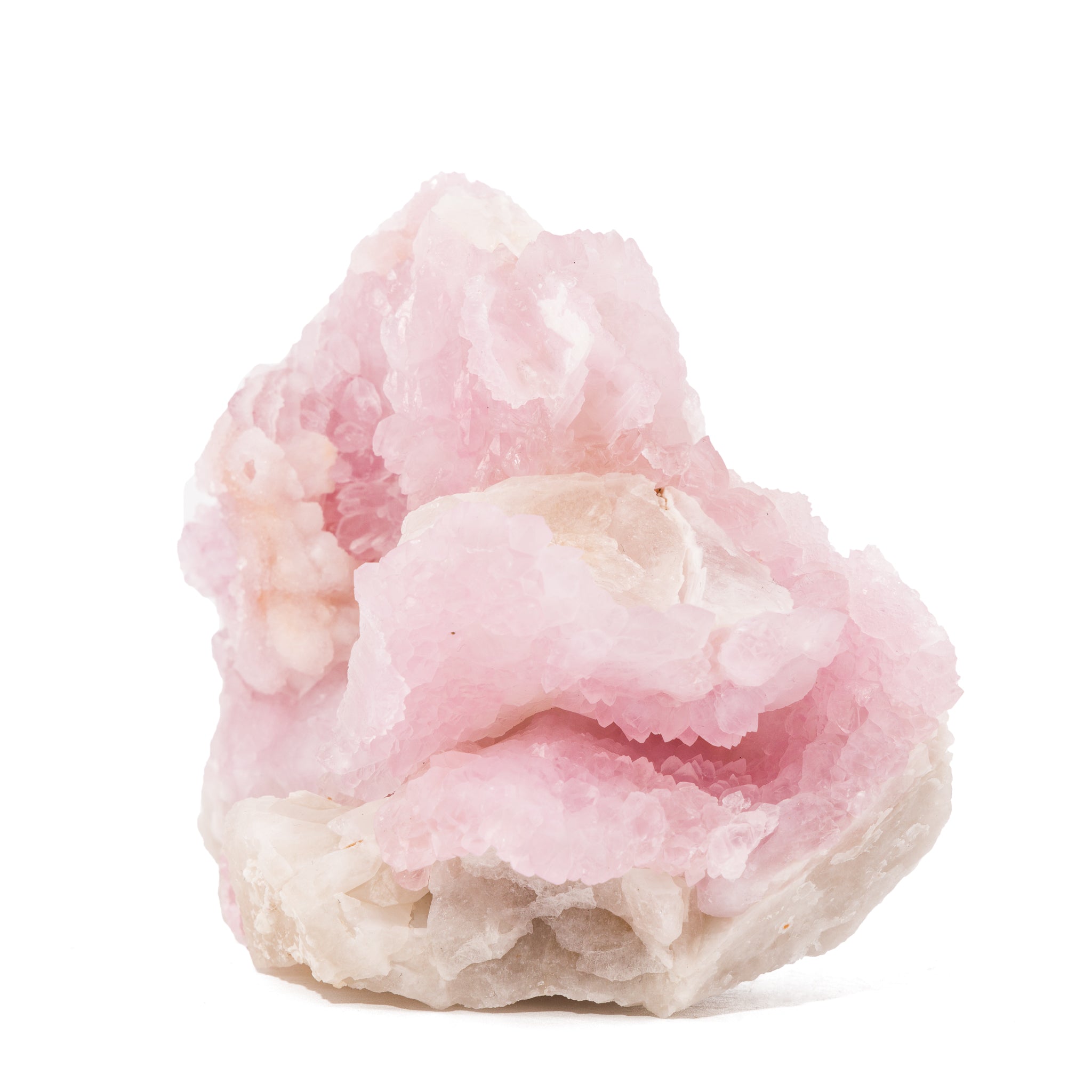 One of a pair of crystals that we are lucky enough to be the caretakers of, this exceptional piece of crystallized rose quartz is one of those once-in-a-life-time pieces that boggles the mind. Beautiful rose pink colors with excellent natural crystallization that forms geode-like pockets. An exceedingly rare formation for rose quartz, especially in this size and quality.