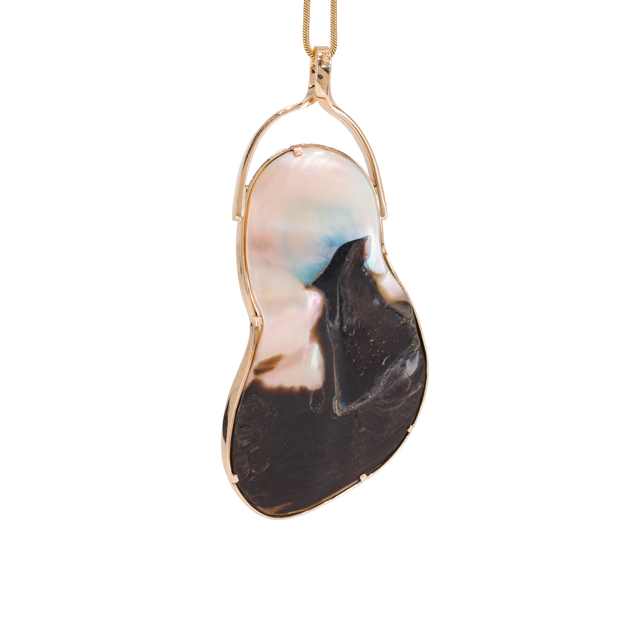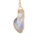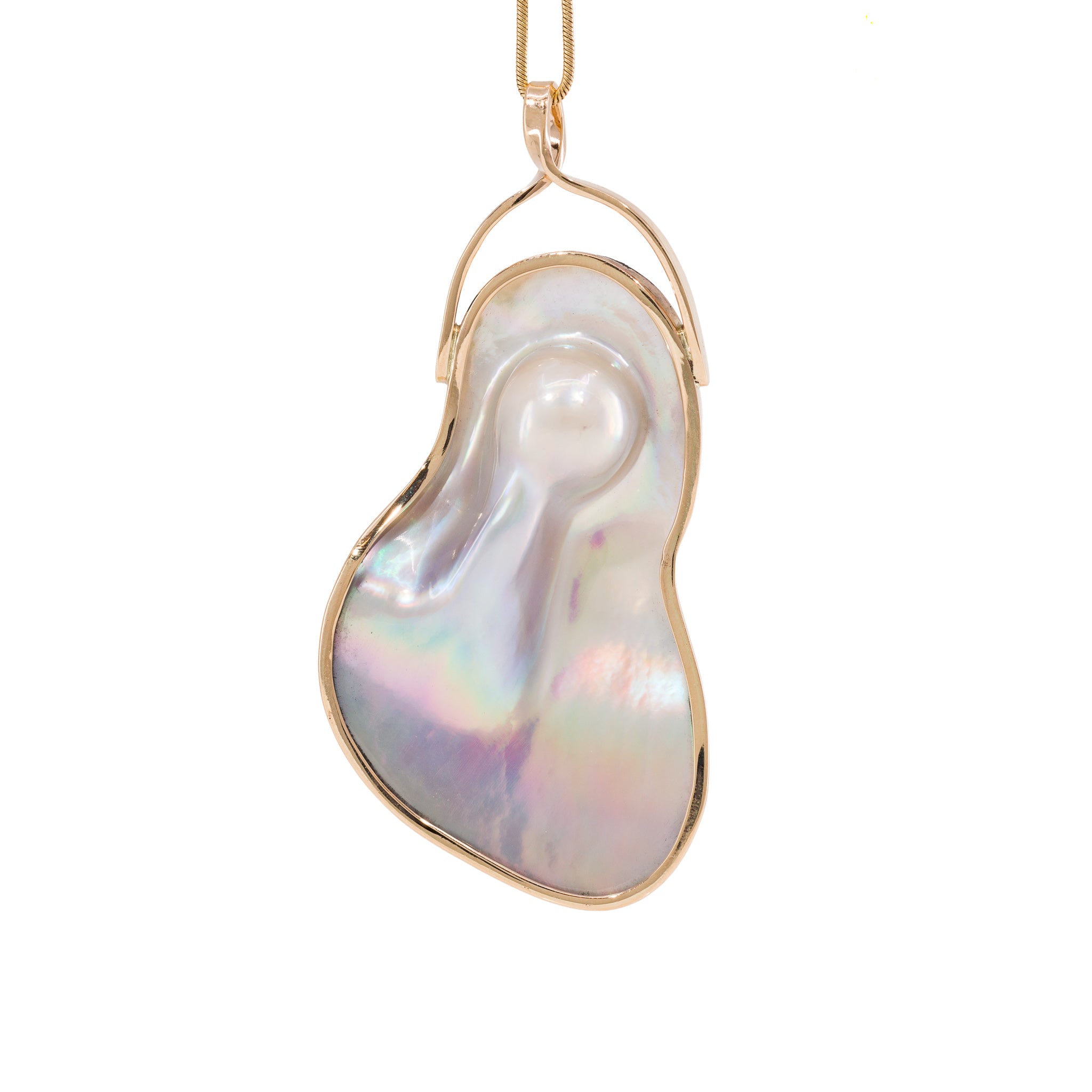 This handcrafted pendant features a luminous Mabe Pearl set in warm 14k gold, highlighting its natural iridescence and sculptural organic form. The pearl’s surface displays shifting hues of silver, rose, and soft gold, creating a fluid, watery glow that changes beautifully with movement. Its freeform silhouette gives the piece an artistic, modern elegance while still honoring the timeless beauty of pearl jewelry.