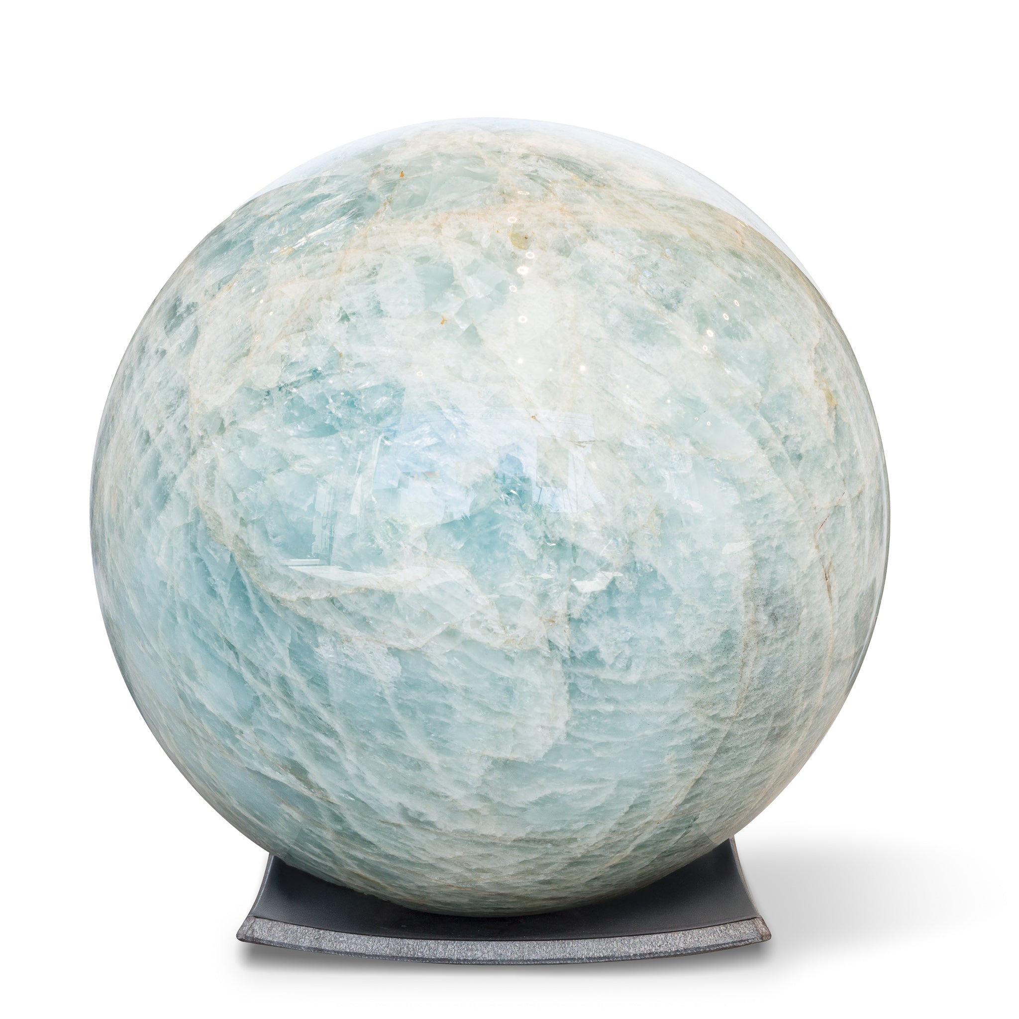 This extraordinary 108.6 kg Aquamarine sphere radiates with serene blue tones that shift beautifully as light dances across its surface. Layered textures within the crystal create depth and motion, while natural inclusions reflect flashes of color and delicate rainbows, infusing the piece with a luminous, almost ethereal presence. A rare collector’s treasure, this monumental sphere is both a statement of natural beauty and a powerful energetic centerpiece.