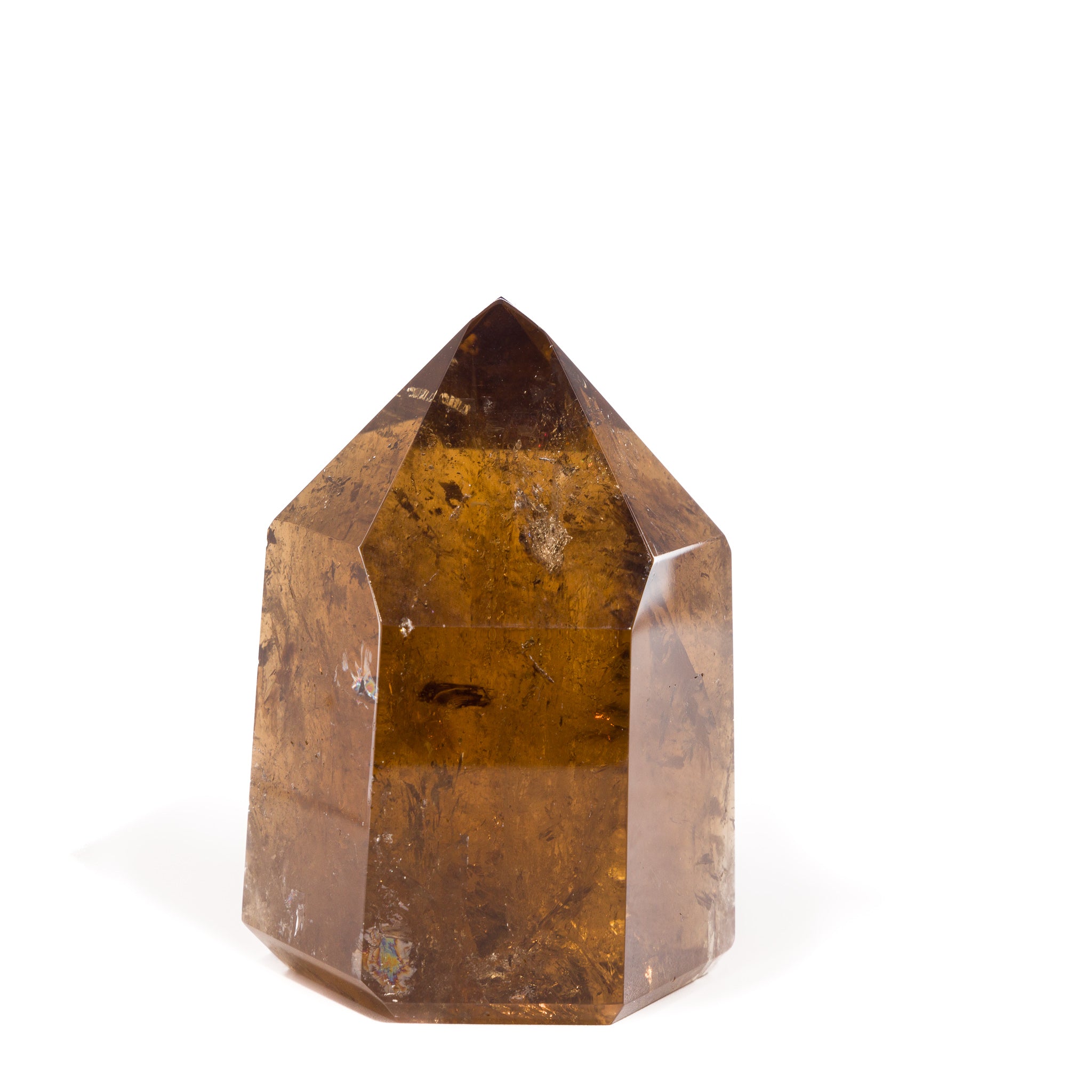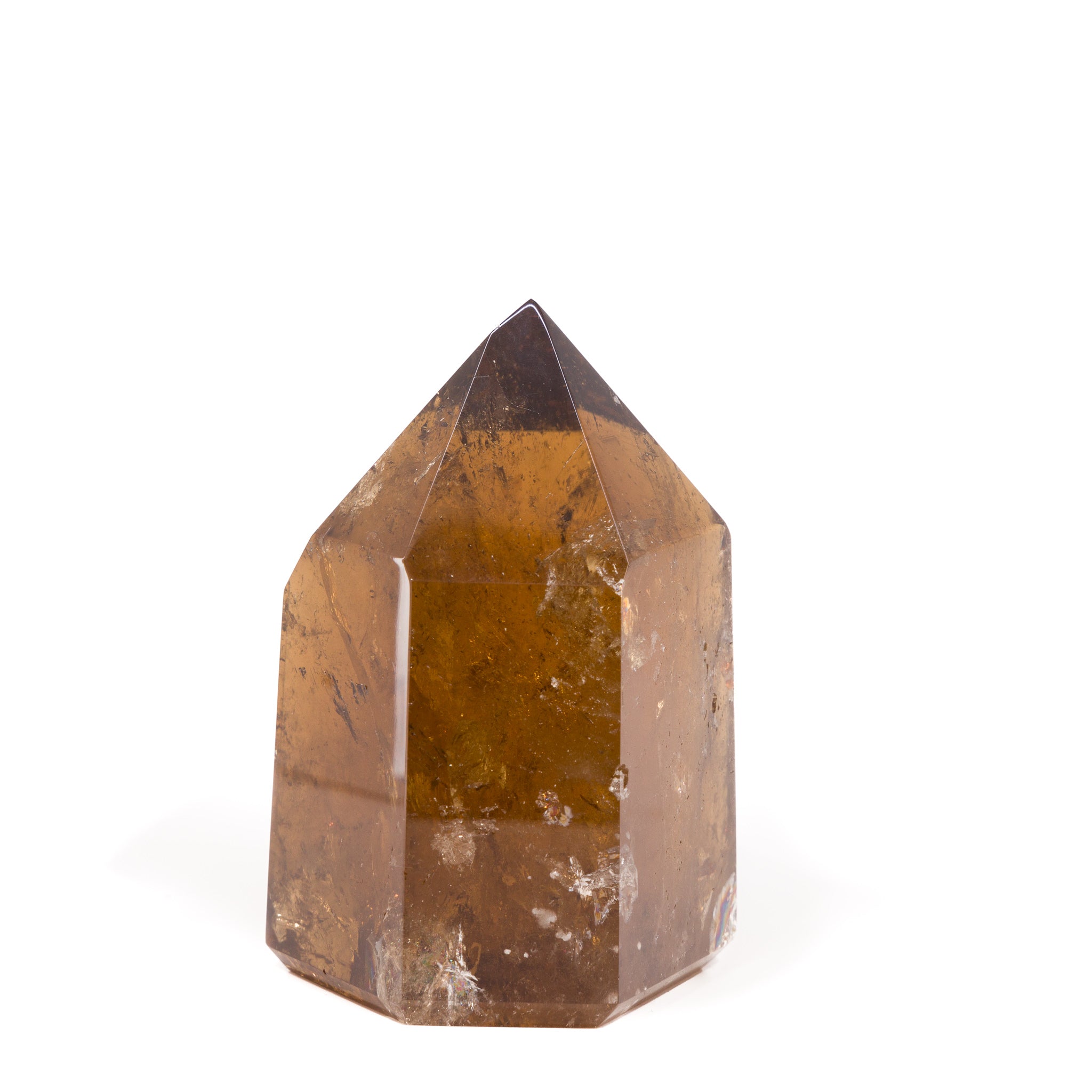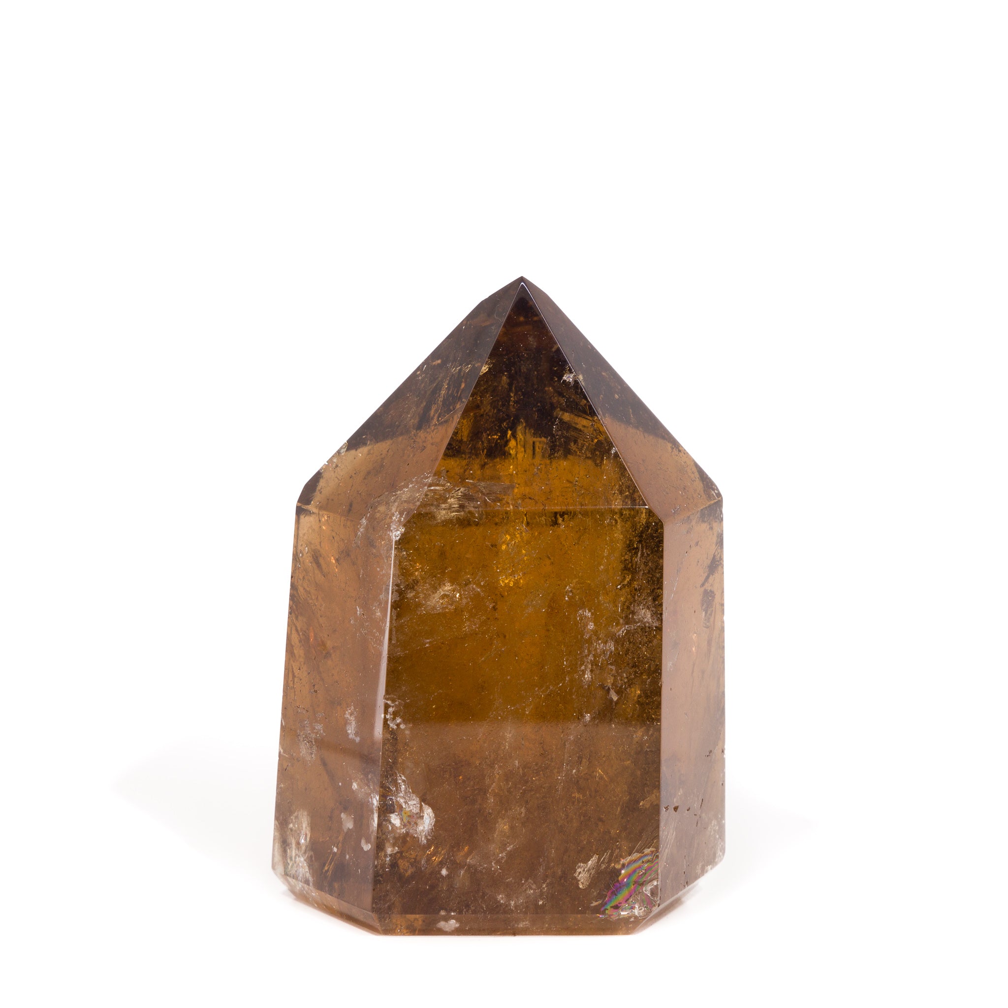 Dark and earthy smoky quartz comes together with sunny citrine to create a rainbow filled crystal with a color rivaled only by the finest cognac. A stunning, naturally colored polished crystal point!