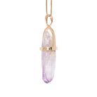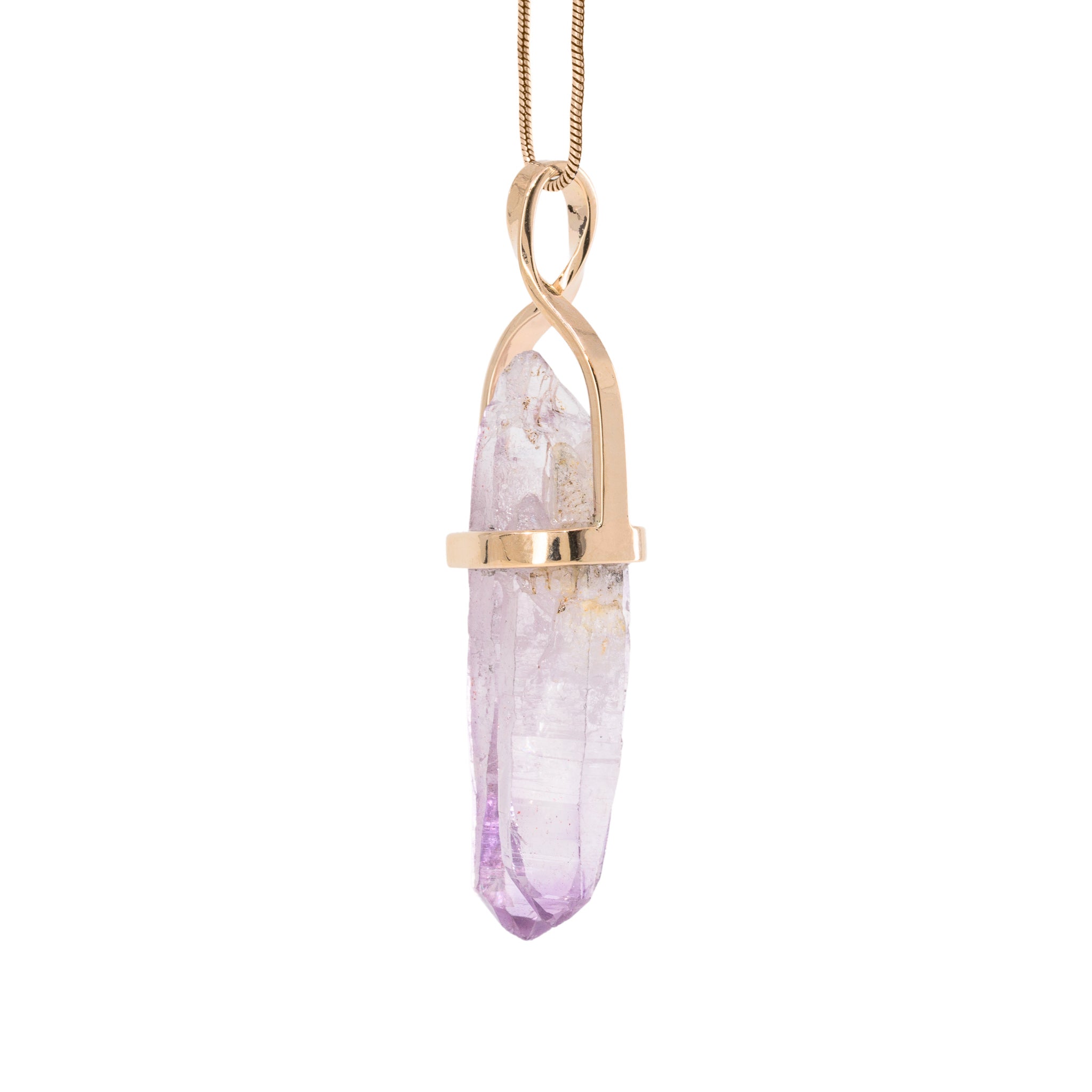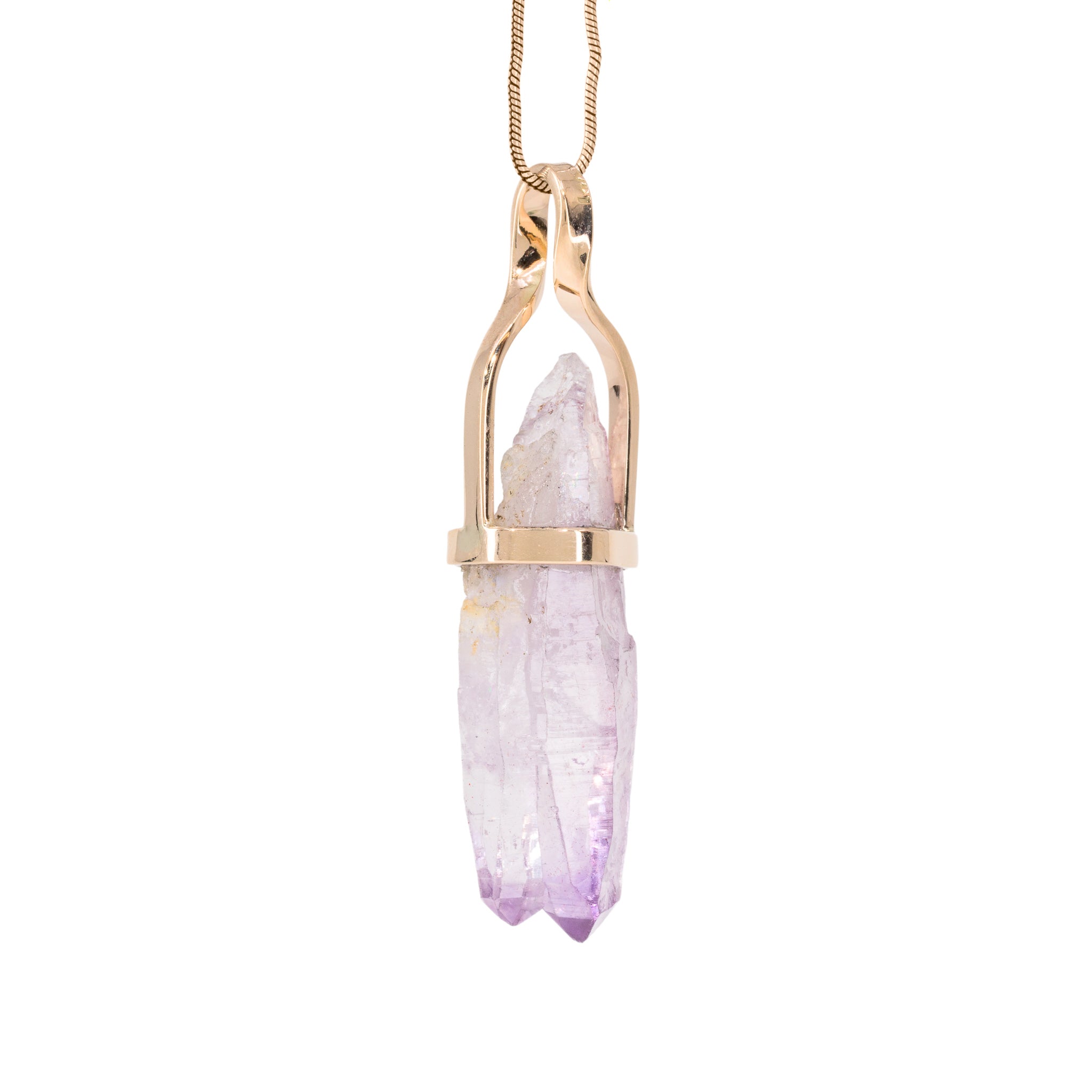 This handcrafted pendant features a rare twin formation of Veracruz Amethyst, celebrated for its exceptional clarity and delicate lavender tone. The naturally elongated crystals display graceful parallel growth, creating an elegant, airy silhouette. Set in warm 14k gold, the pendant highlights the purity and brilliance of this sought-after Mexican amethyst variety, making it a truly standout piece for collectors and jewelry lovers alike.
